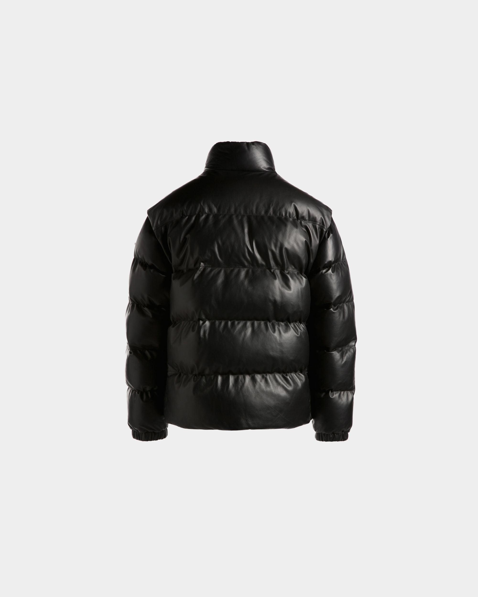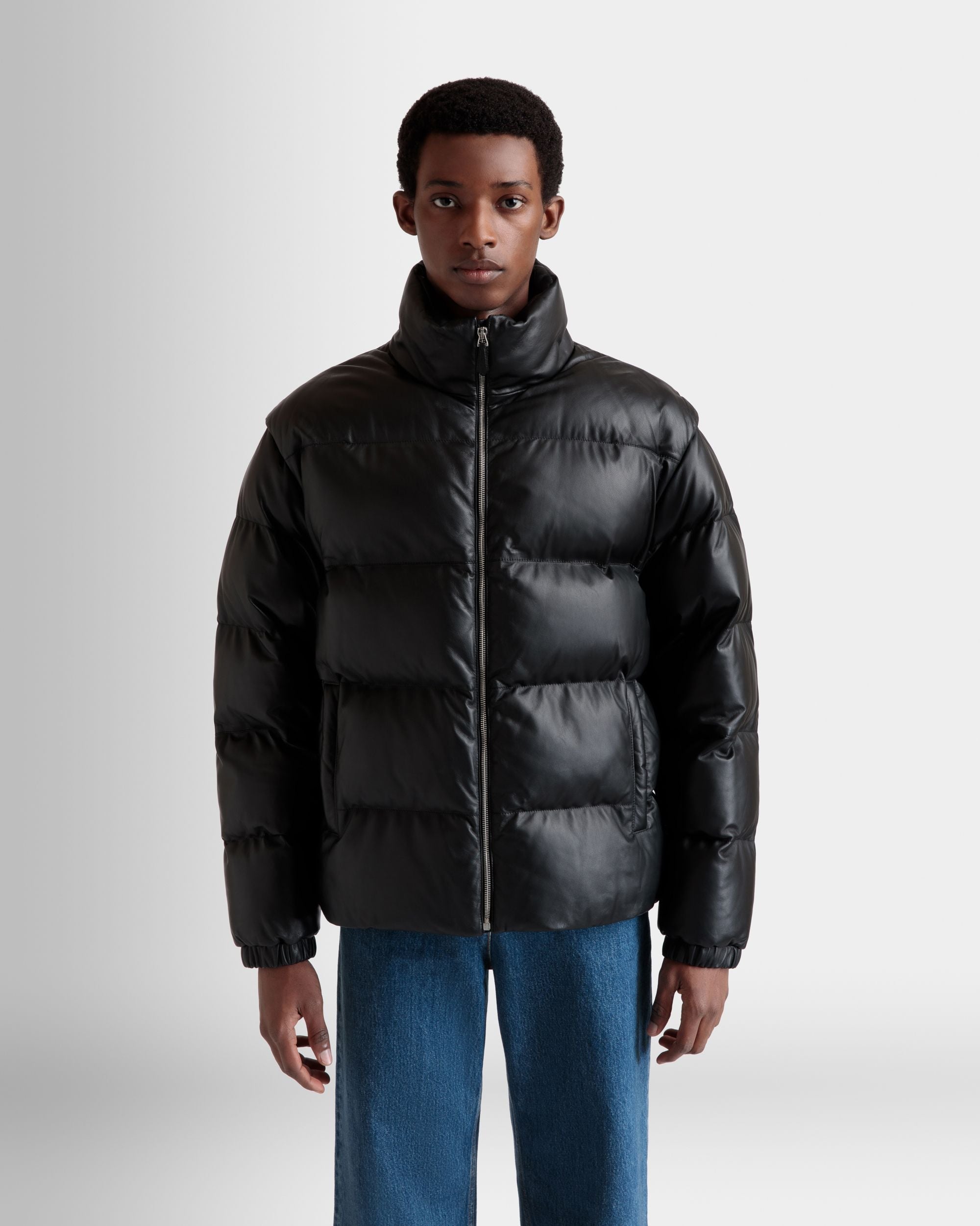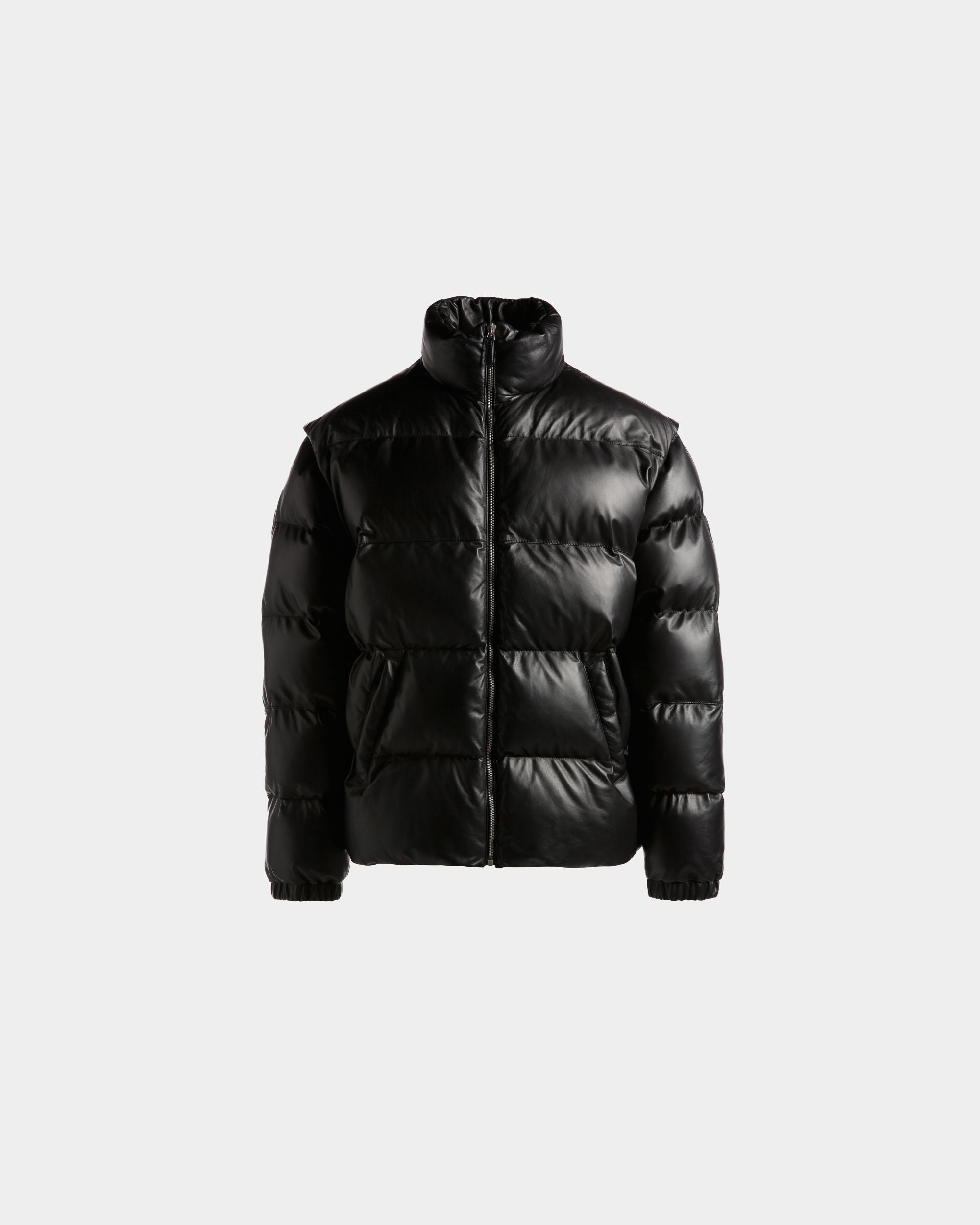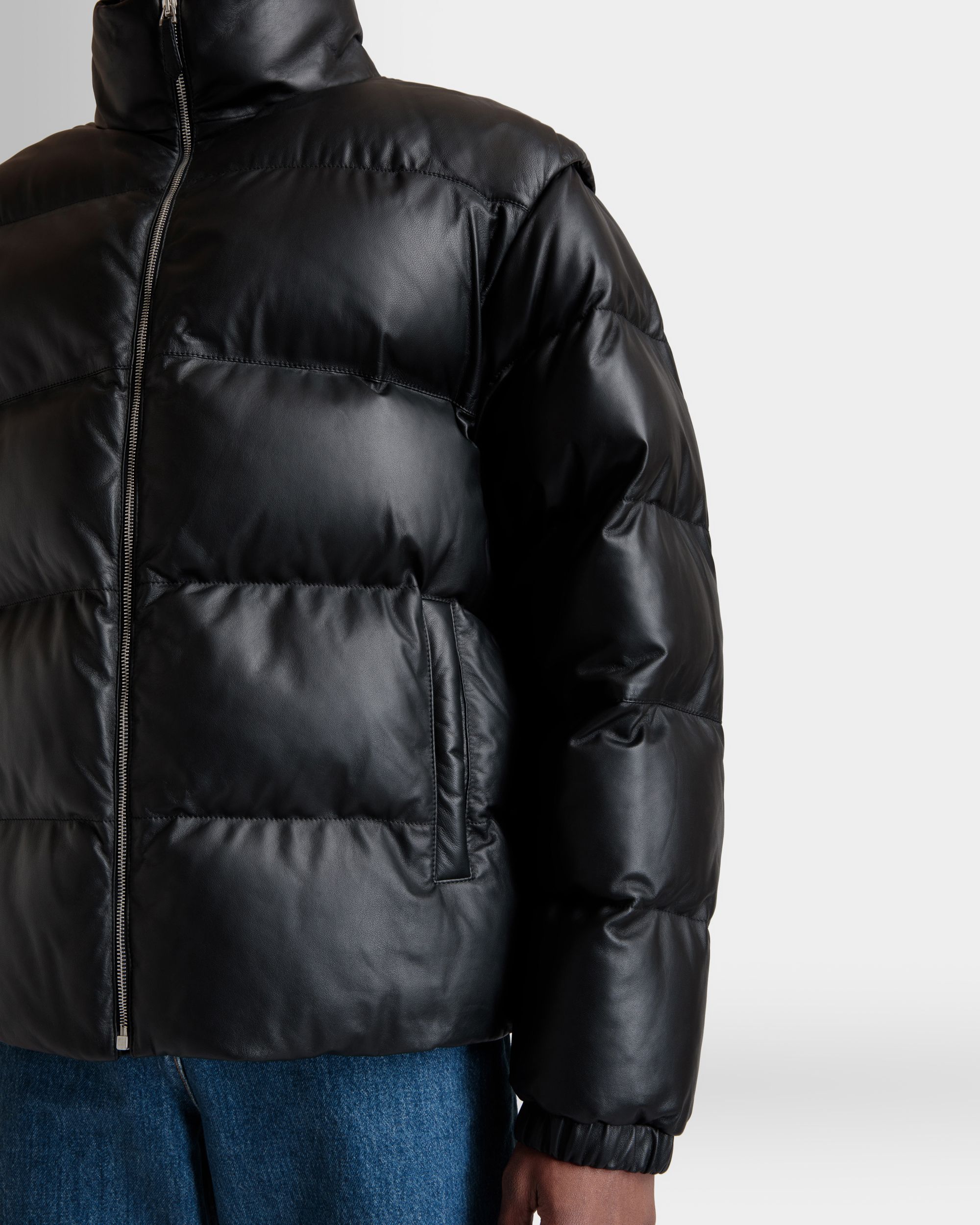 This versatile high-neck 2-in-1 puffer jacket in black leather comes with sleeves that can be detached via zippers to create a warm vest.