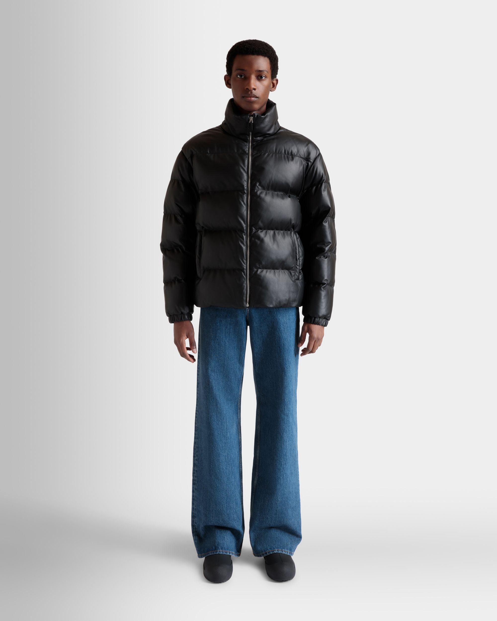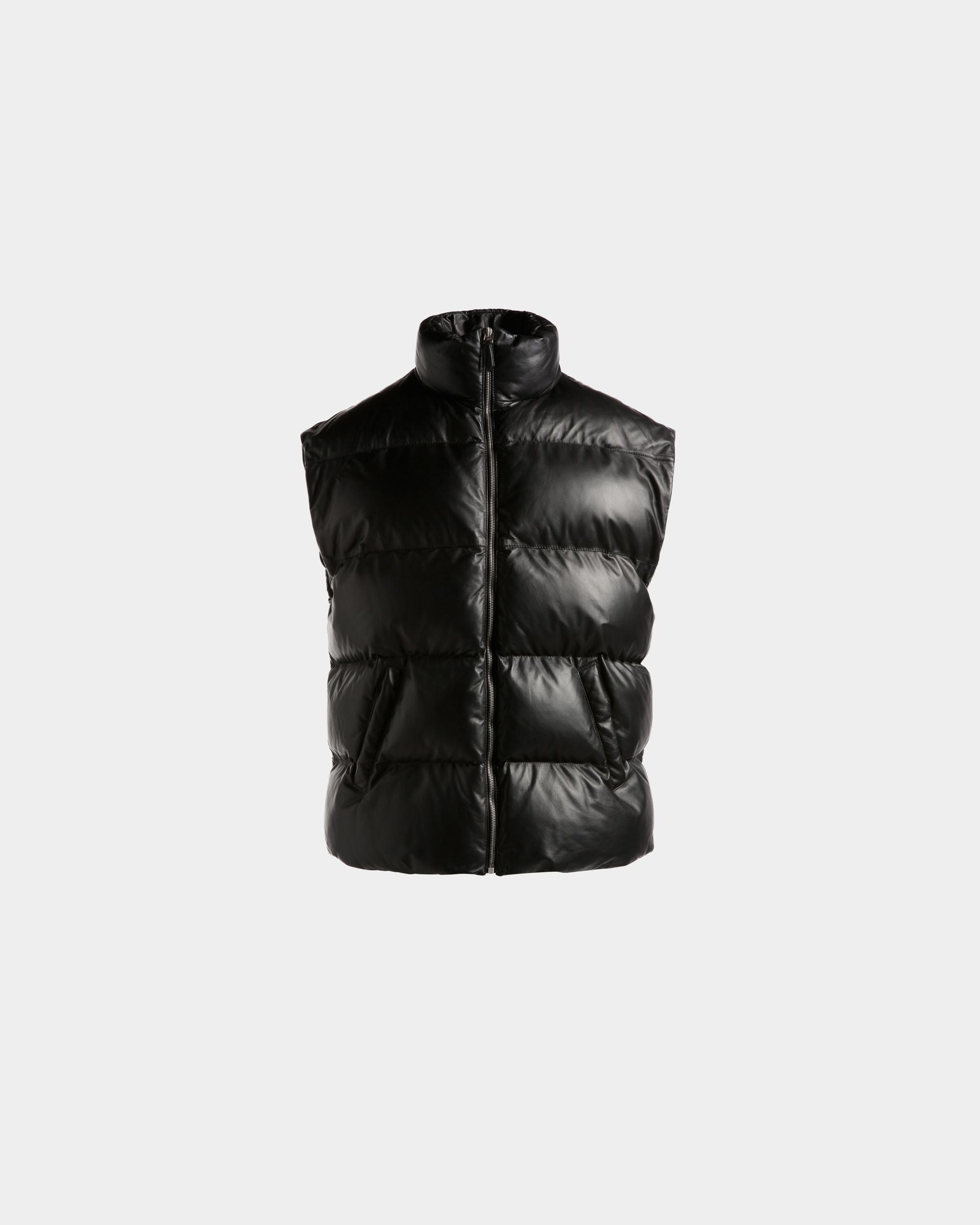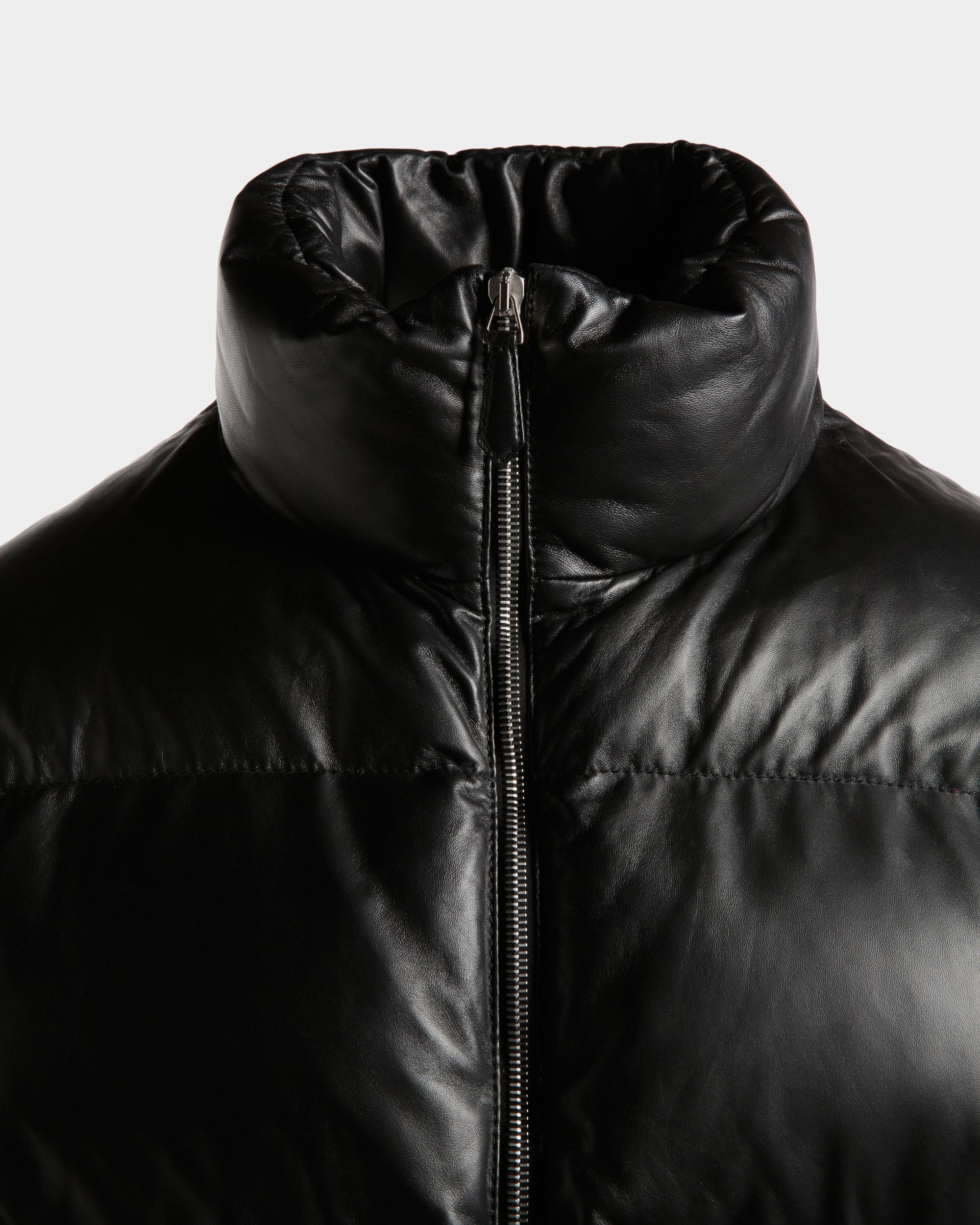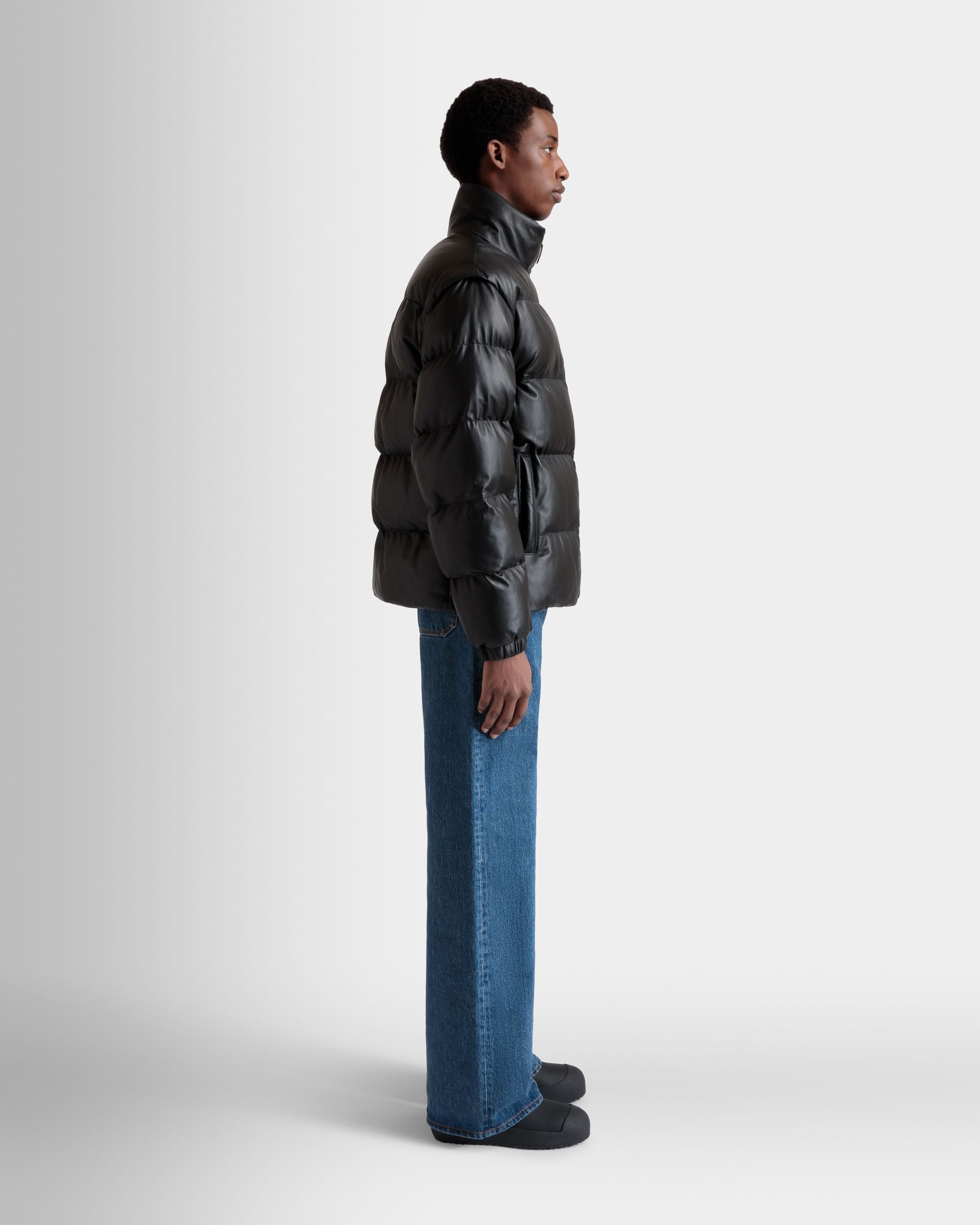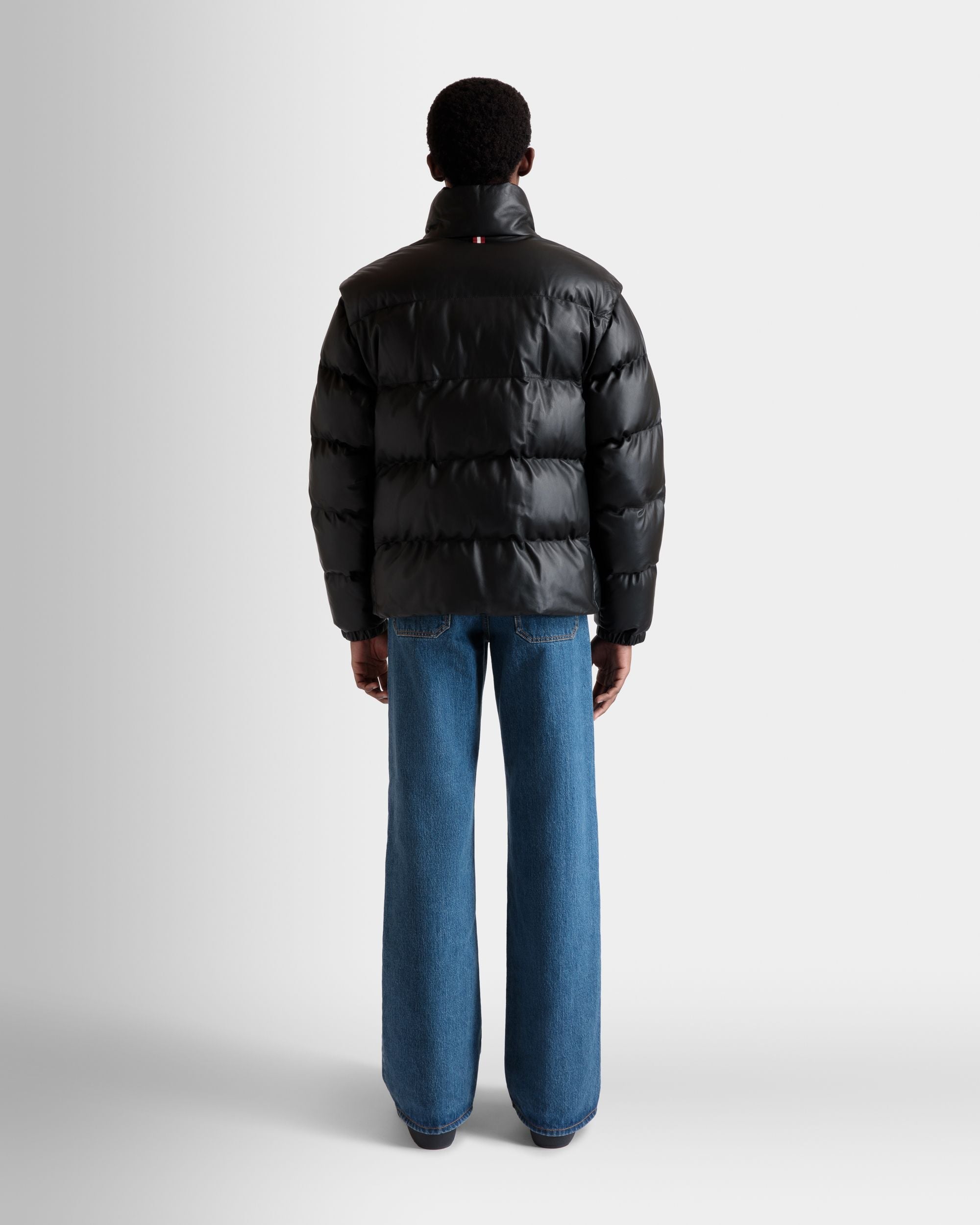 This versatile high-neck 2-in-1 puffer jacket in black leather comes with sleeves that can be detached via zippers to create a warm vest.