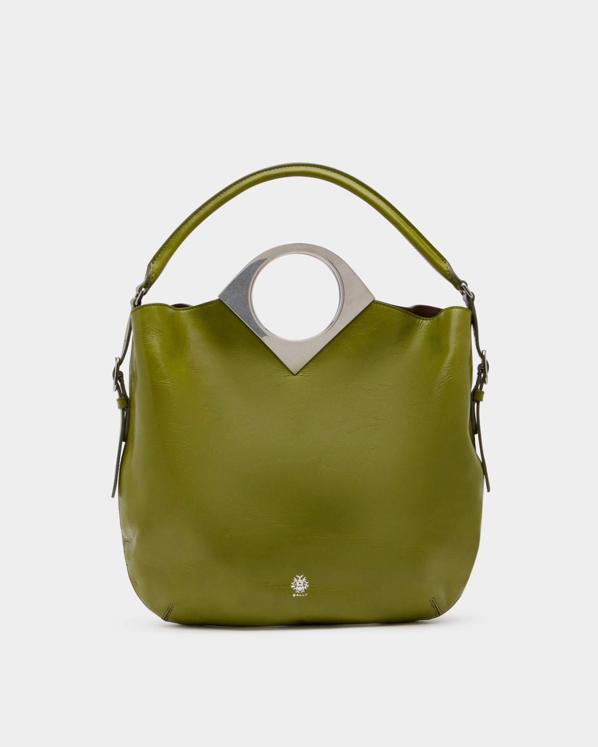 The Anni shoulder bag is crafted from Matcha Green leather into a soft silhouette. A geometric detail in palladium-hue metal decorates the flap closure.