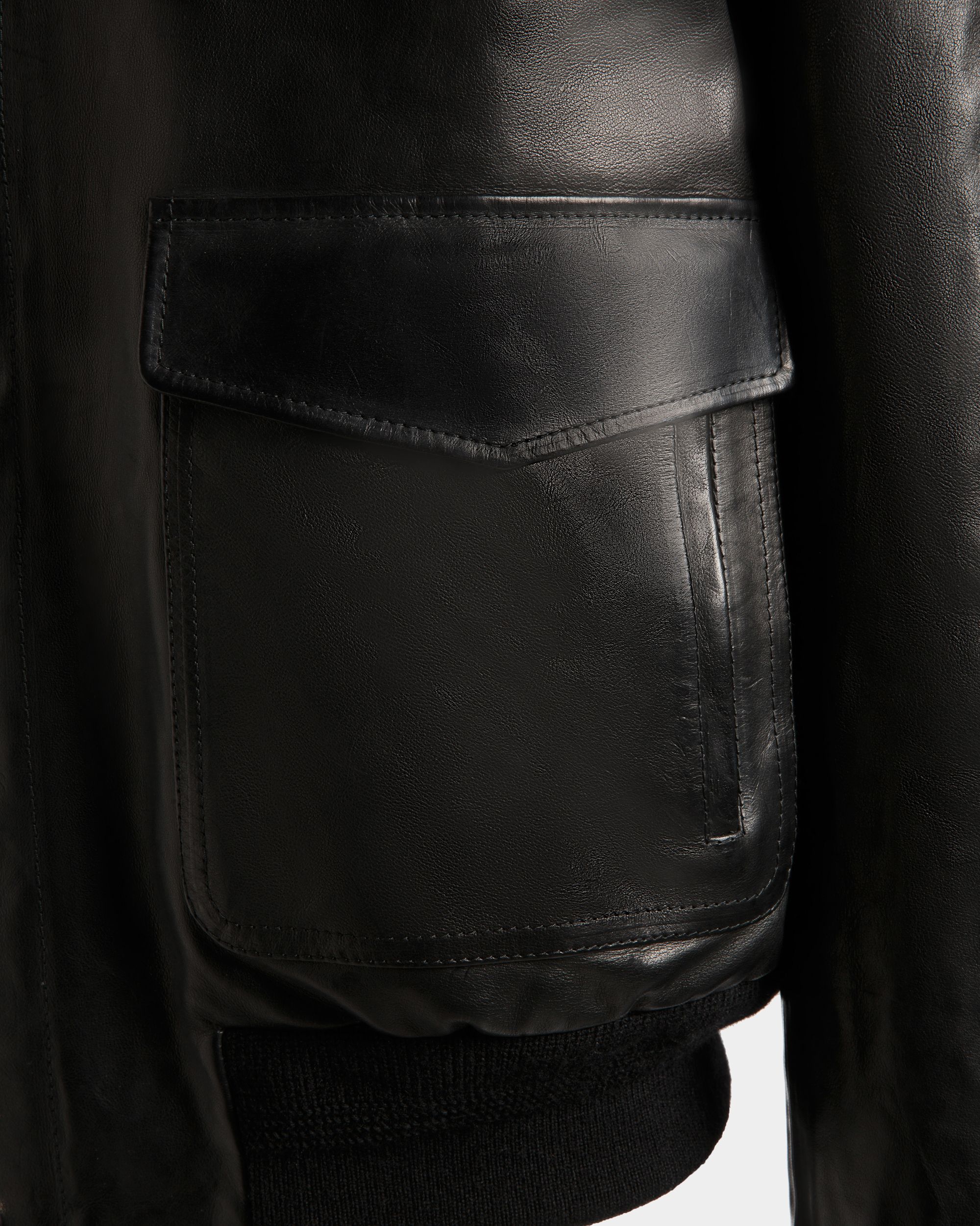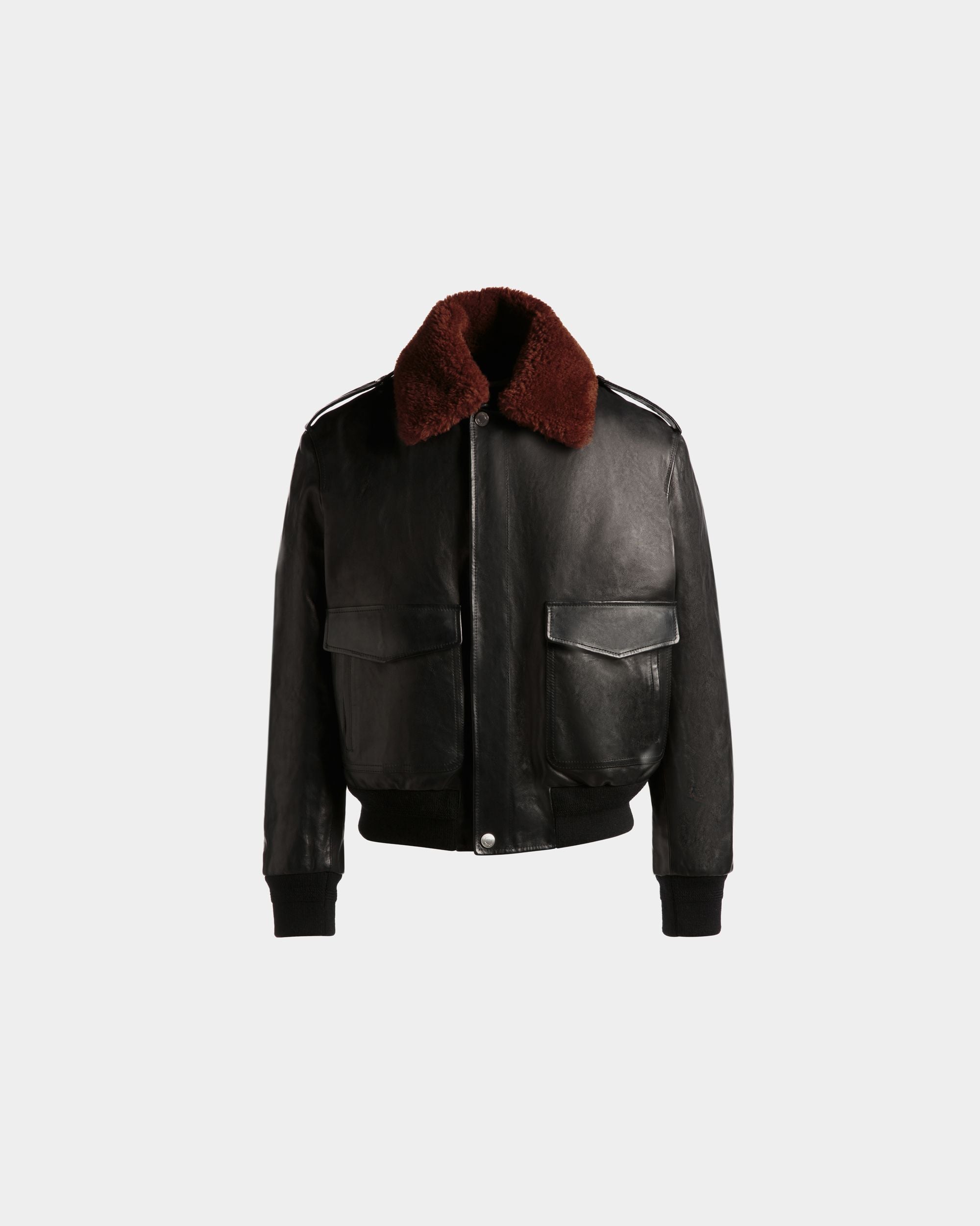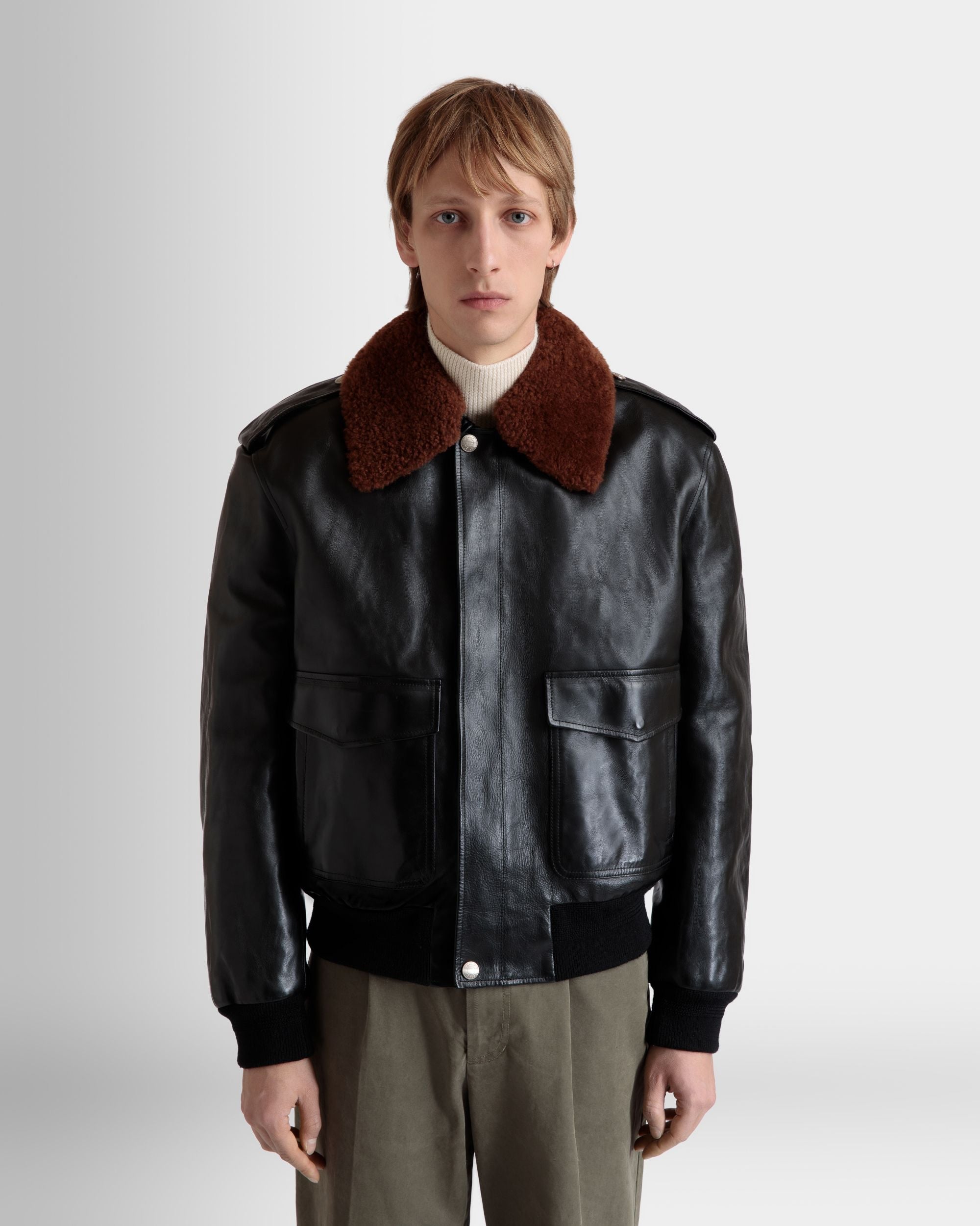 This black aviator jacket in supple leather is trimmed in warm shearling and lined in viscose fabric. Ample flap pockets with snaps trim the front.