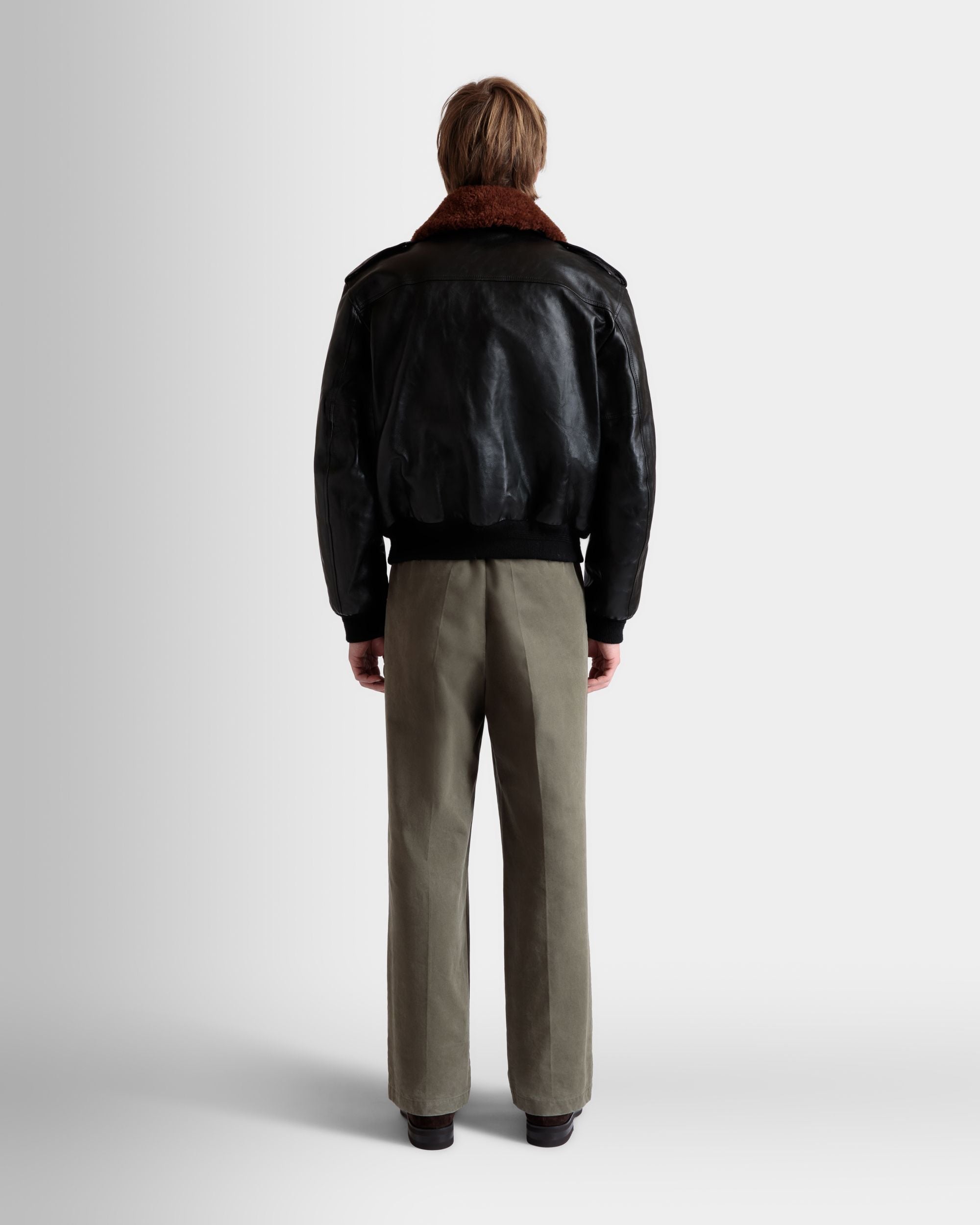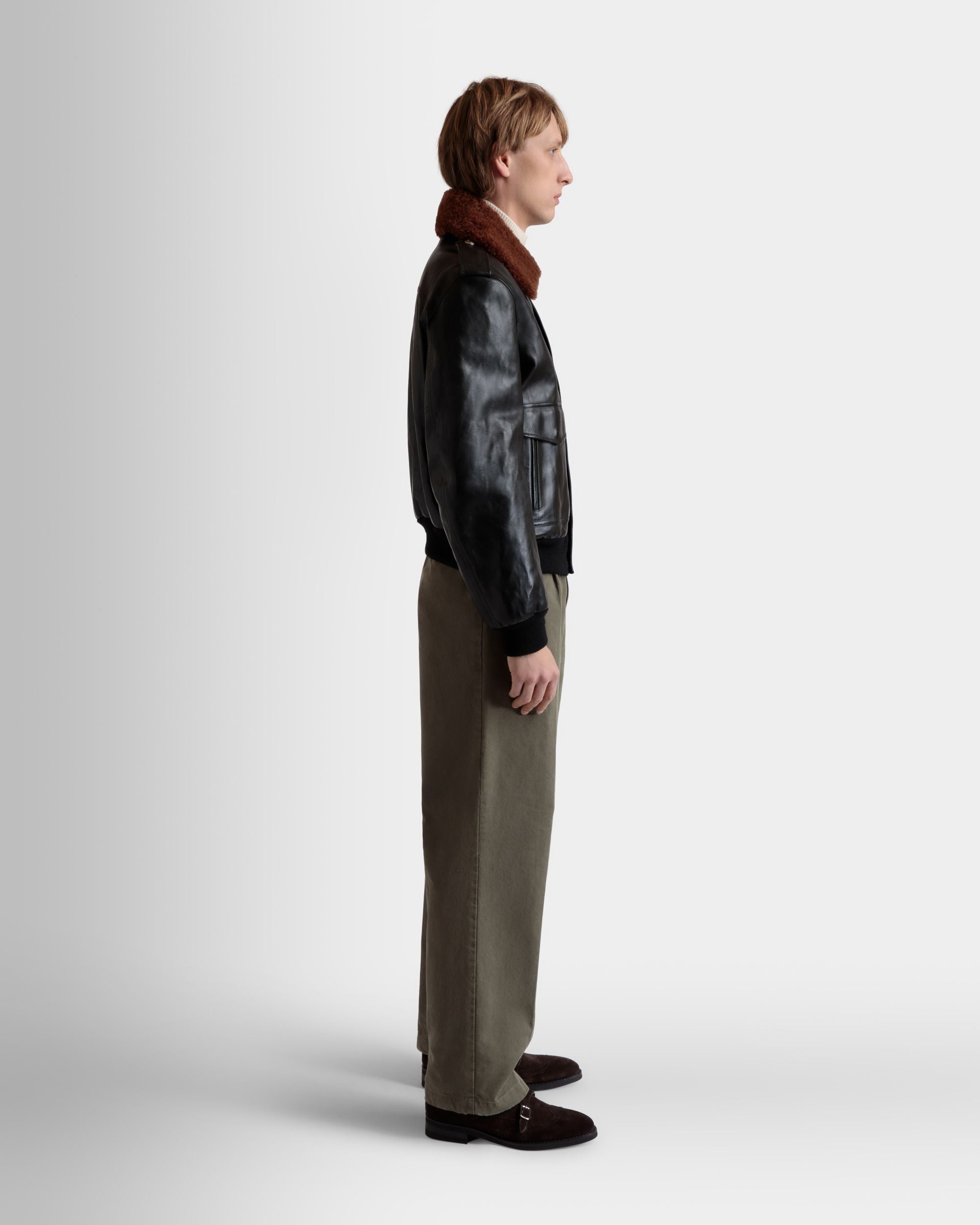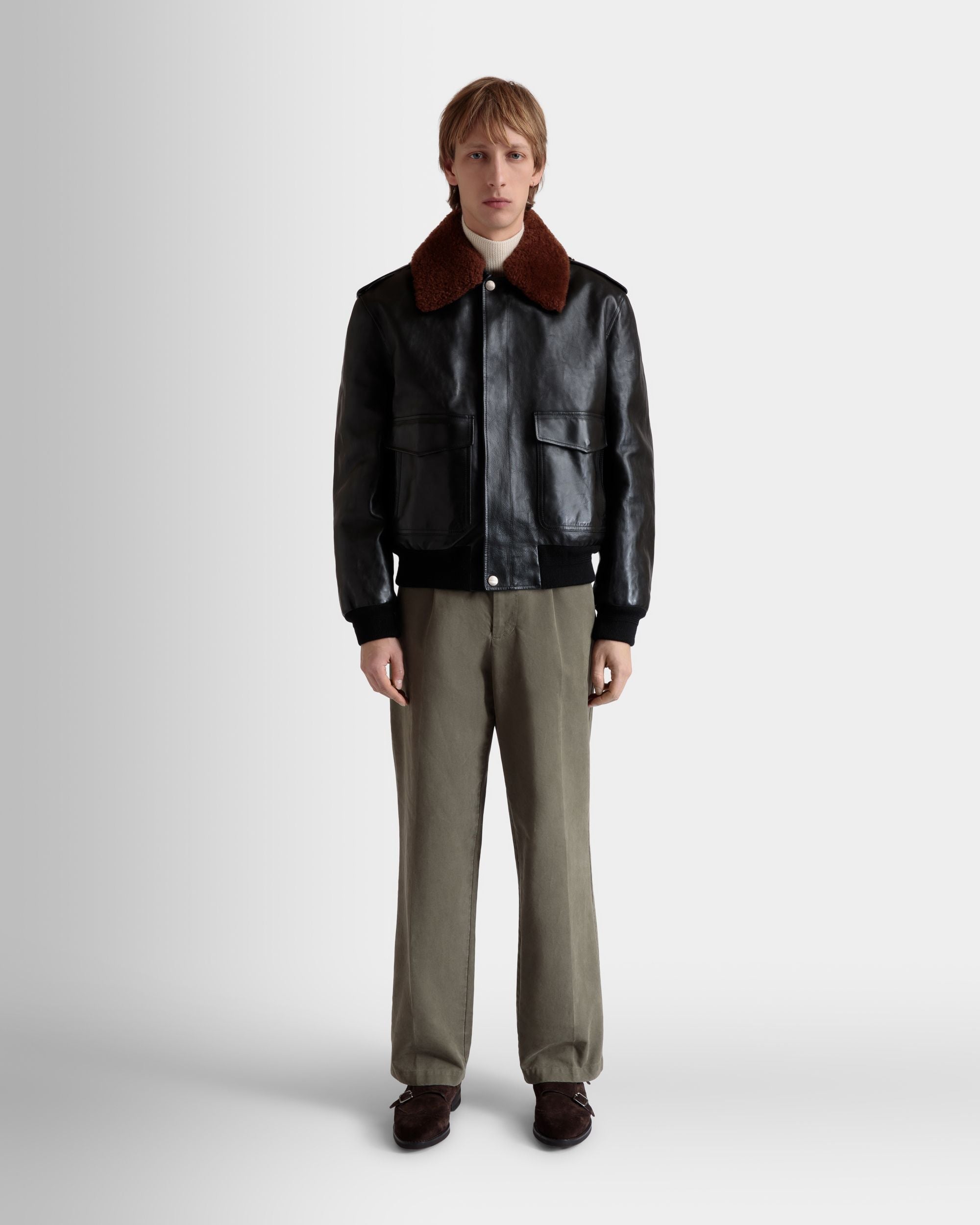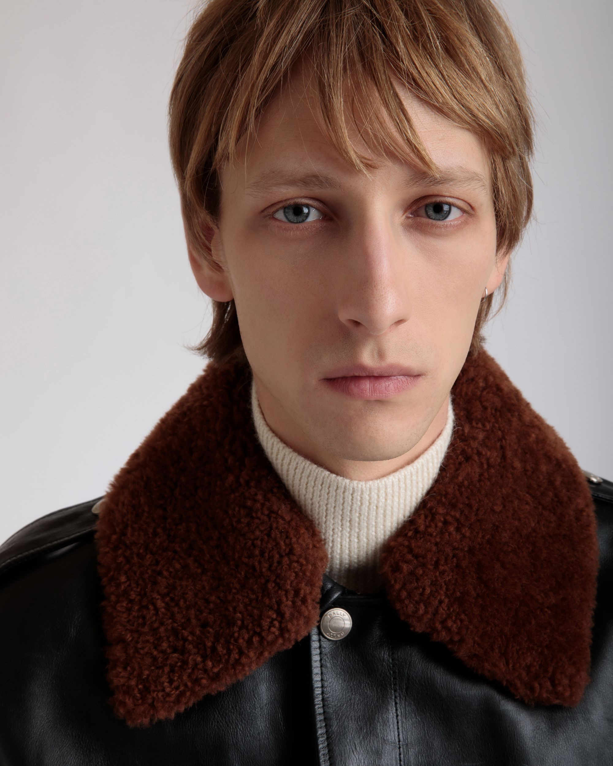 This black aviator jacket in supple leather is trimmed in warm shearling and lined in viscose fabric. Ample flap pockets with snaps trim the front.