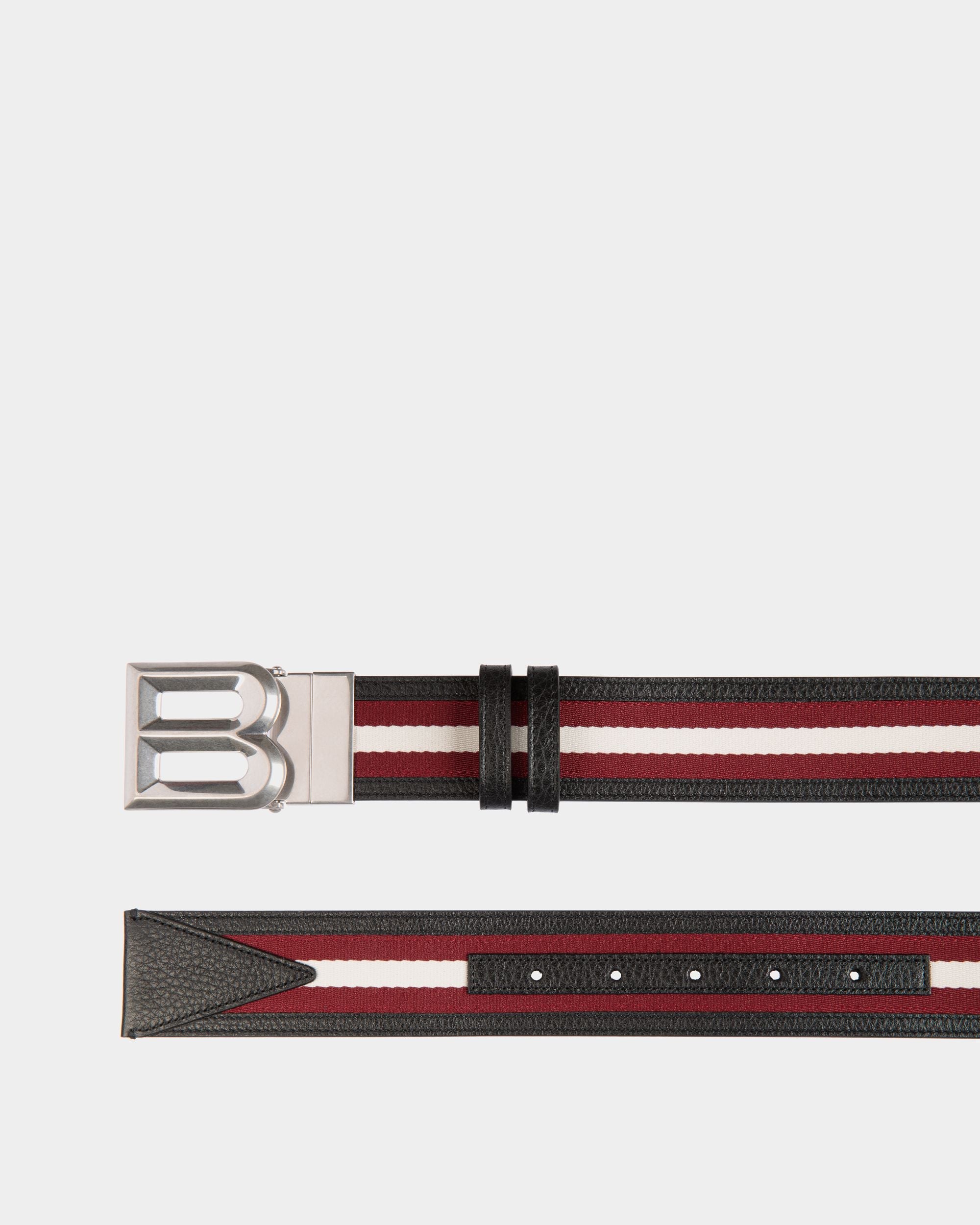 The B Bold 40 cm belt is crafted in vibrant red and white fabric and black leather. Its reversible design allows for versatile styling options. making it a must-have accessory.