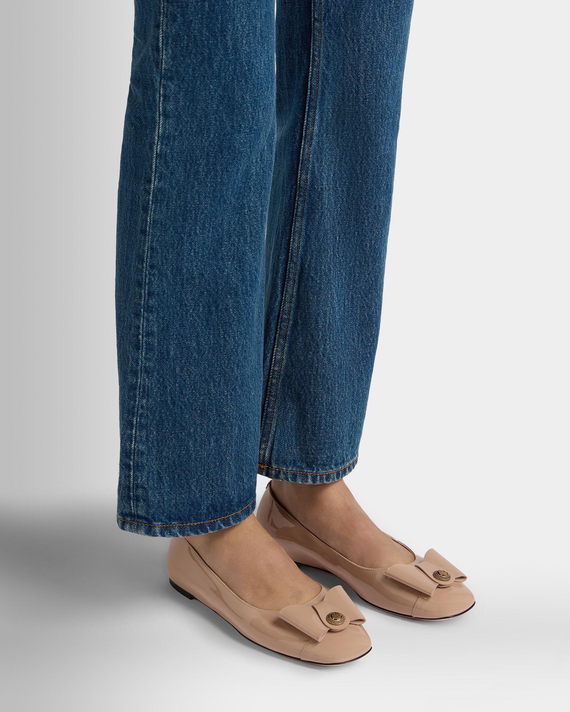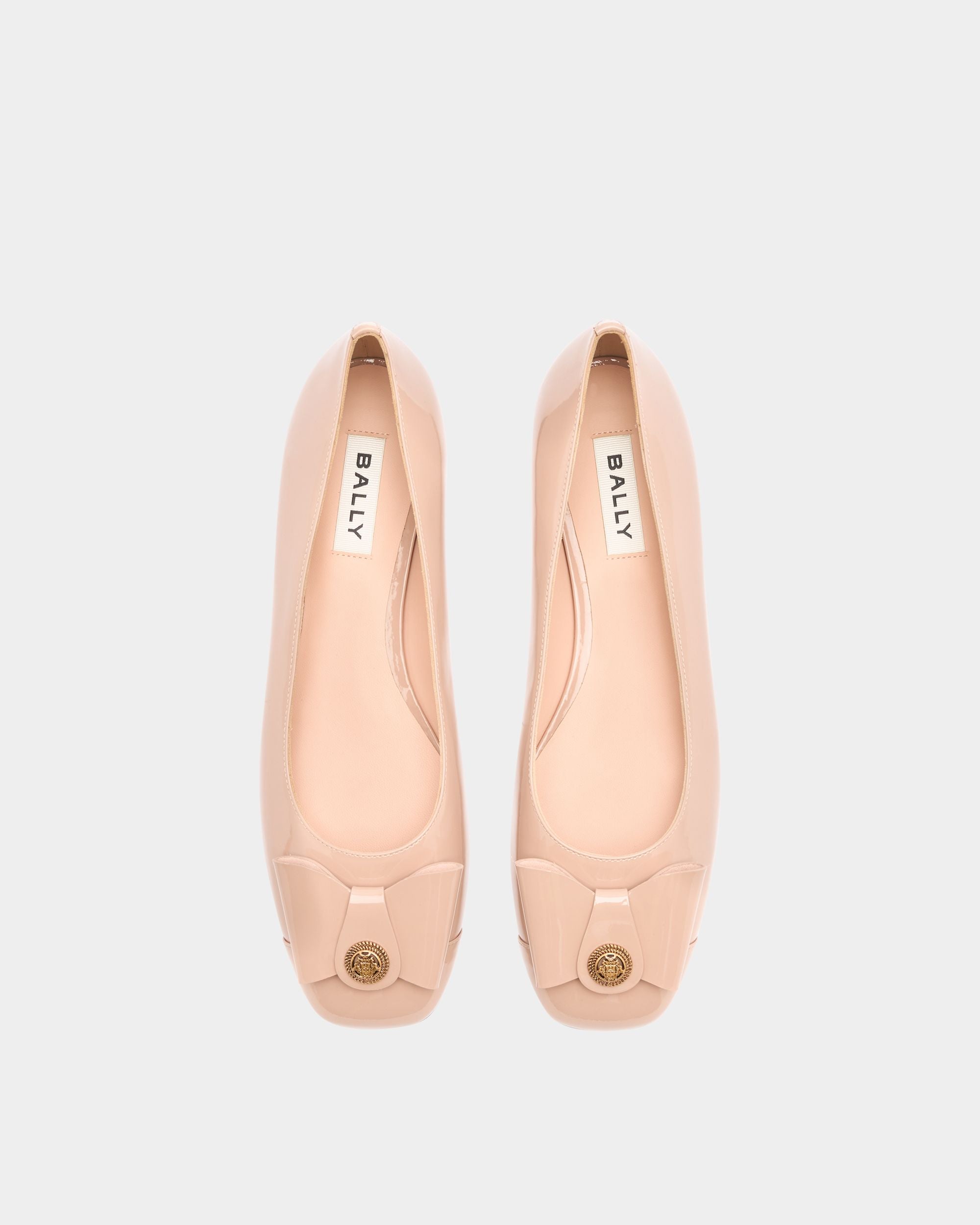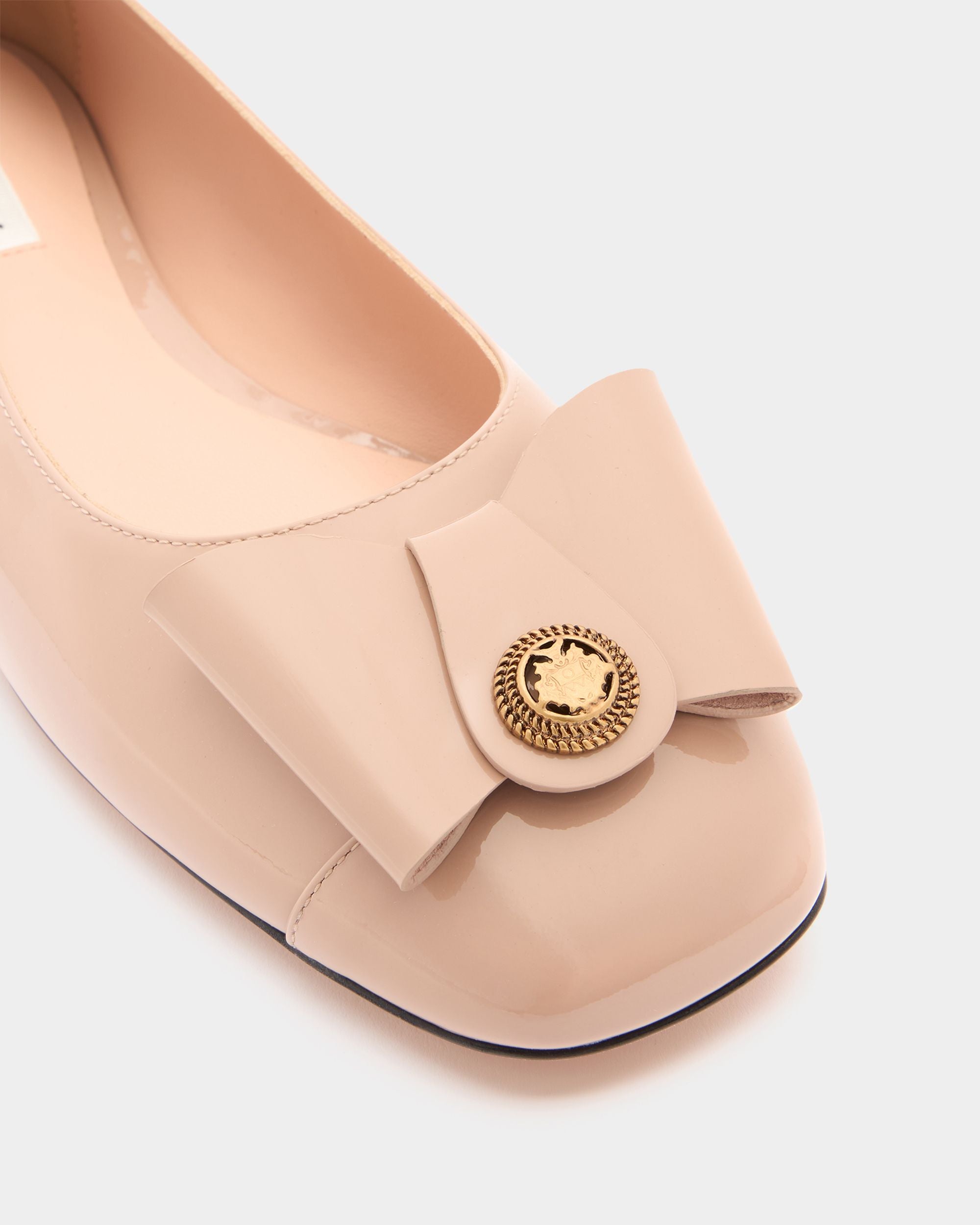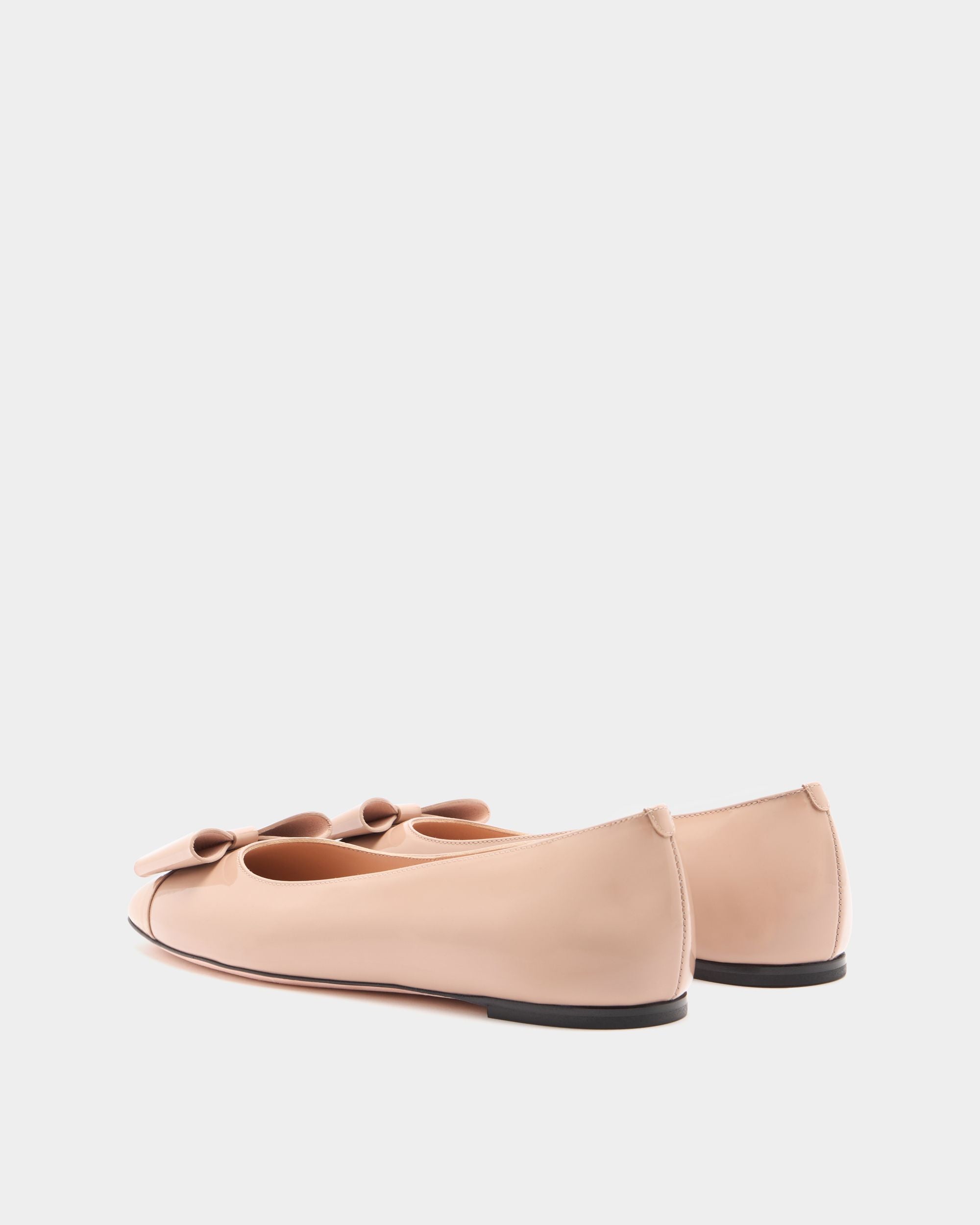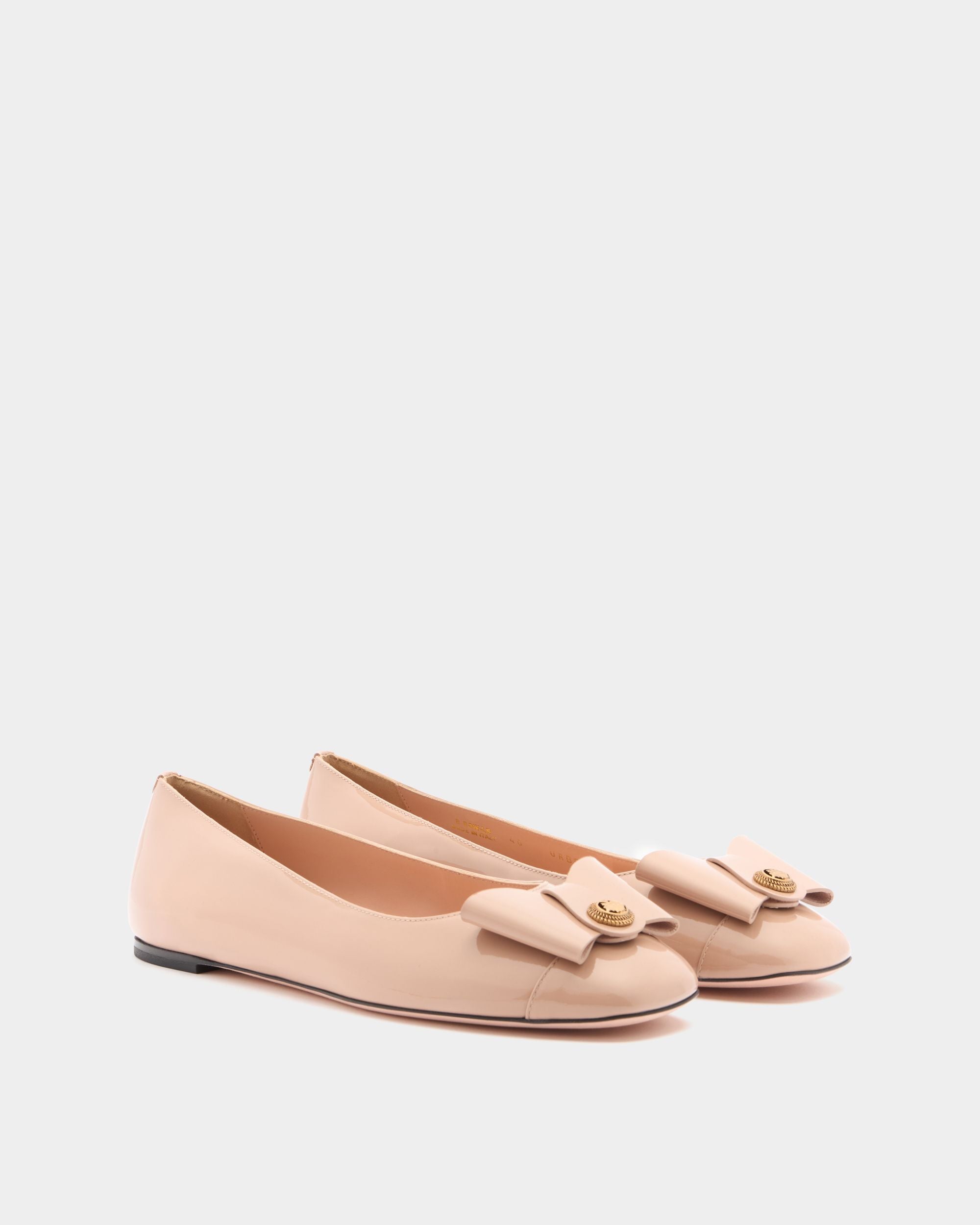 This beige patent leather flat sees a classic ballet design embellished by a B-Bow. a detail inspired by the Bally archives.