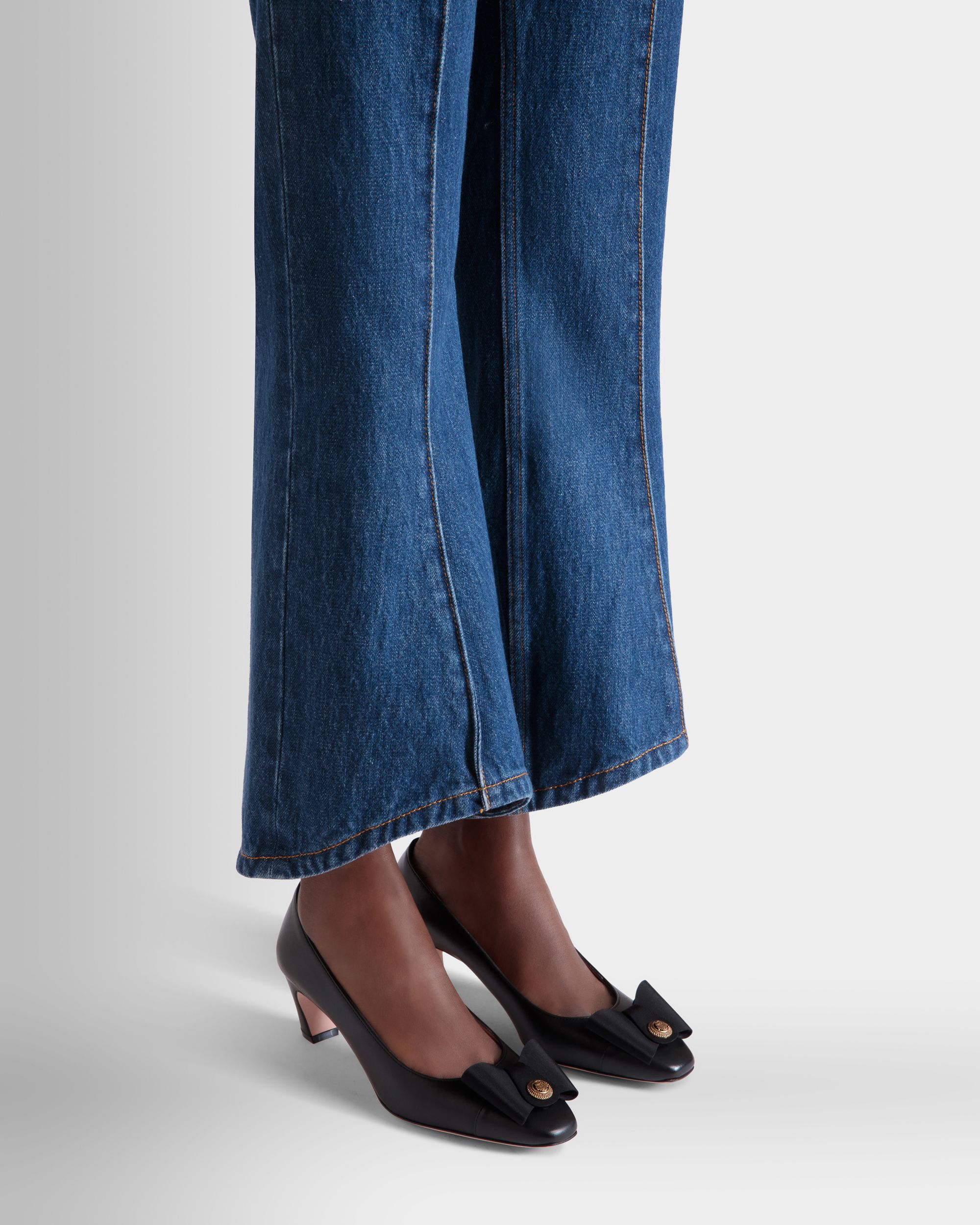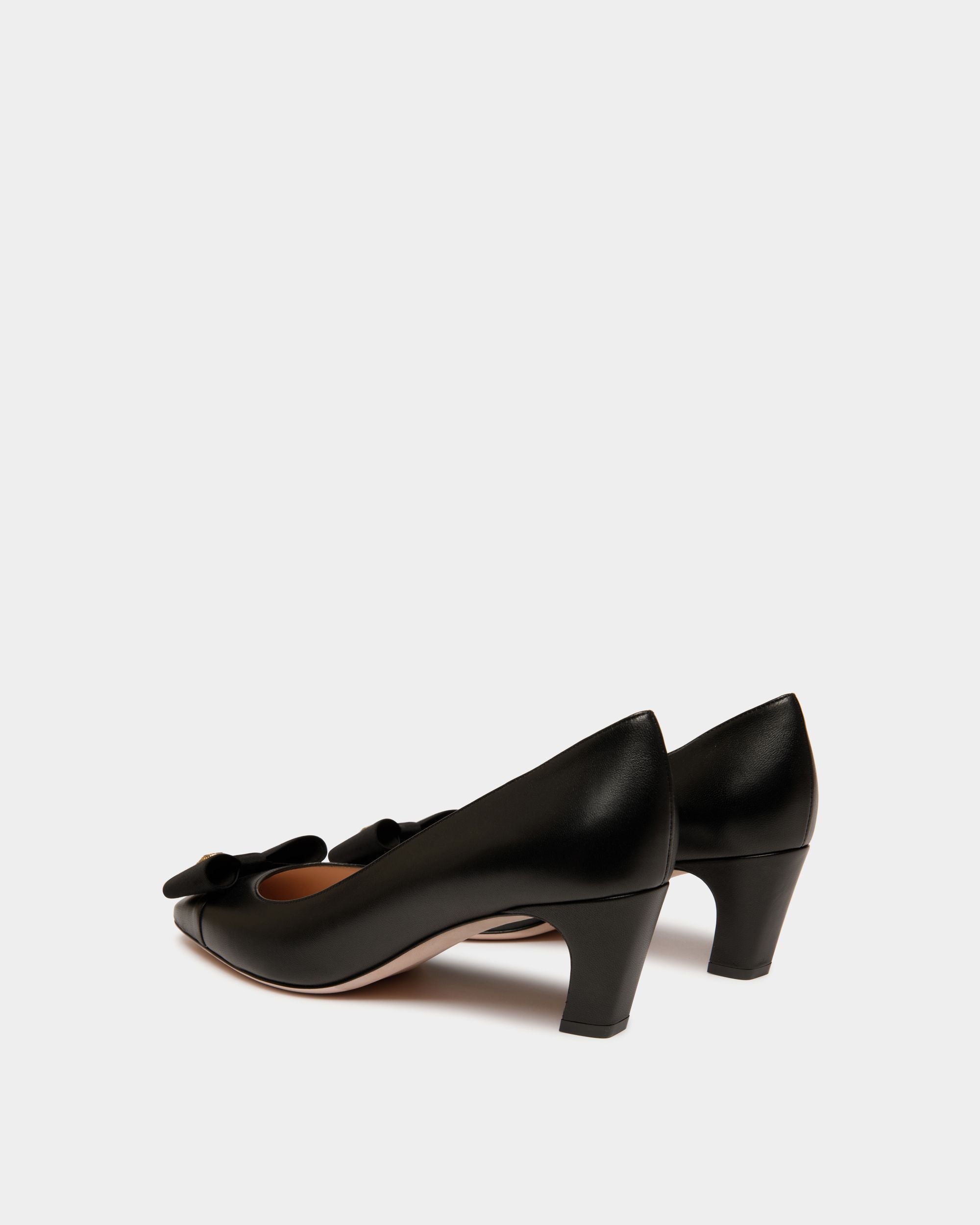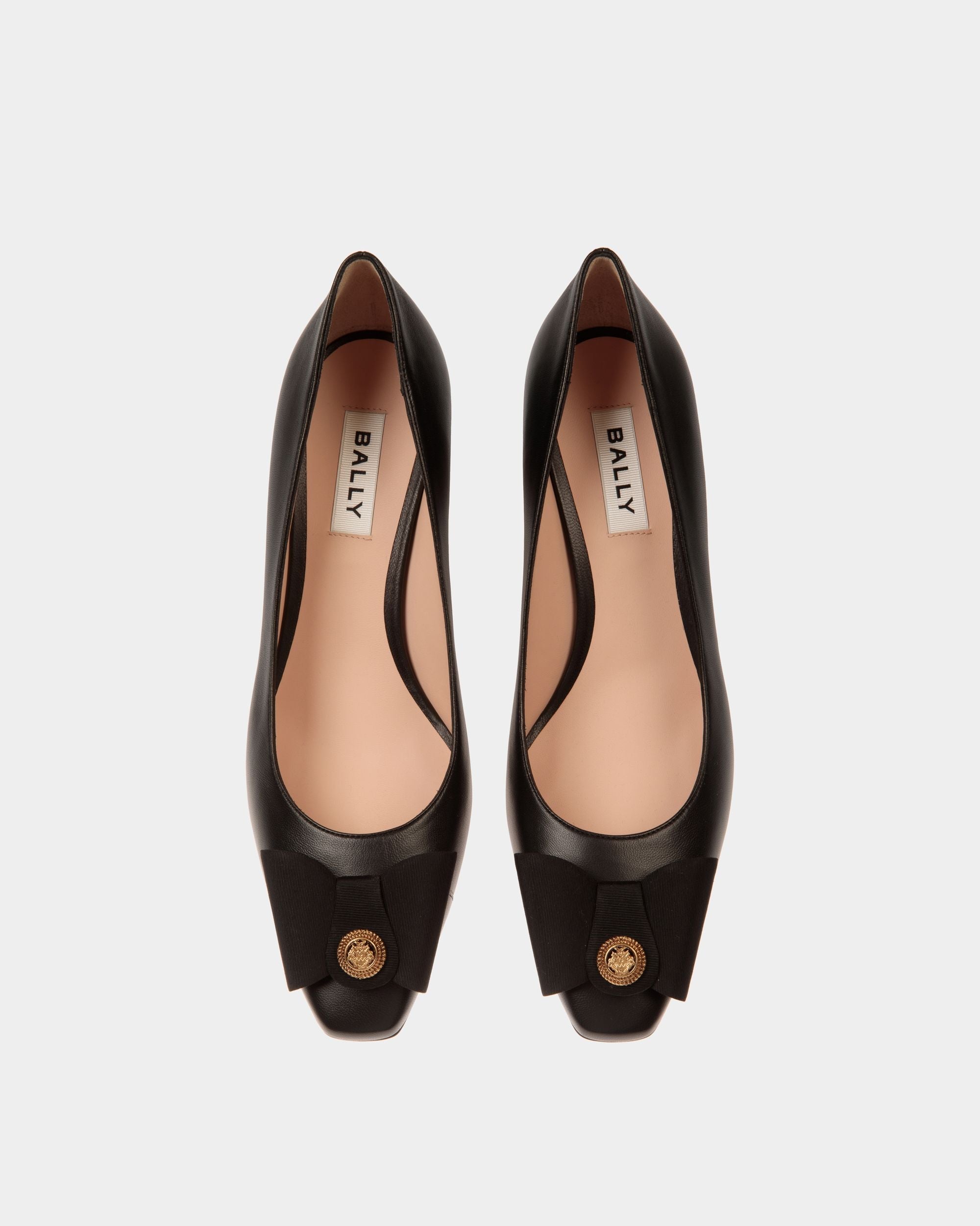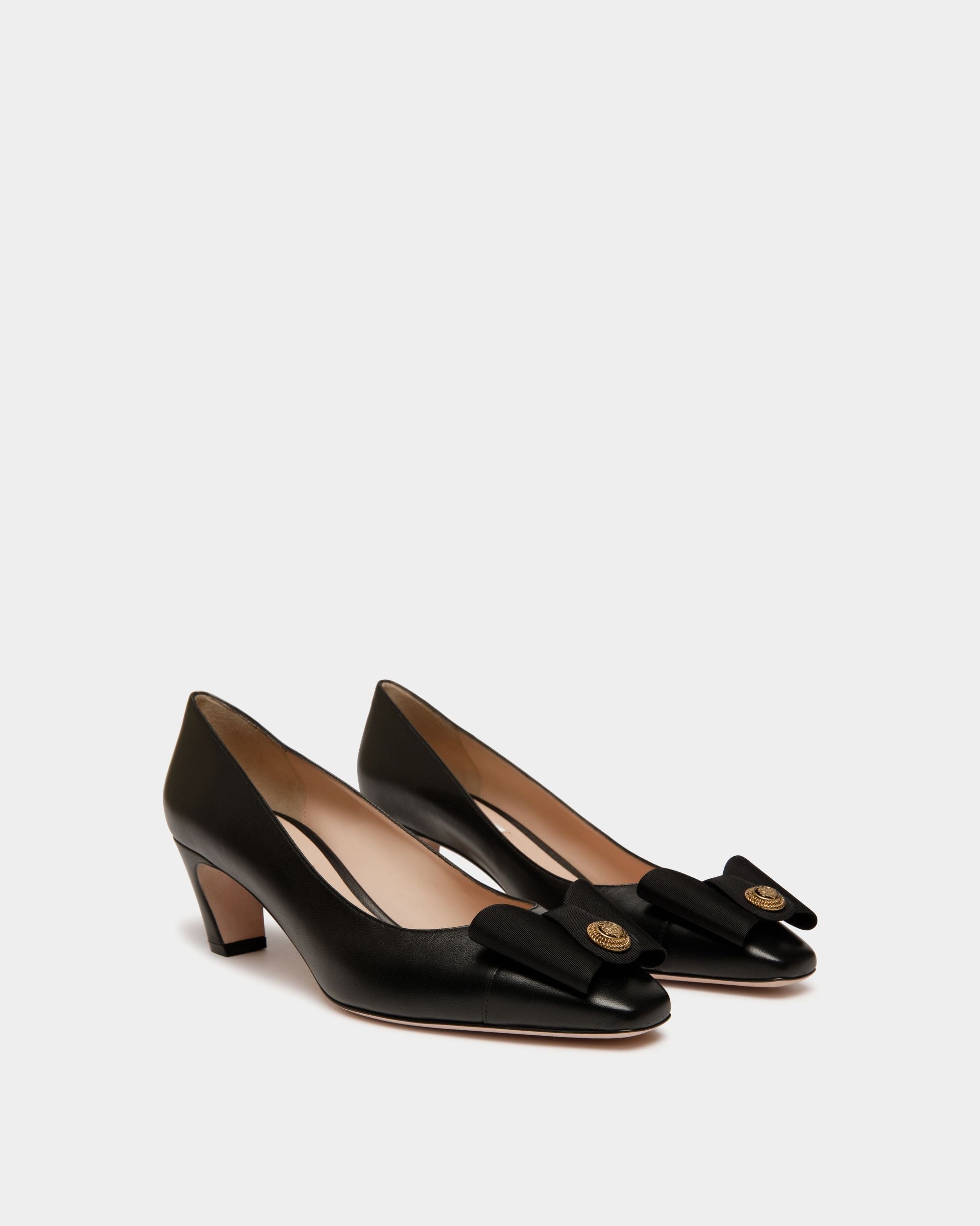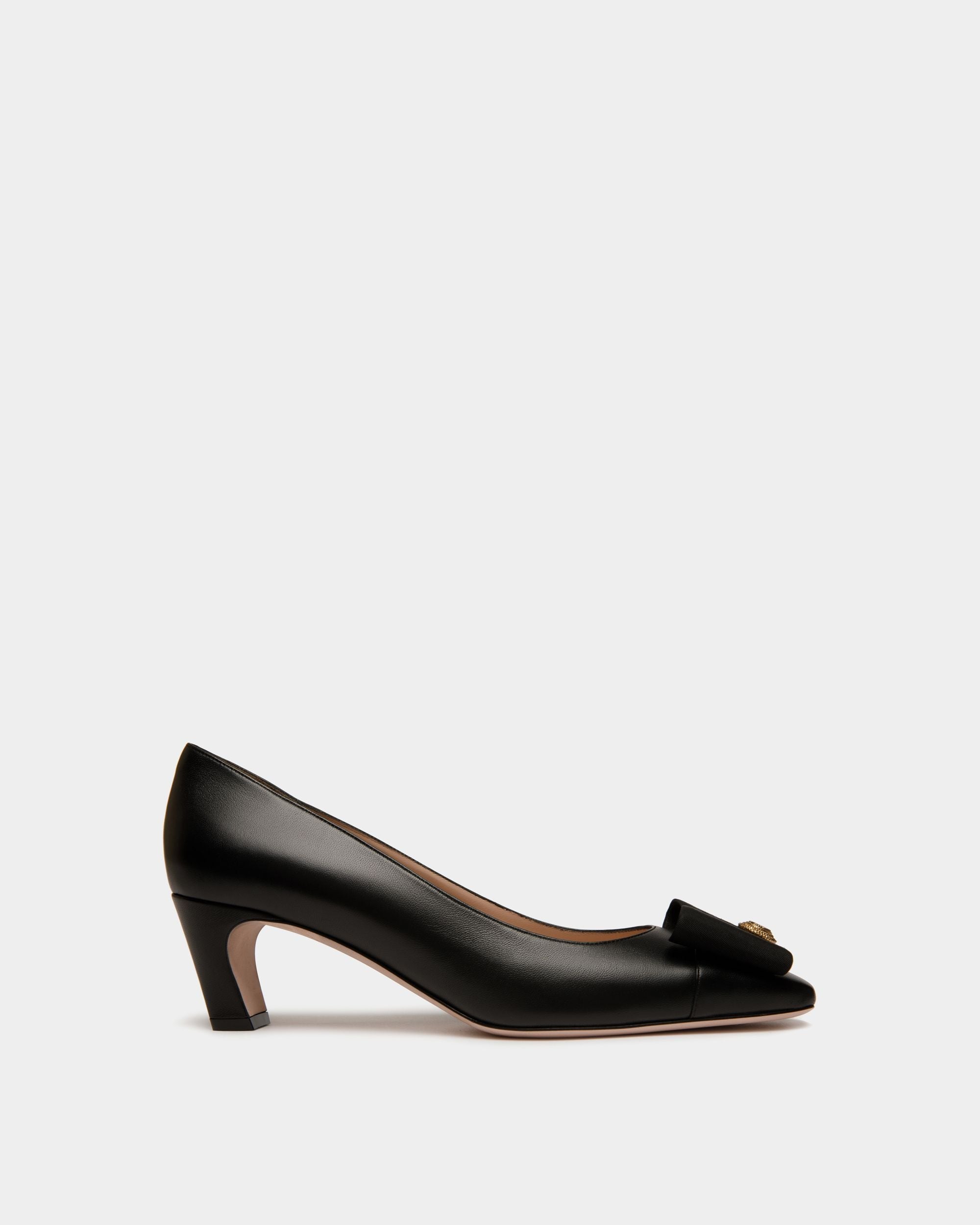 The classic all-black silhouette of this leather pump is finished with an iconic bow from the Bally archives. refreshed with a Crest signifier at the center.