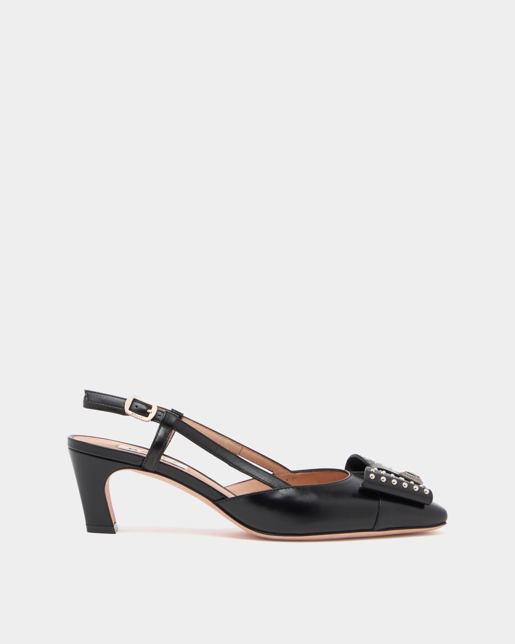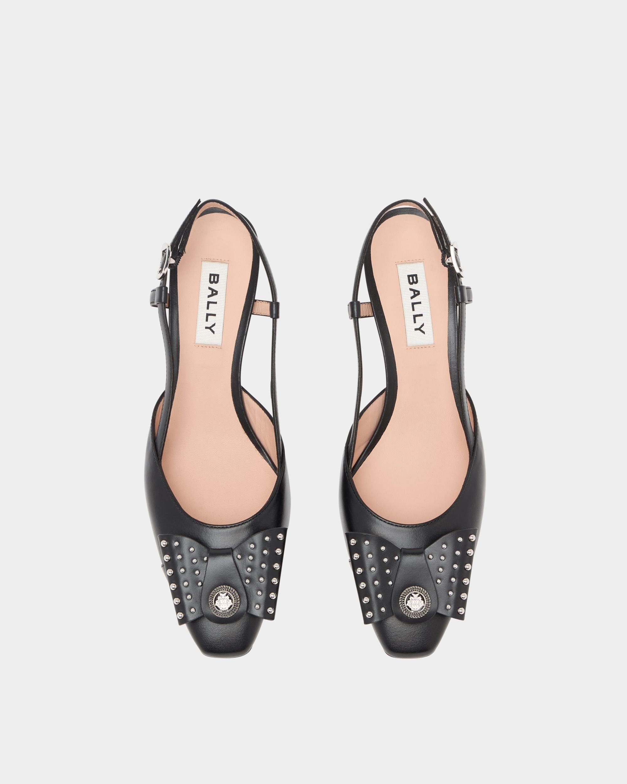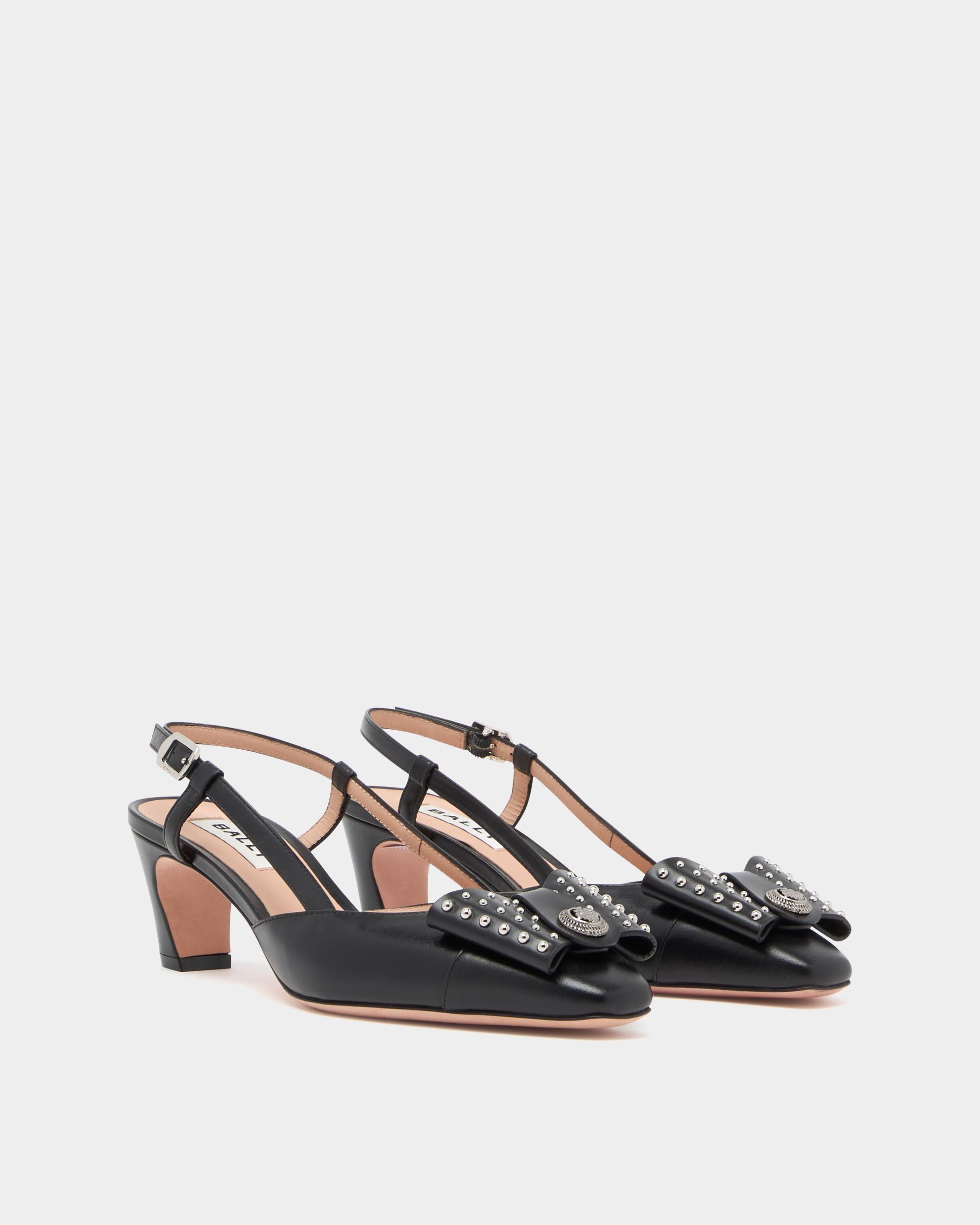 In black leather. this B-Bow slingback was inspired by a 1989 design from the Bally archives. The delicate square toe is finished by a large grosgrain bow with metal studs and a Bally Crest in metal at the center.