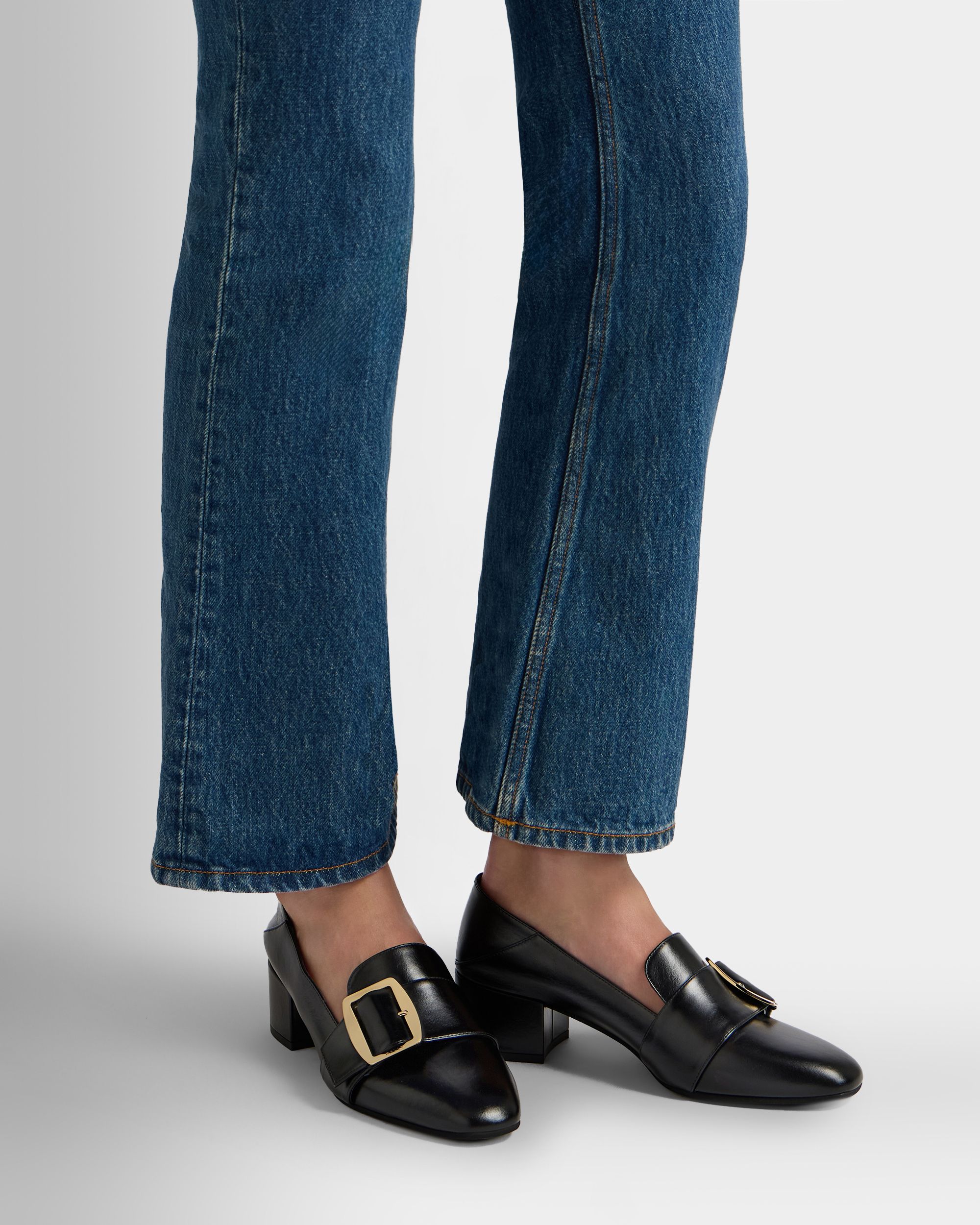 This Bally Boucle pump in black leather is characterized by the large buckle at the front. a reinterpretation of an iconic Bally detail from the 1920s. To the back. the heel folds down for use as a mule.