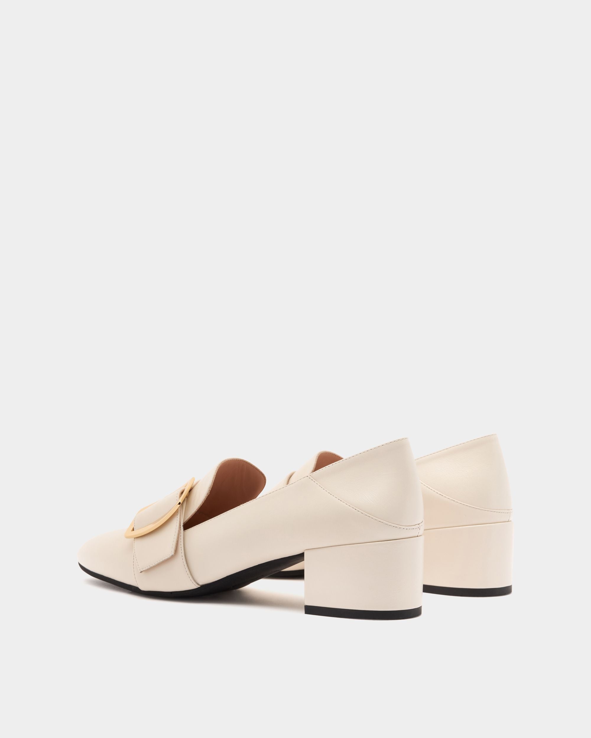 This Bally Boucle pump in Ivory leather is characterized by the large buckle at the front. a reinterpretation of an iconic Bally detail from the 1920s. To the back. the heel folds down for use as a mule.