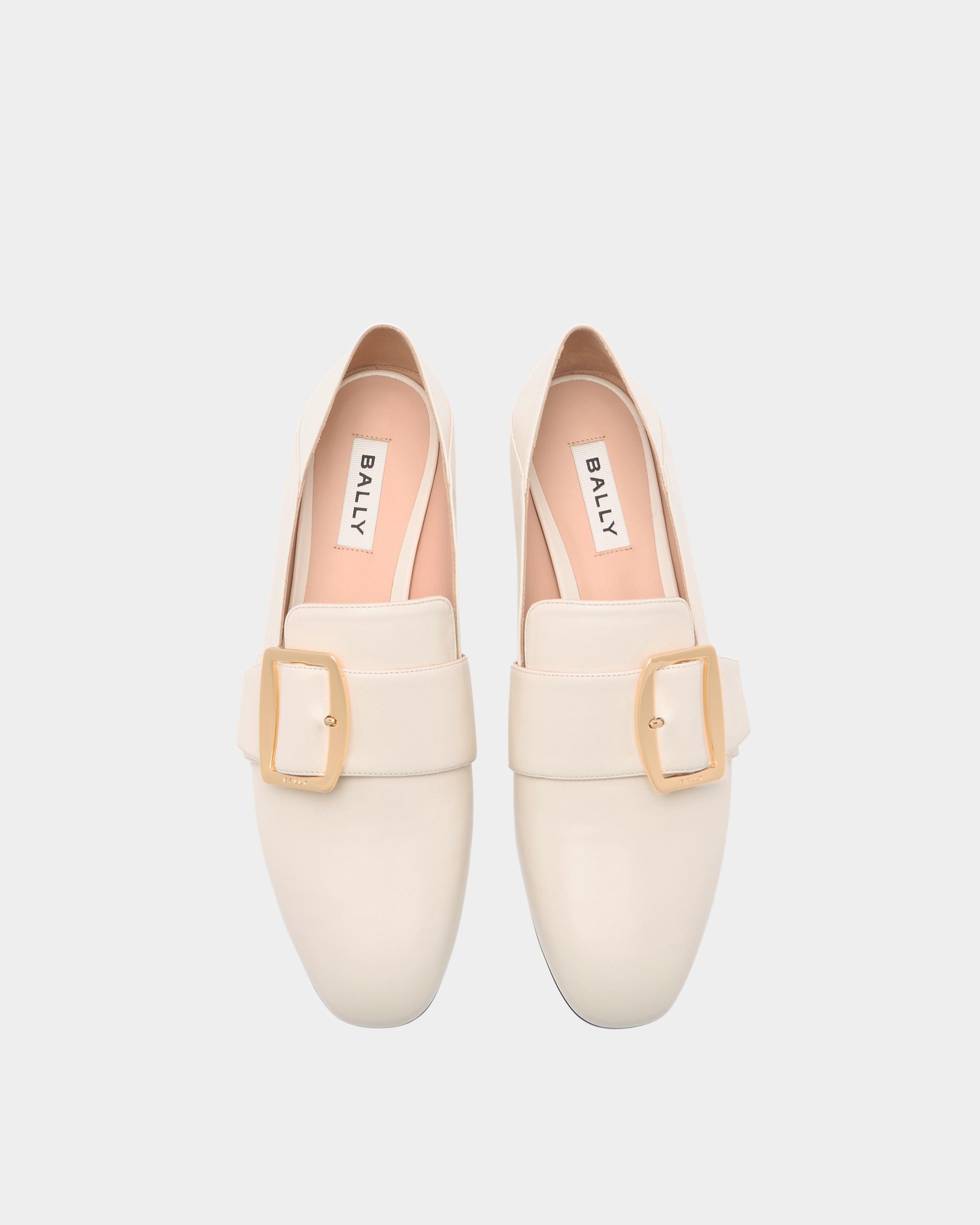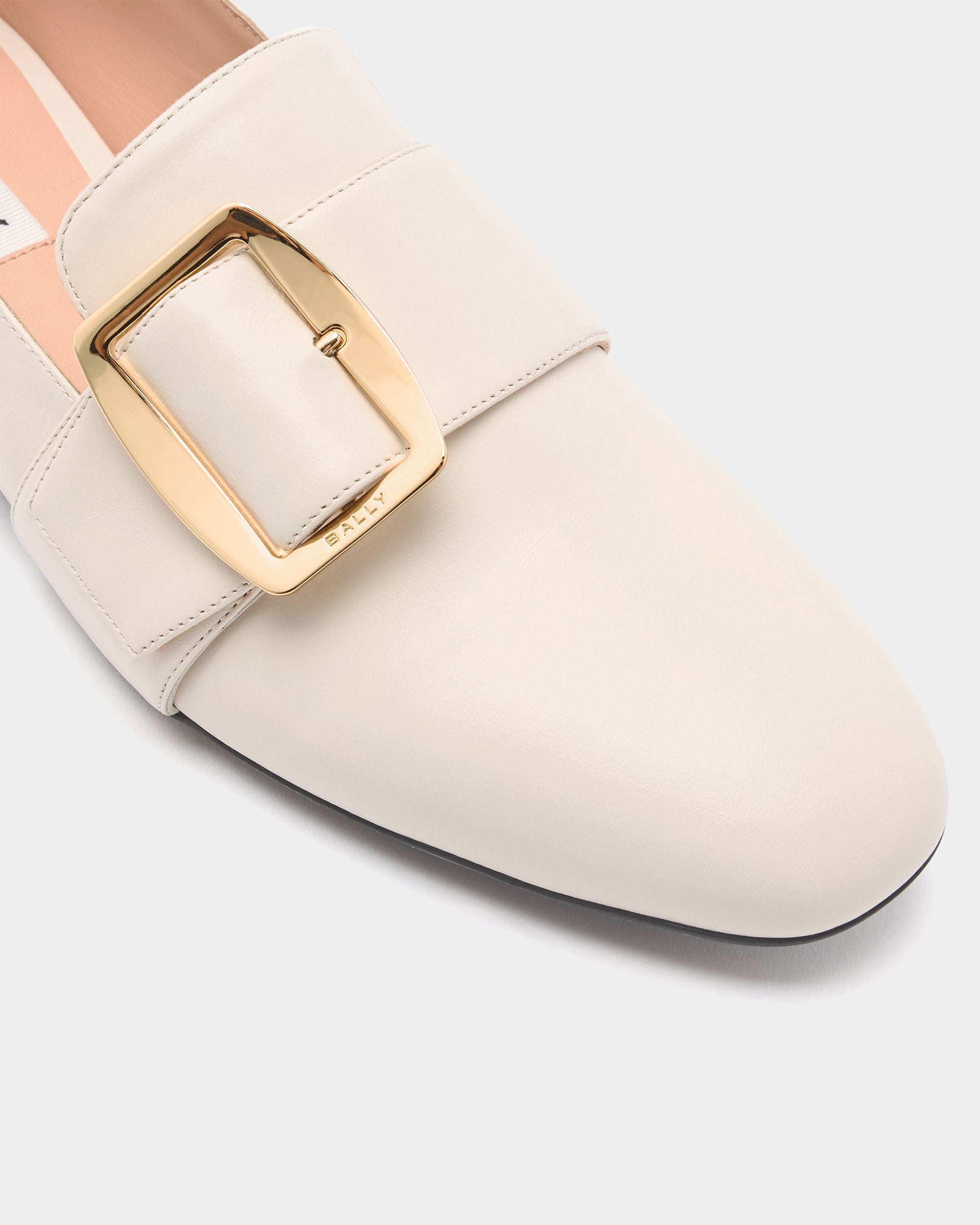 In Ivory calfskin. this Bally Boucle slipper seamlessly blends a Bally icon with modern aesthetics in an interpretation of the brand’s heritage. To the front. a large metal buckle with the Bally logo secures a strap which extends up and over the vamp. The heel can be folded down and styled as a mule.