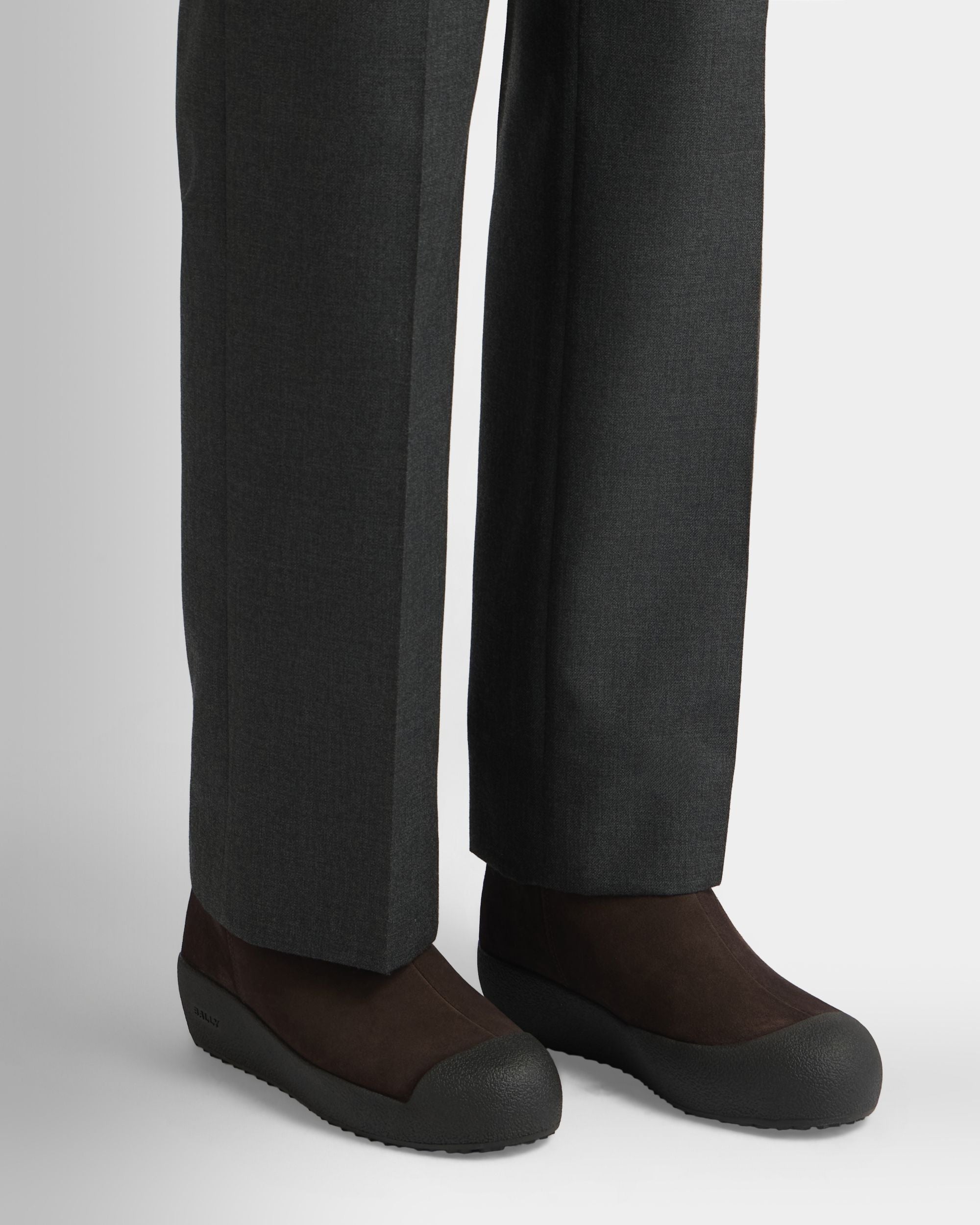 Inspired by a 1950s design by Bally for the Swiss Olympic team. this Curling bootie in ebano suede is engineered to insulate and cushion while providing maximum stability via the Vibram Arctic grip sole. A practical zipper fastens the back.