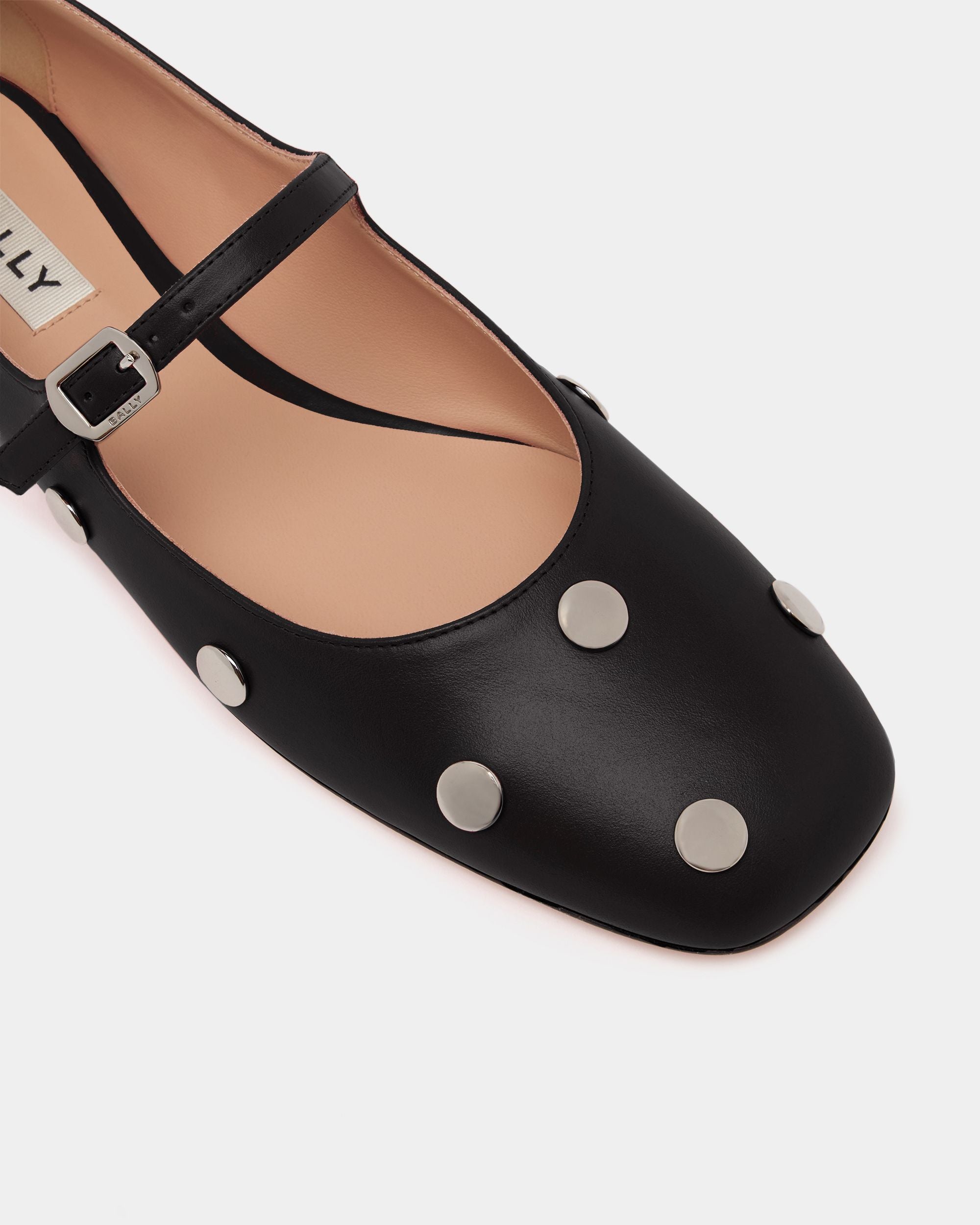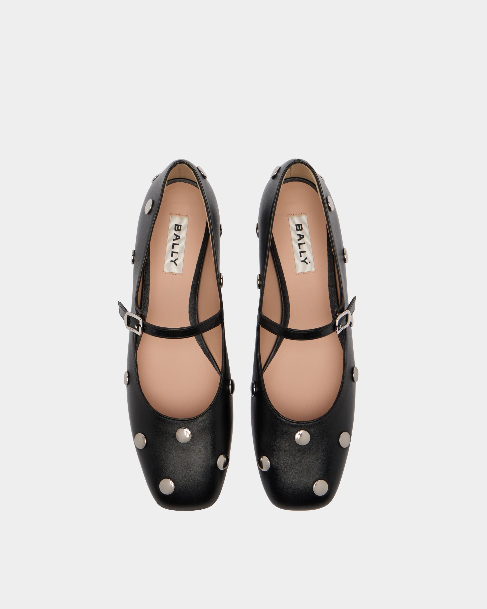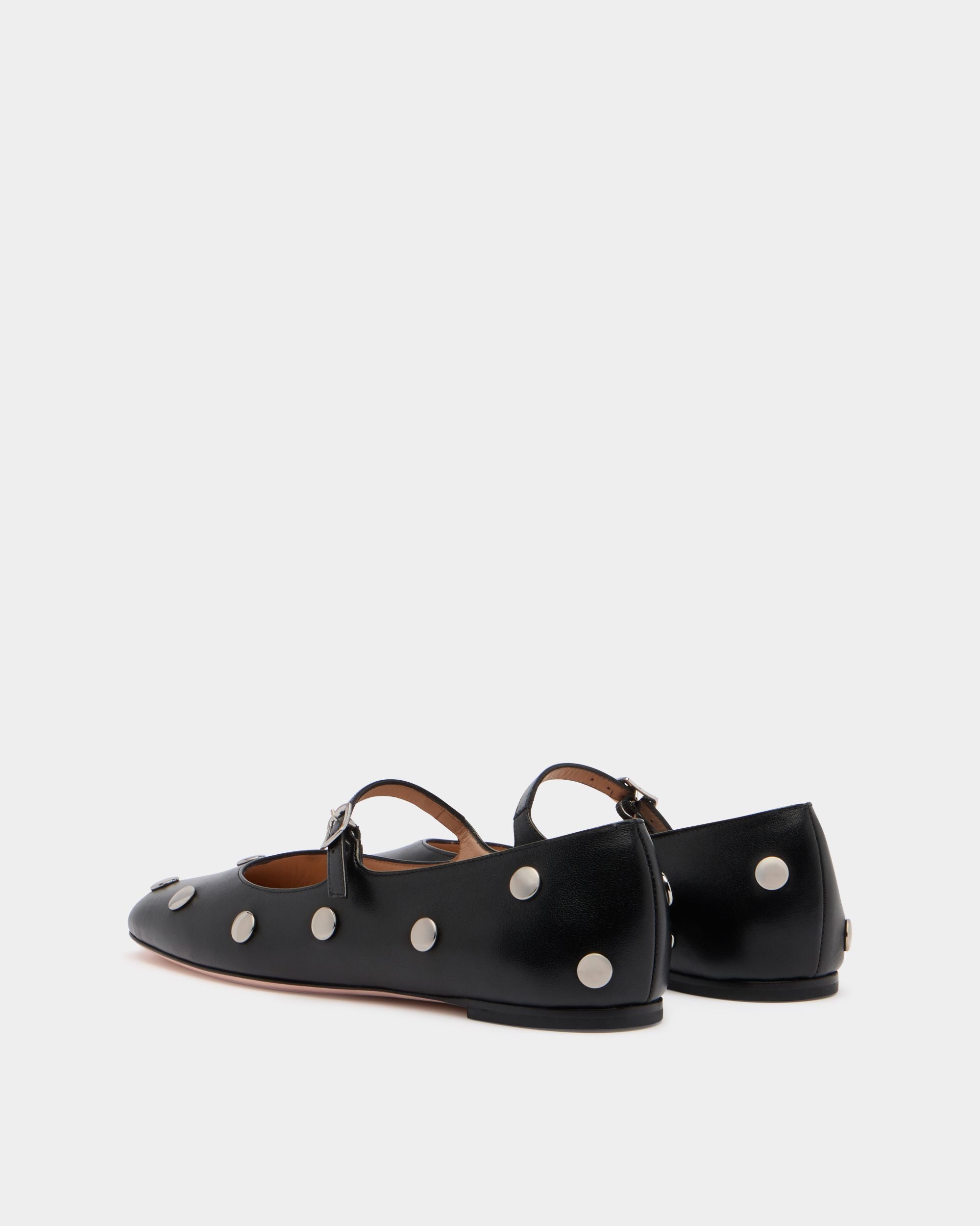 This Ballyrina flat is meticulously crafted in black calfskin with round flat studs which create playful yet bold polka dots. A slender strap crosses the top. secured by a metal buckle inspired by a design from the Bally archives.