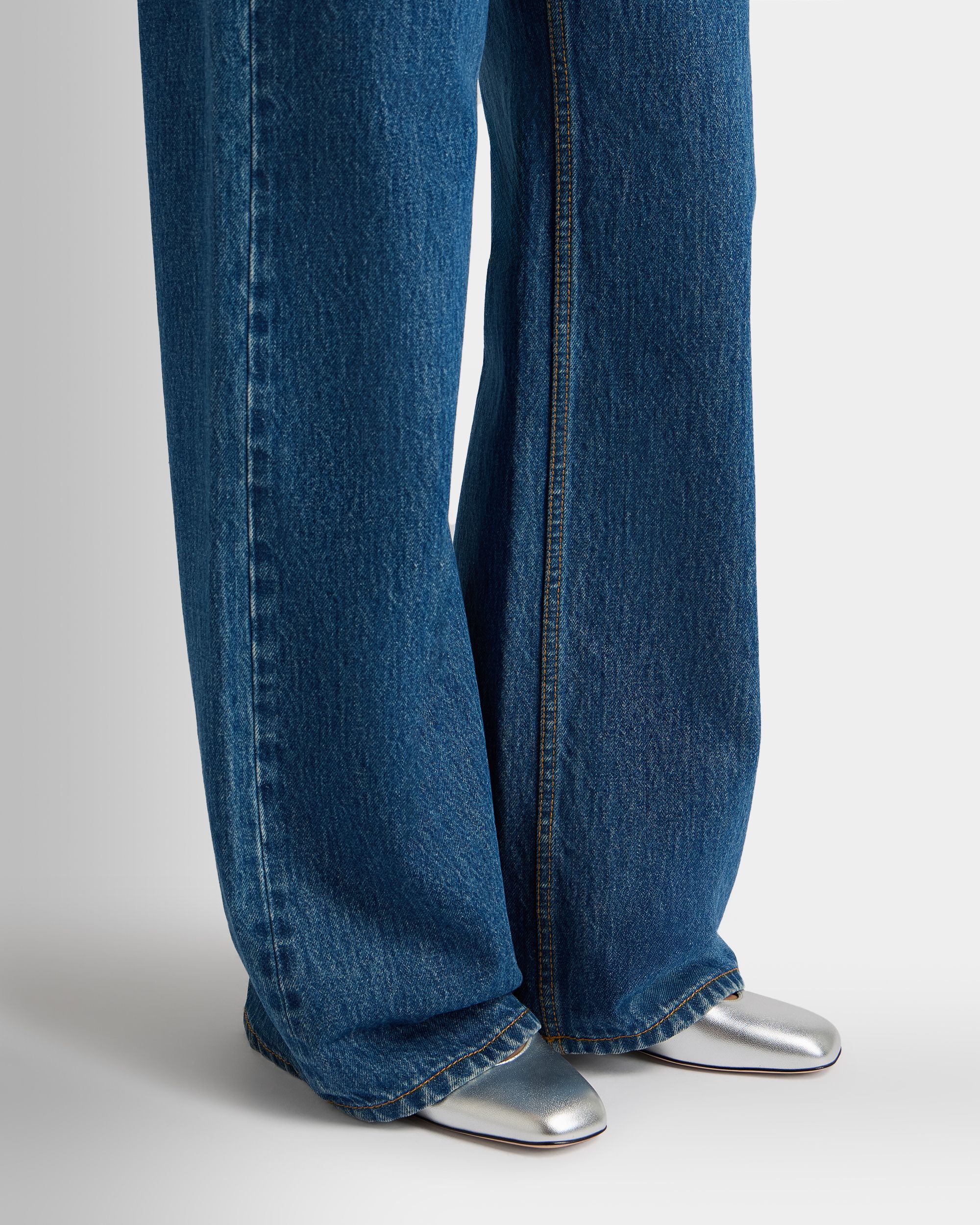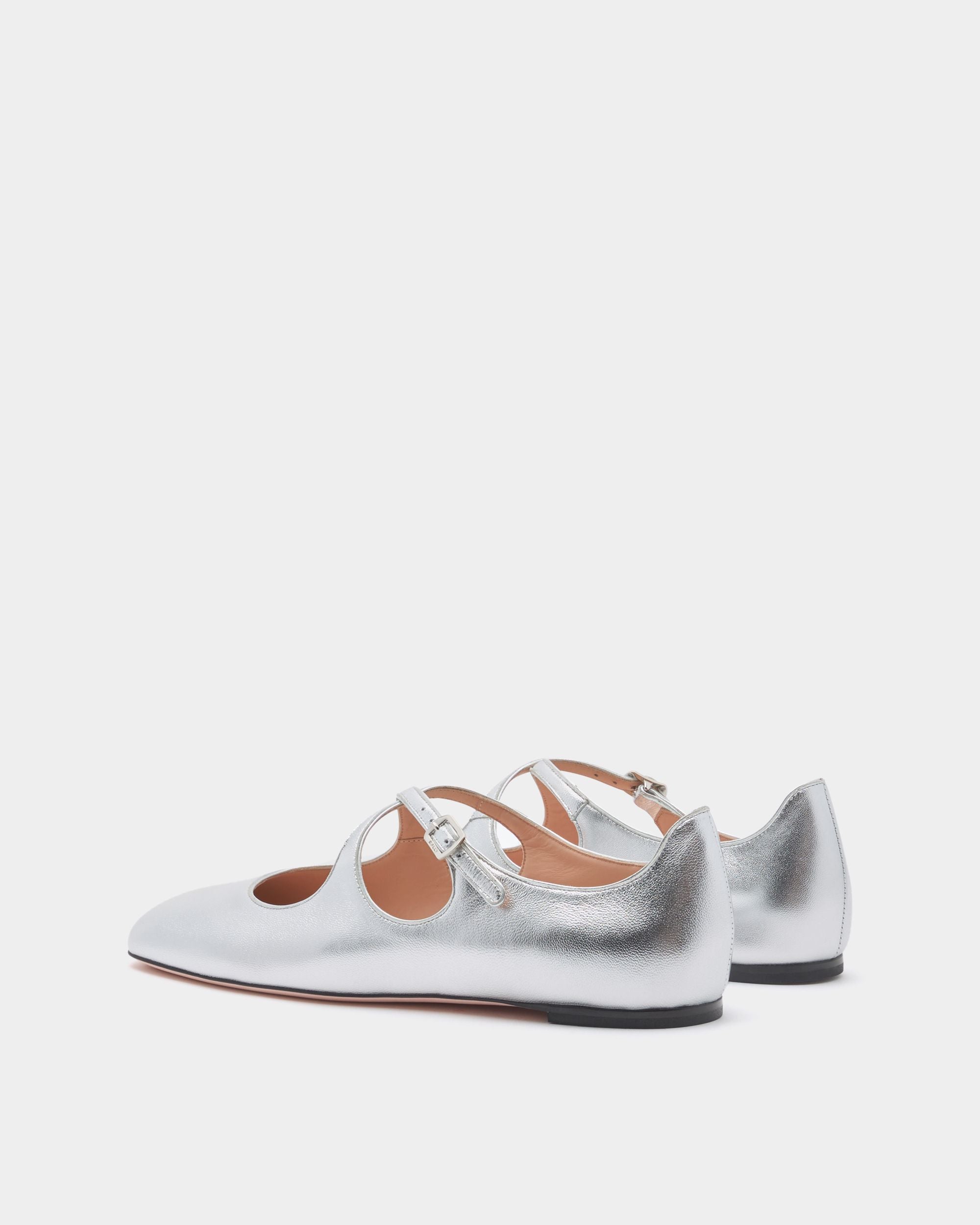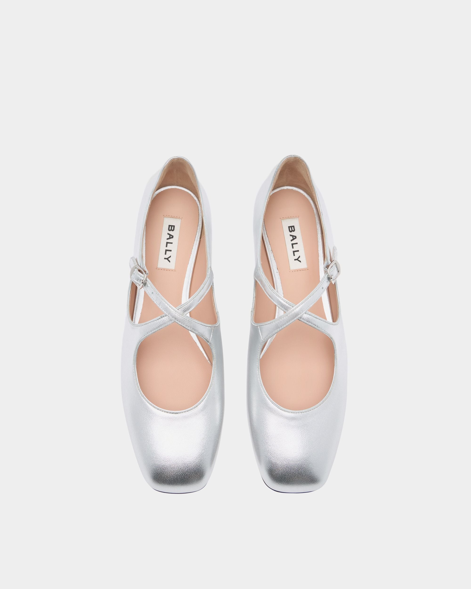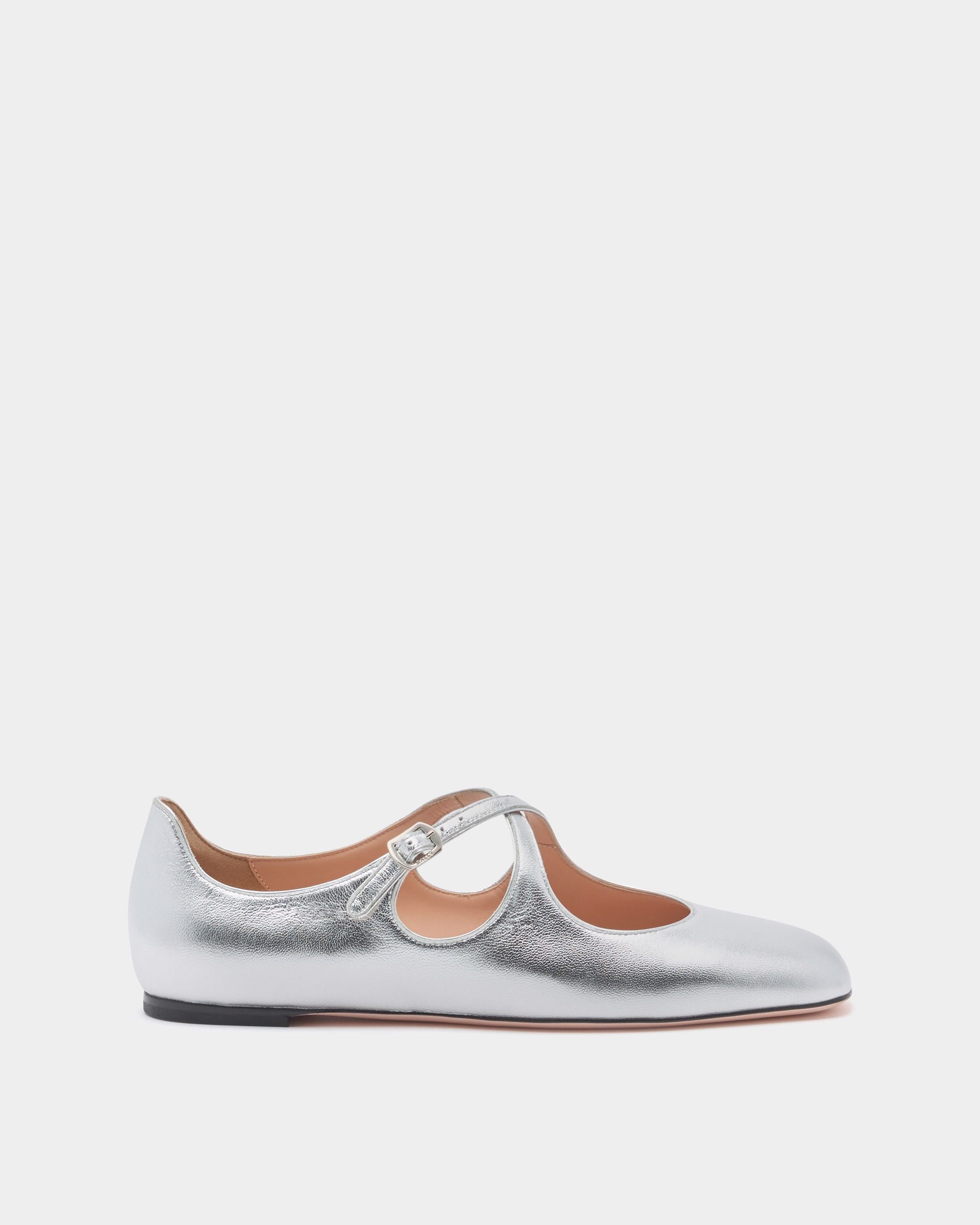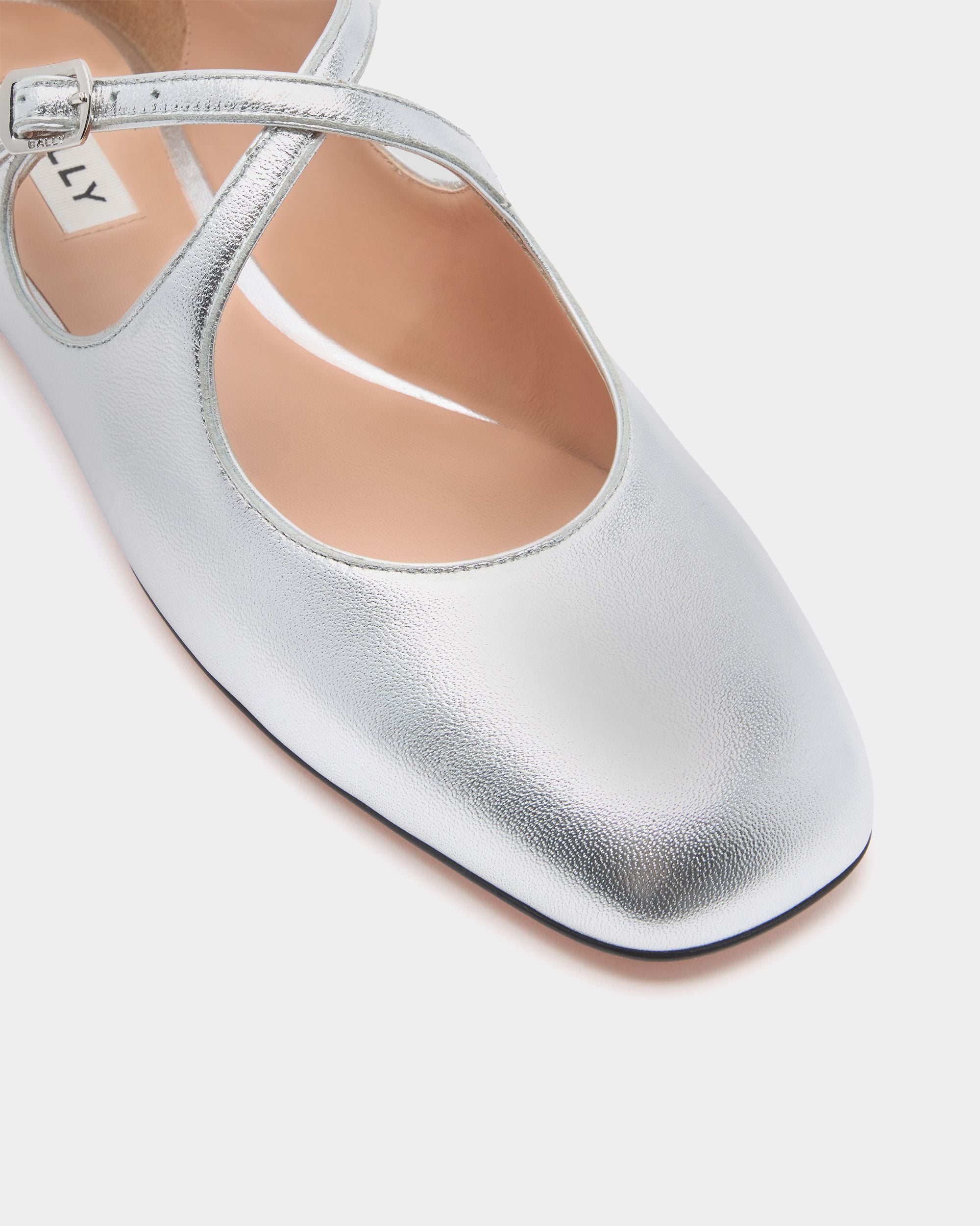 This Ballyrina flat is meticulously crafted in soft sheepskin with a silver finish. Two slender straps cross at the top. secured by a metal buckle inspired by a detail from the Bally archives. A square toe provides an on-point finish.