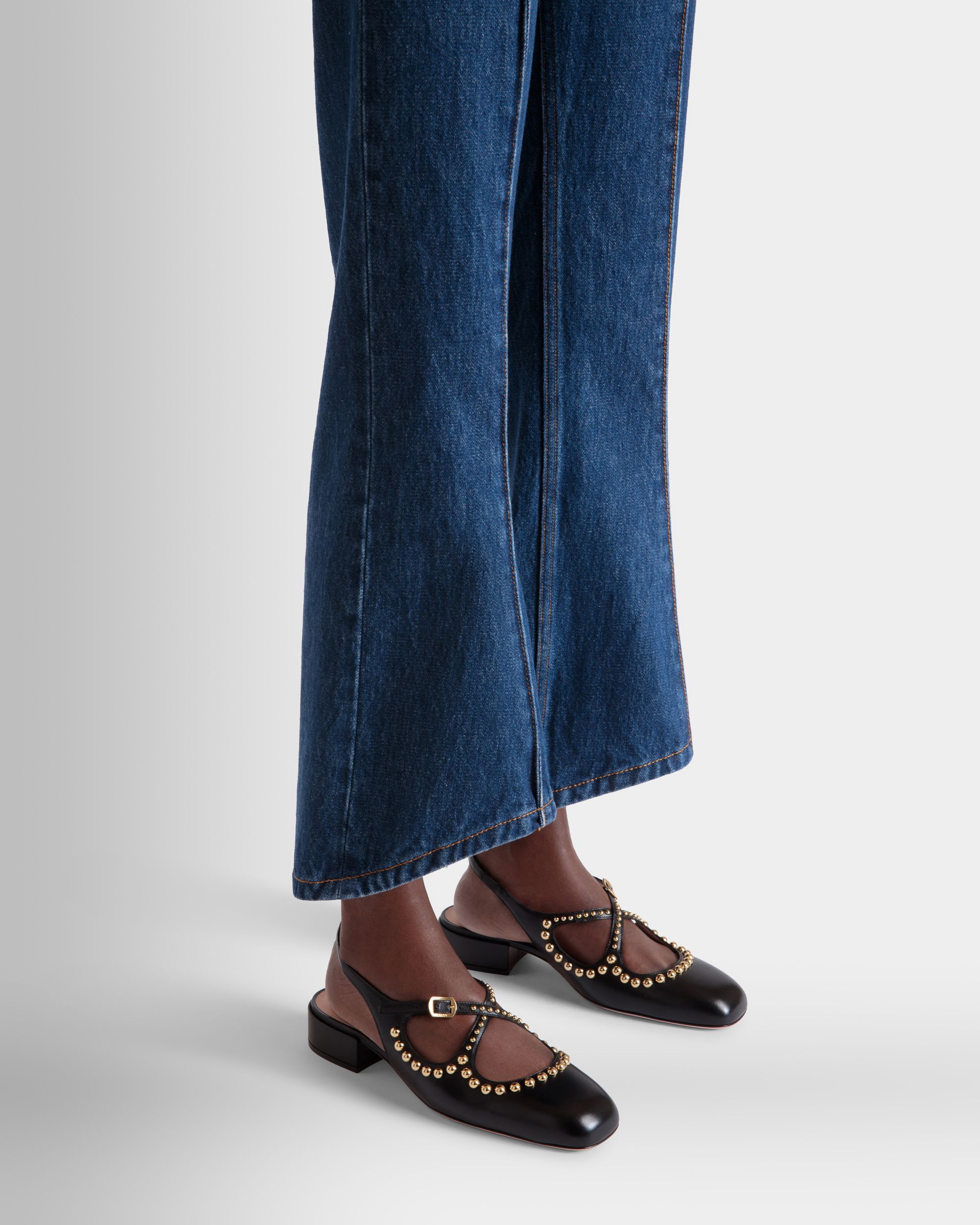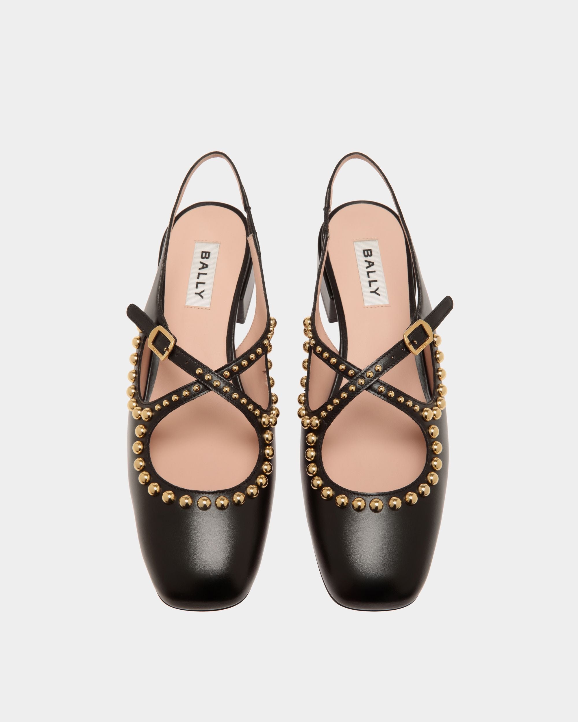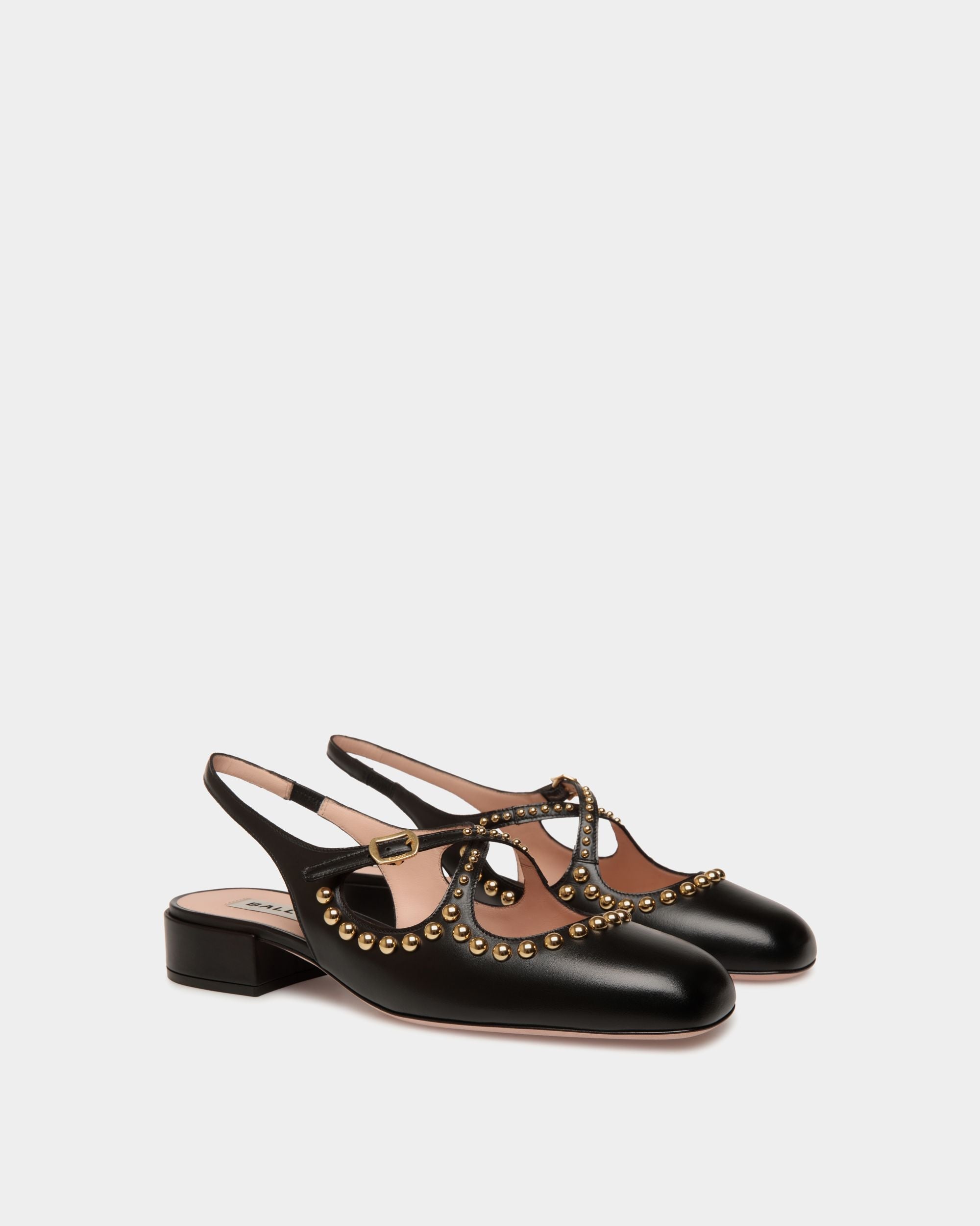 This black leather Ballyrina slingback pump is embellished by gold-tone orb studs on the upper. An archive-inspired buckle fastens the crisscross straps.