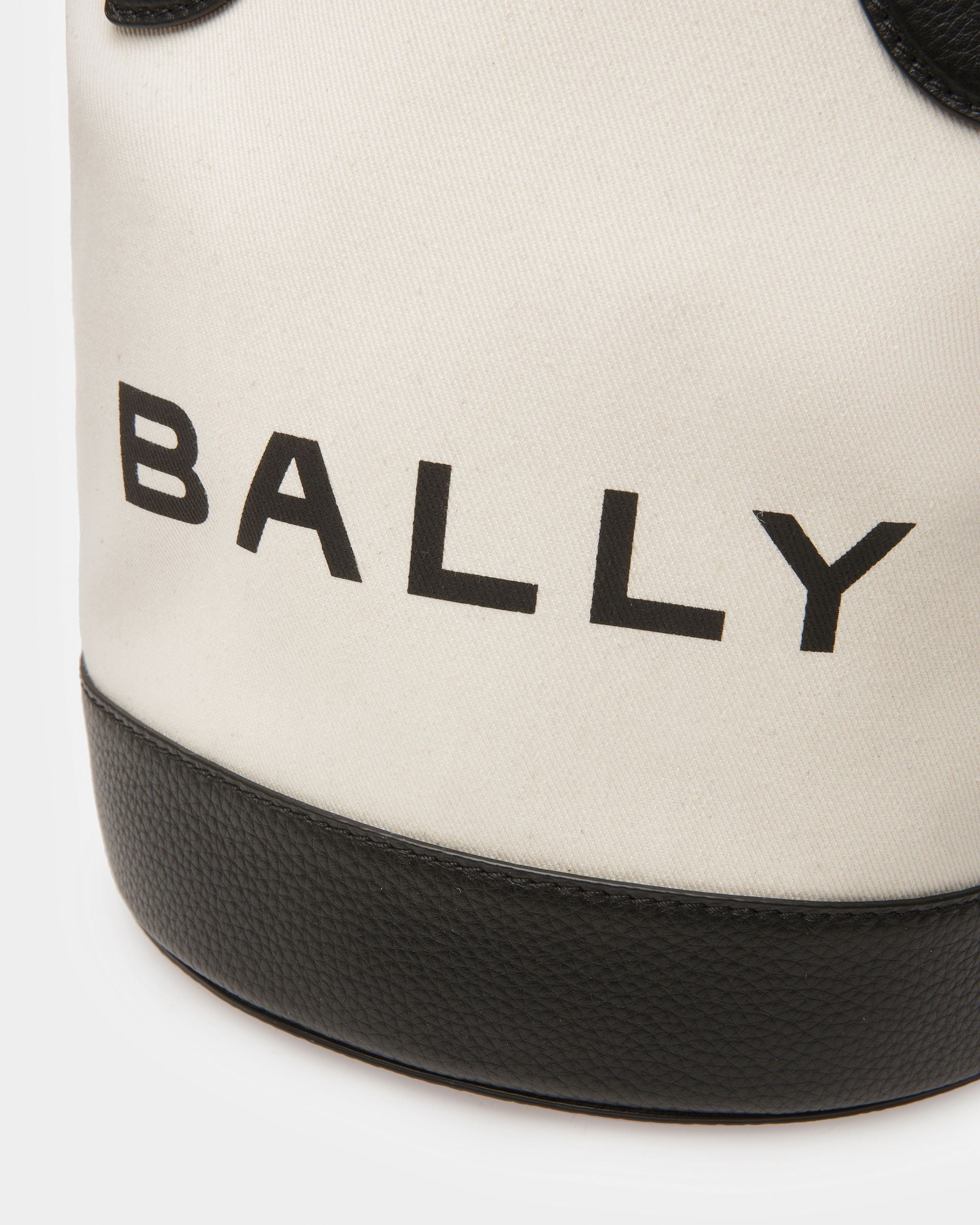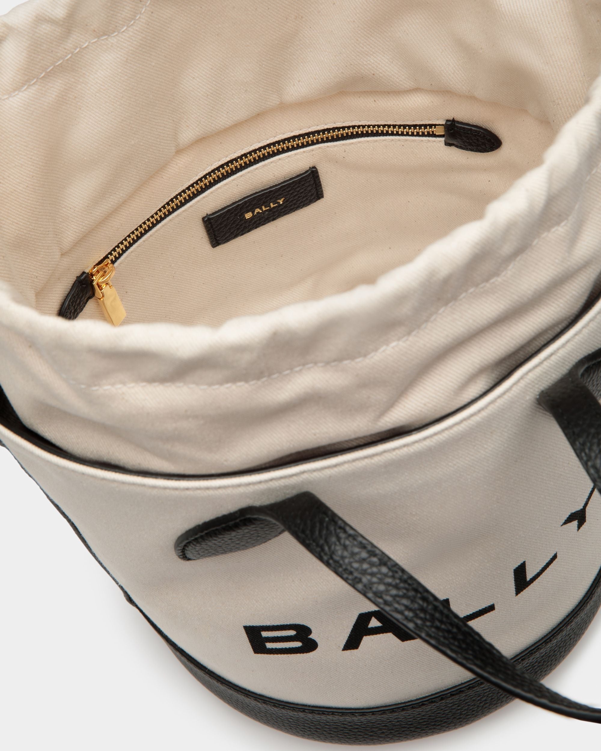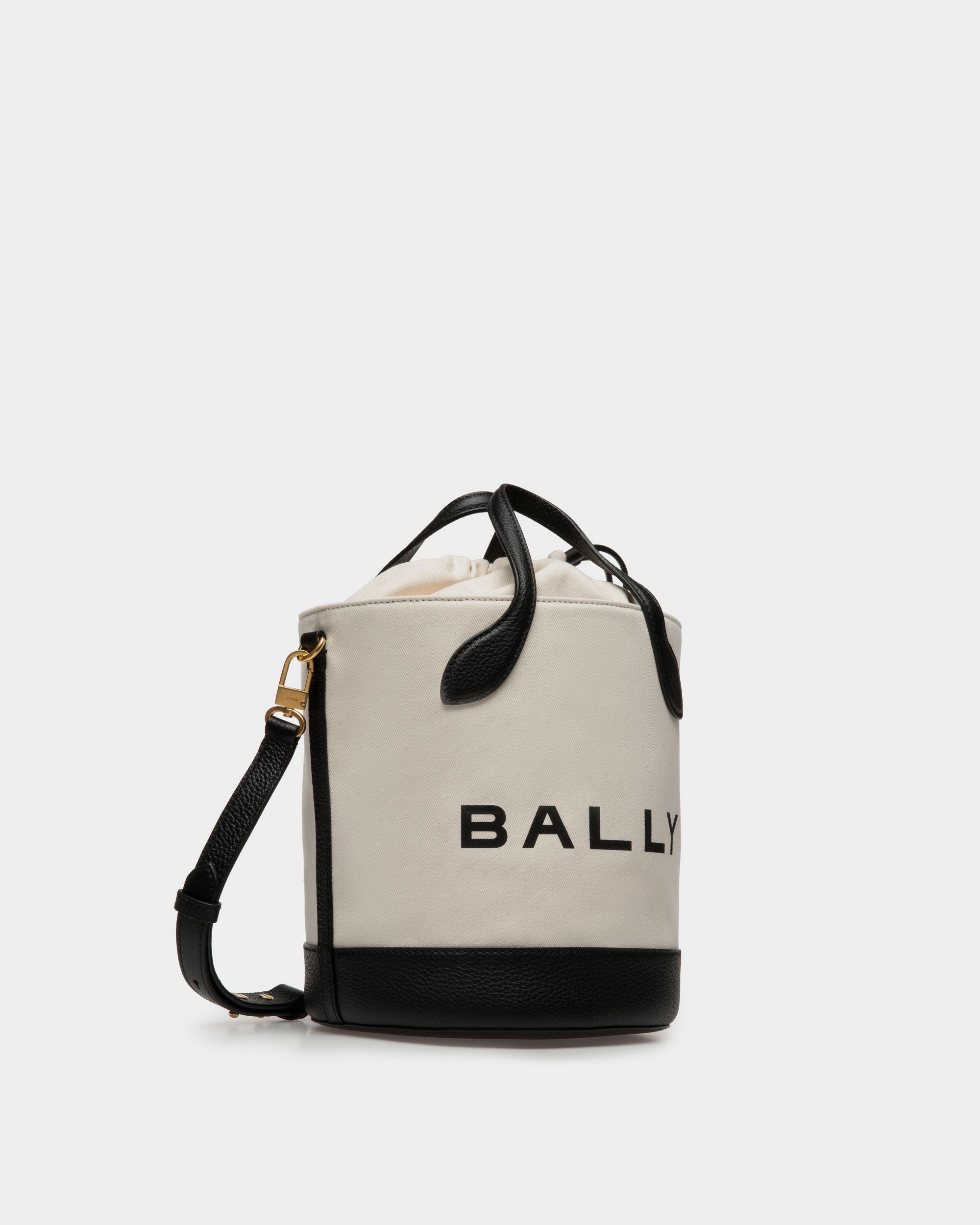 Enriched with black accents. this natural-colored bucket bag is topped with twin handles and an adjustable shoulder strap for your choice of transportation. Key details come in the form of the iconic Bally logo stamped across the front and hammered gold hardware throughout. A drawstring closure keeps everything safe and secure.
