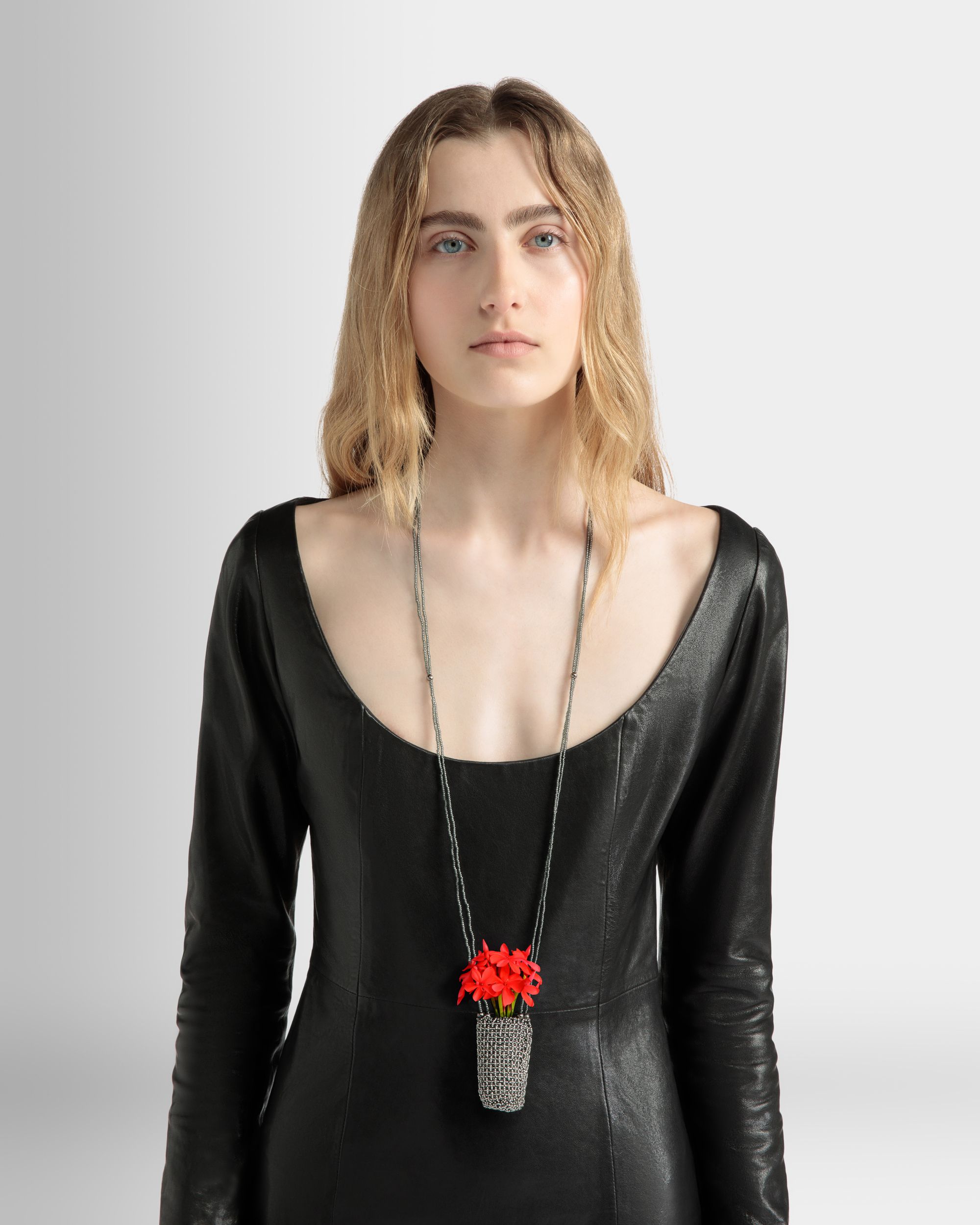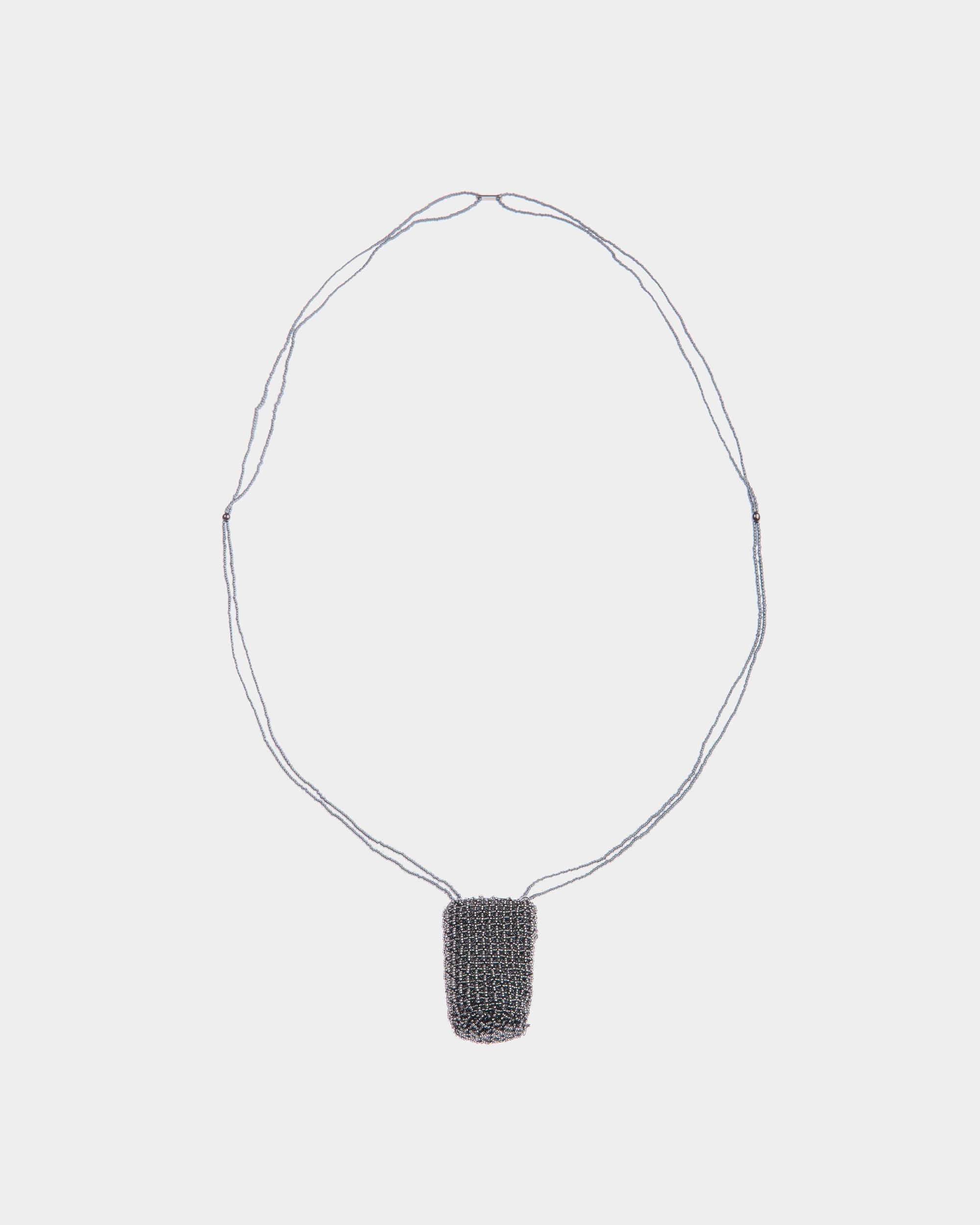 A modern talisman. the Beads necklace is composed of an organza base which has been manually embroidered with small glass beads. The resulting check motif is then enriched by the shimmer of lurex thread.