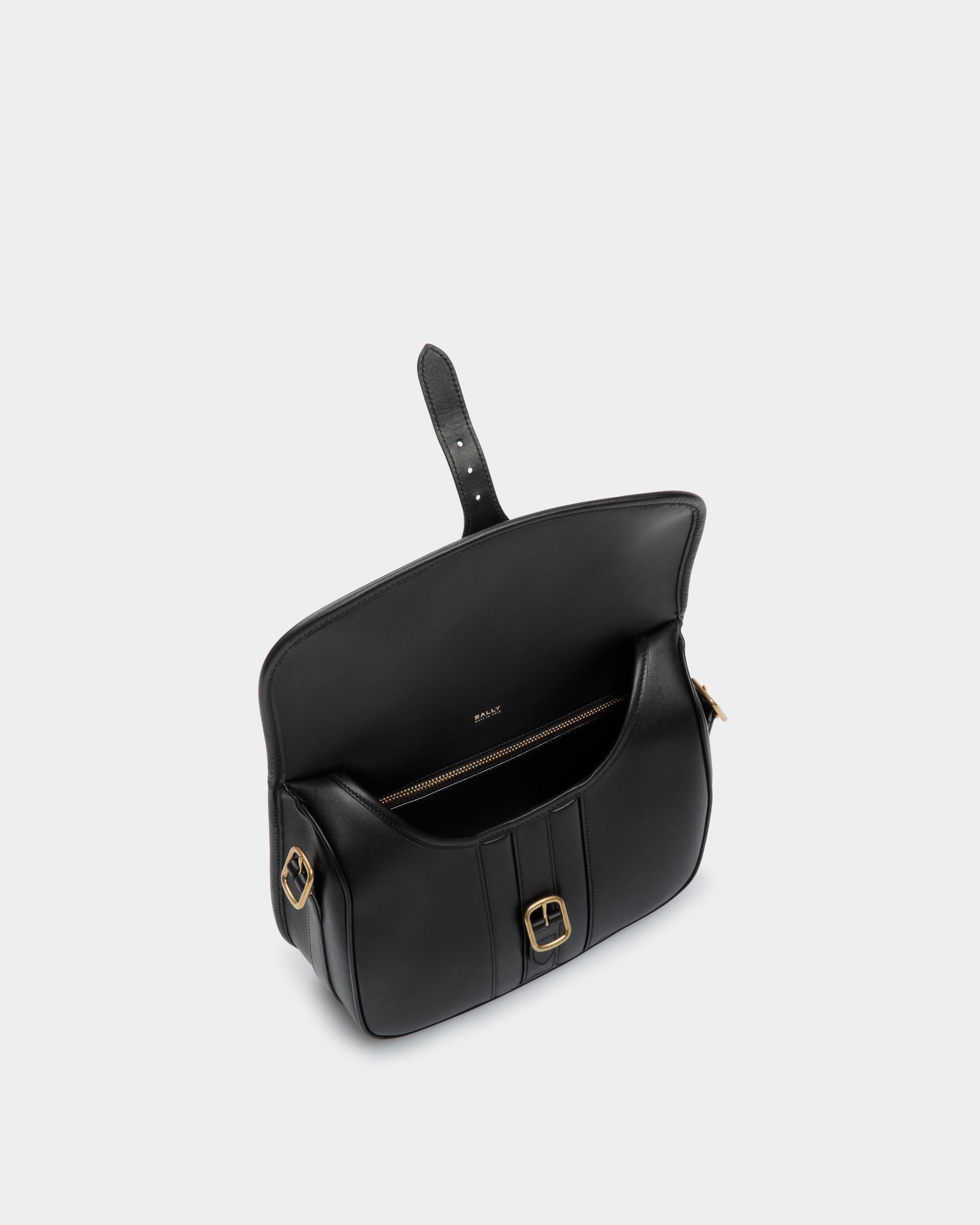 Presented during the Bally SS24 fashion show. the black calfskin Beckett messenger bag is casual and easy-to-style. inspired by vintage lines yet designed for modern lifestyles. The adjustable and removable shoulder strap allows for various carry options. from cross-body to over-the-shoulder. The Bally Ribbon and the gold-tone Bally Crest signifiers add a finishing touch. referencing the heritage of the brand.