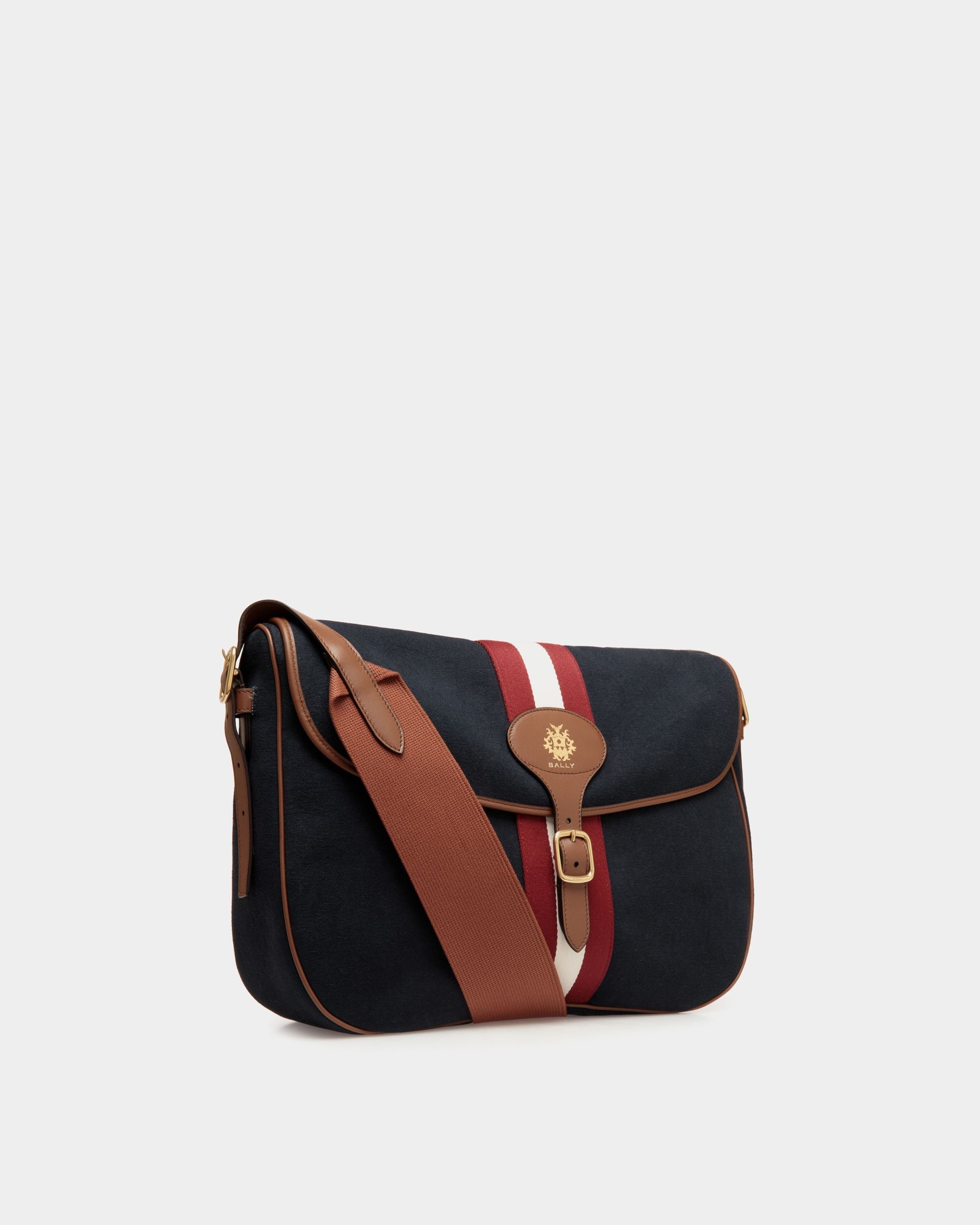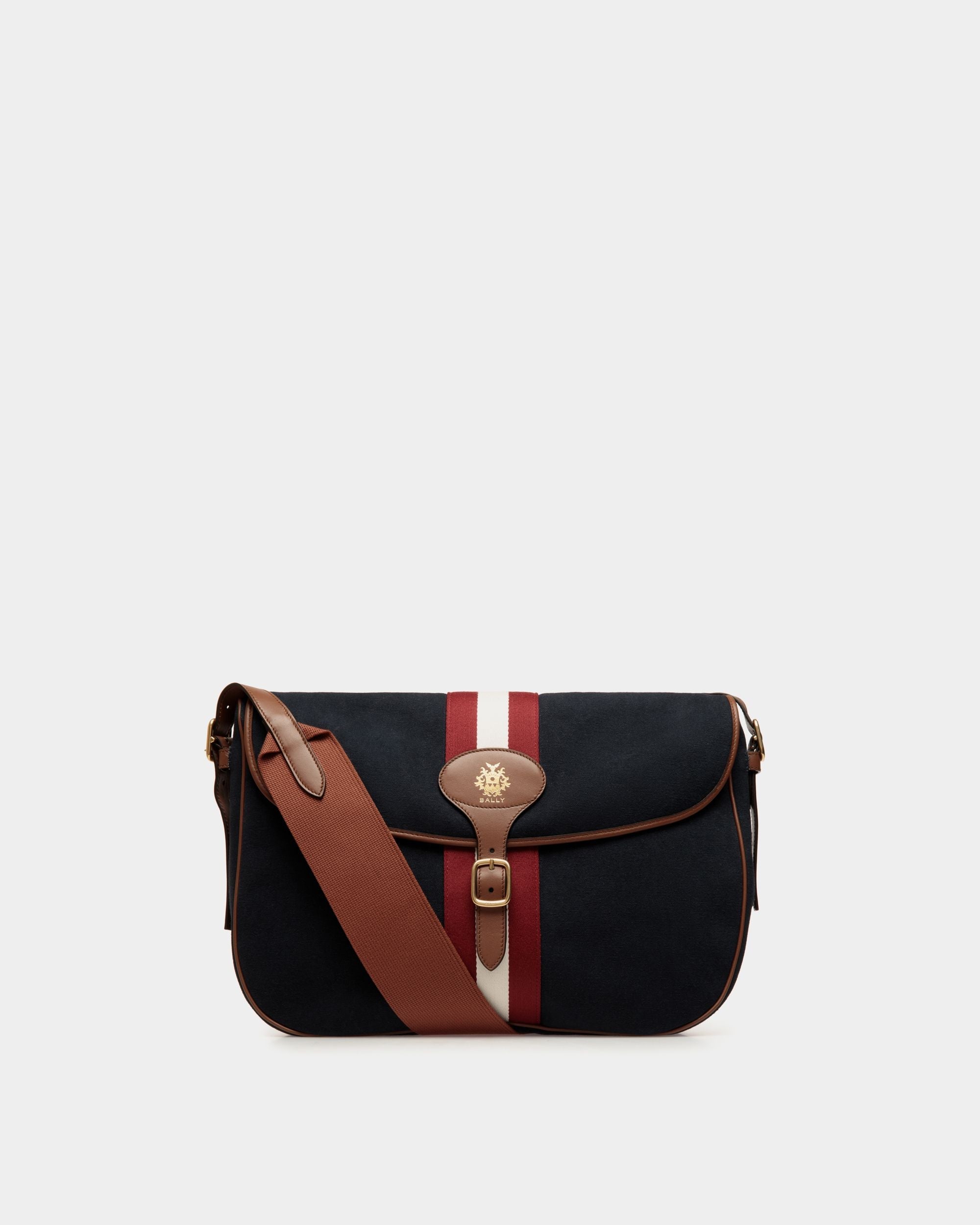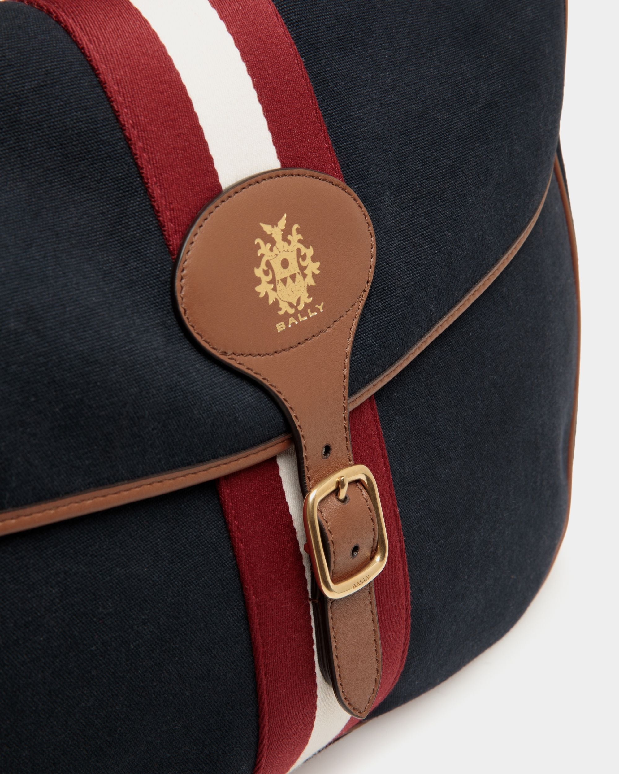 In navy blue washed cotton canvas. this Beckett crossbody bag is constructed into a soft silhouette and trimmed in leather. A red and white Bally Ribbon and a gold-tone foil Crest decorate the front.