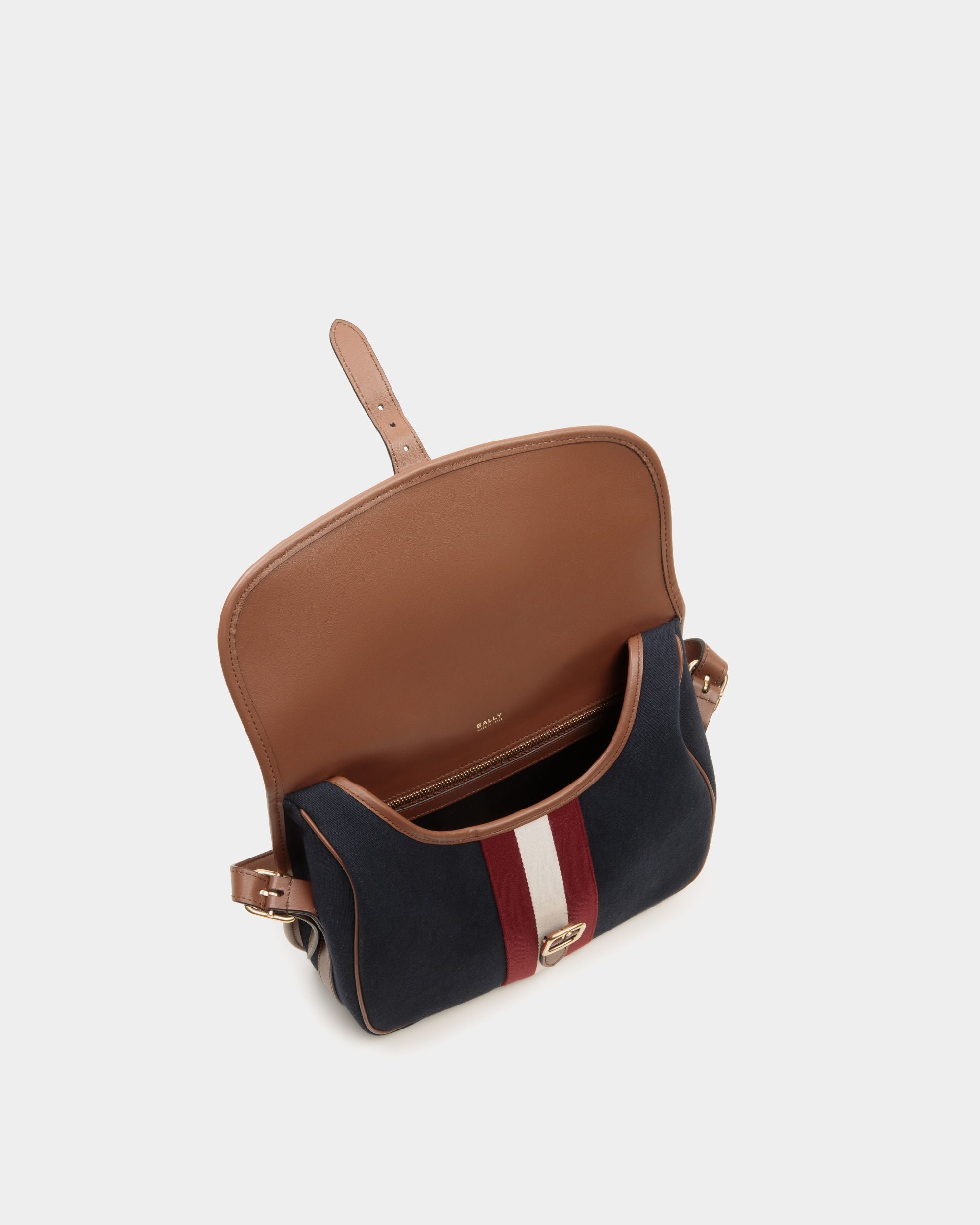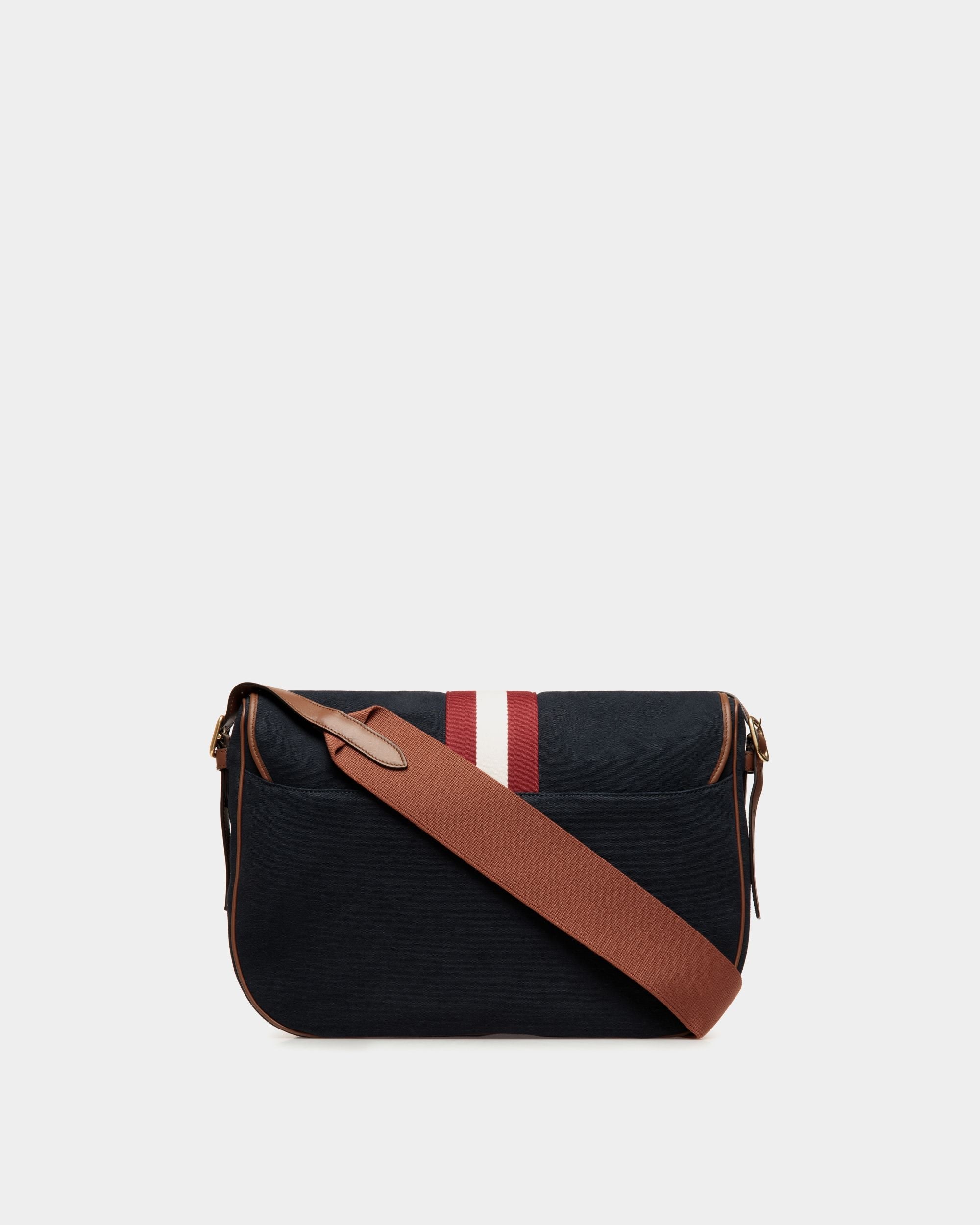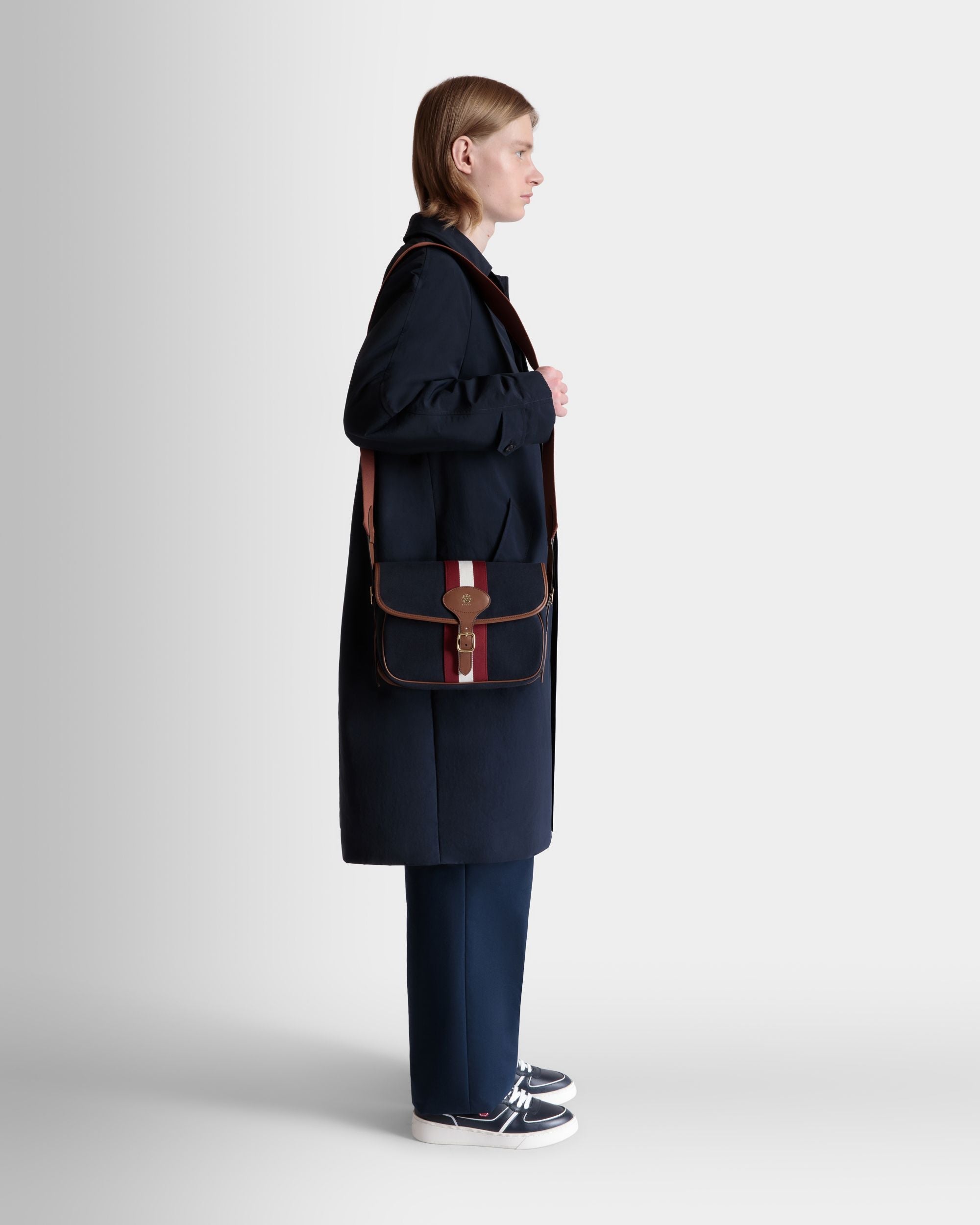 In navy blue washed cotton canvas. this Beckett crossbody bag is constructed into a soft silhouette and trimmed in leather. A red and white Bally Ribbon and a gold-tone foil Crest decorate the front.