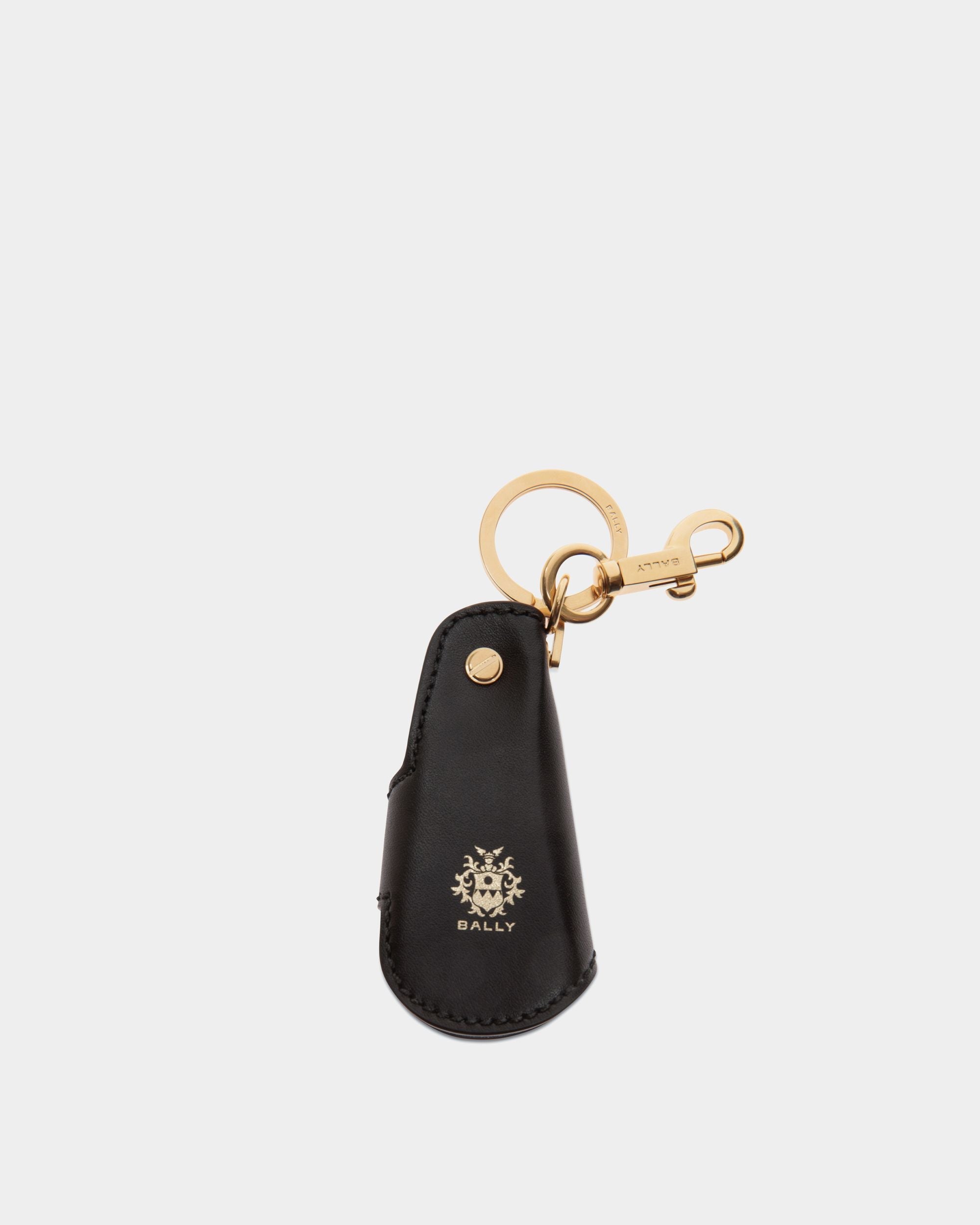 The Beckett keyring in black leather unites two functional elements: a keyring and a compact shoehorn in gold-tone metal with a calfskin case.