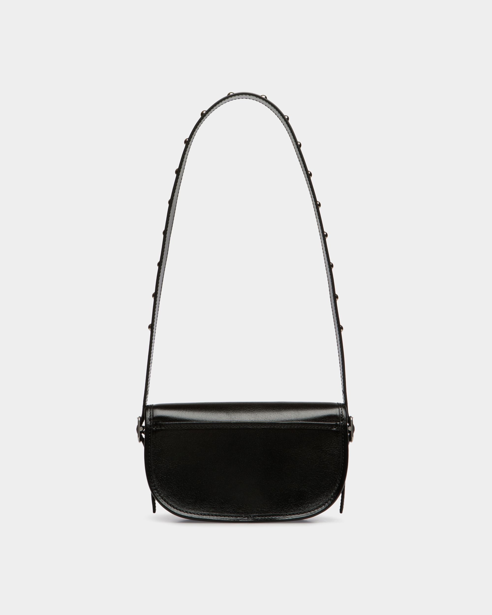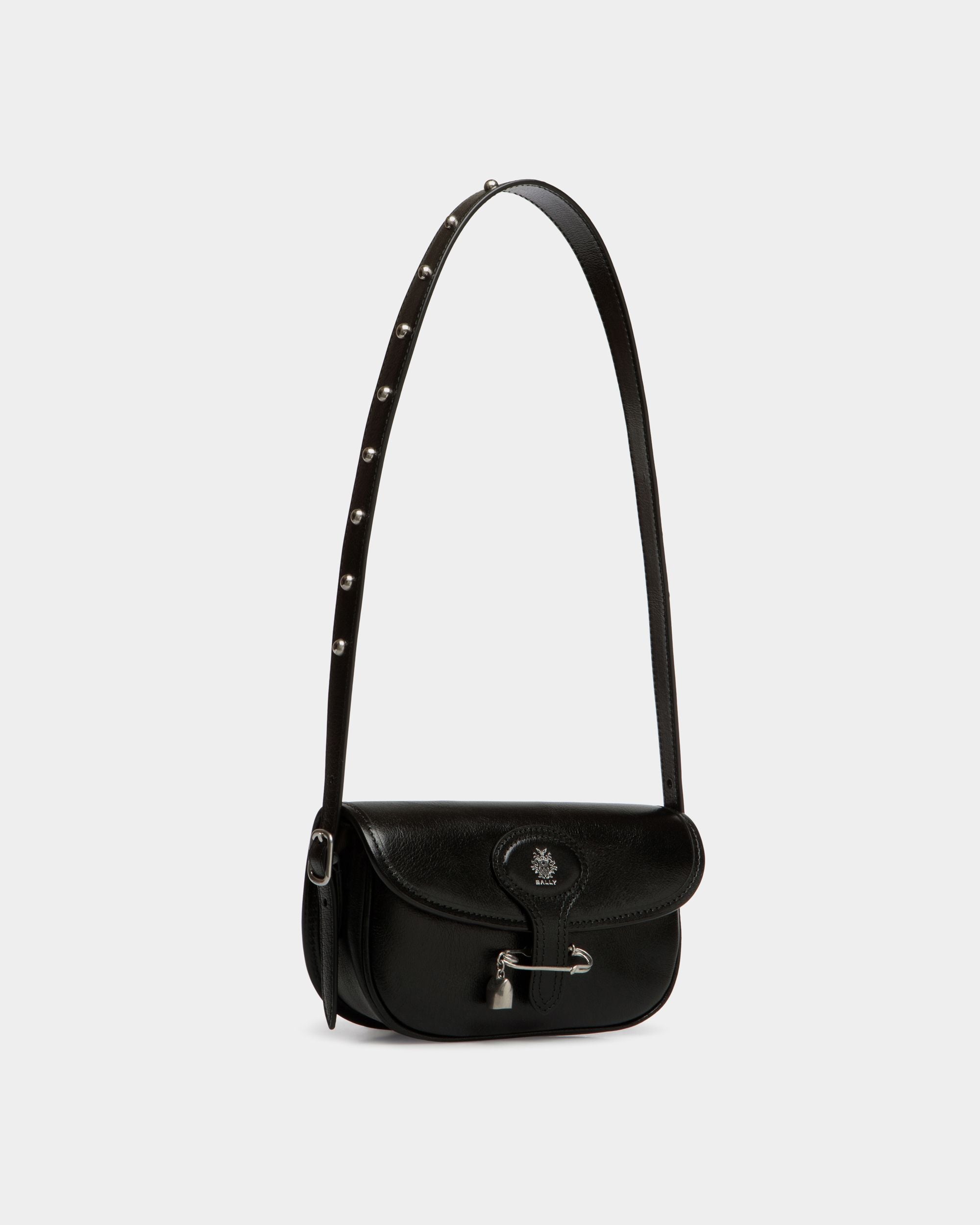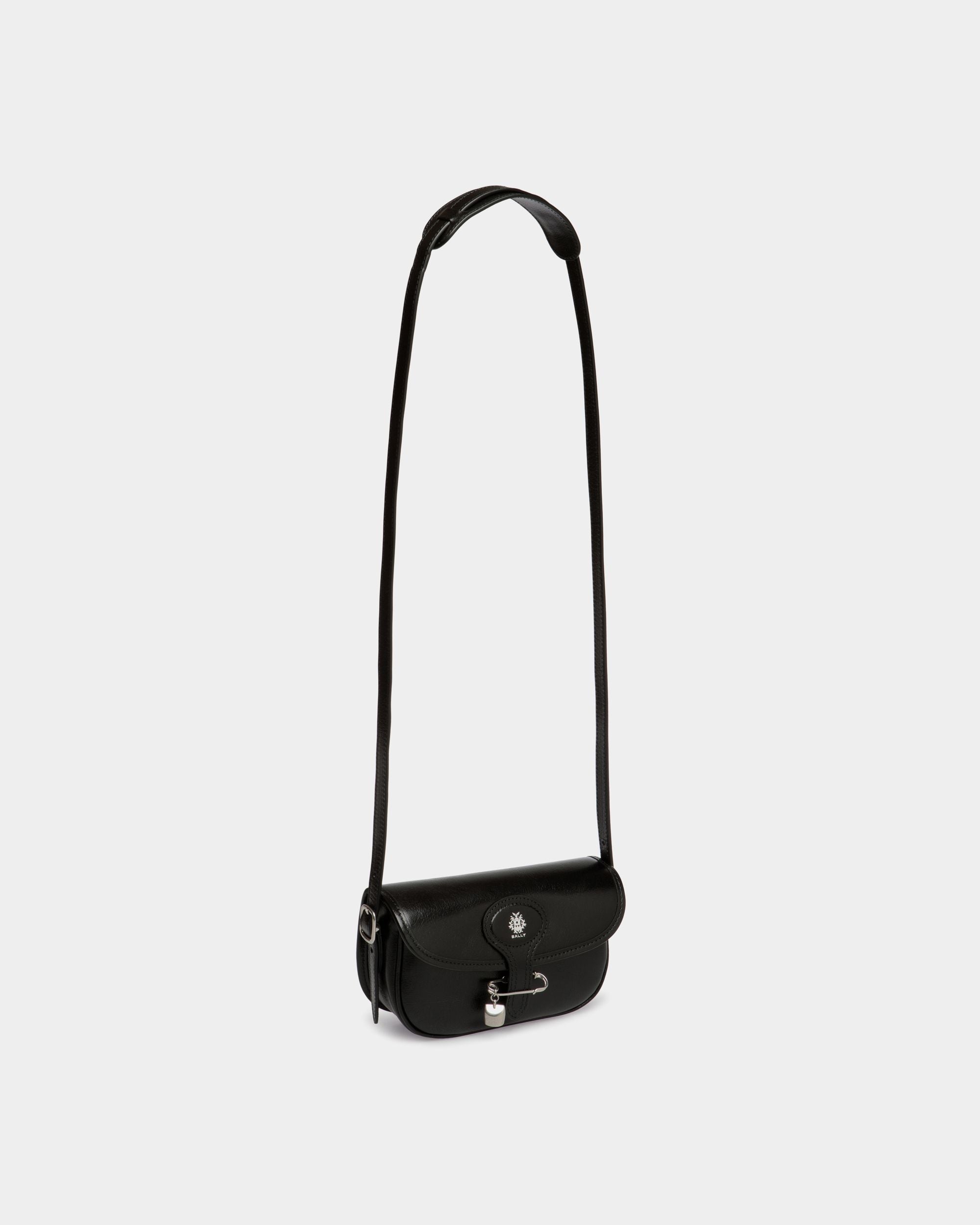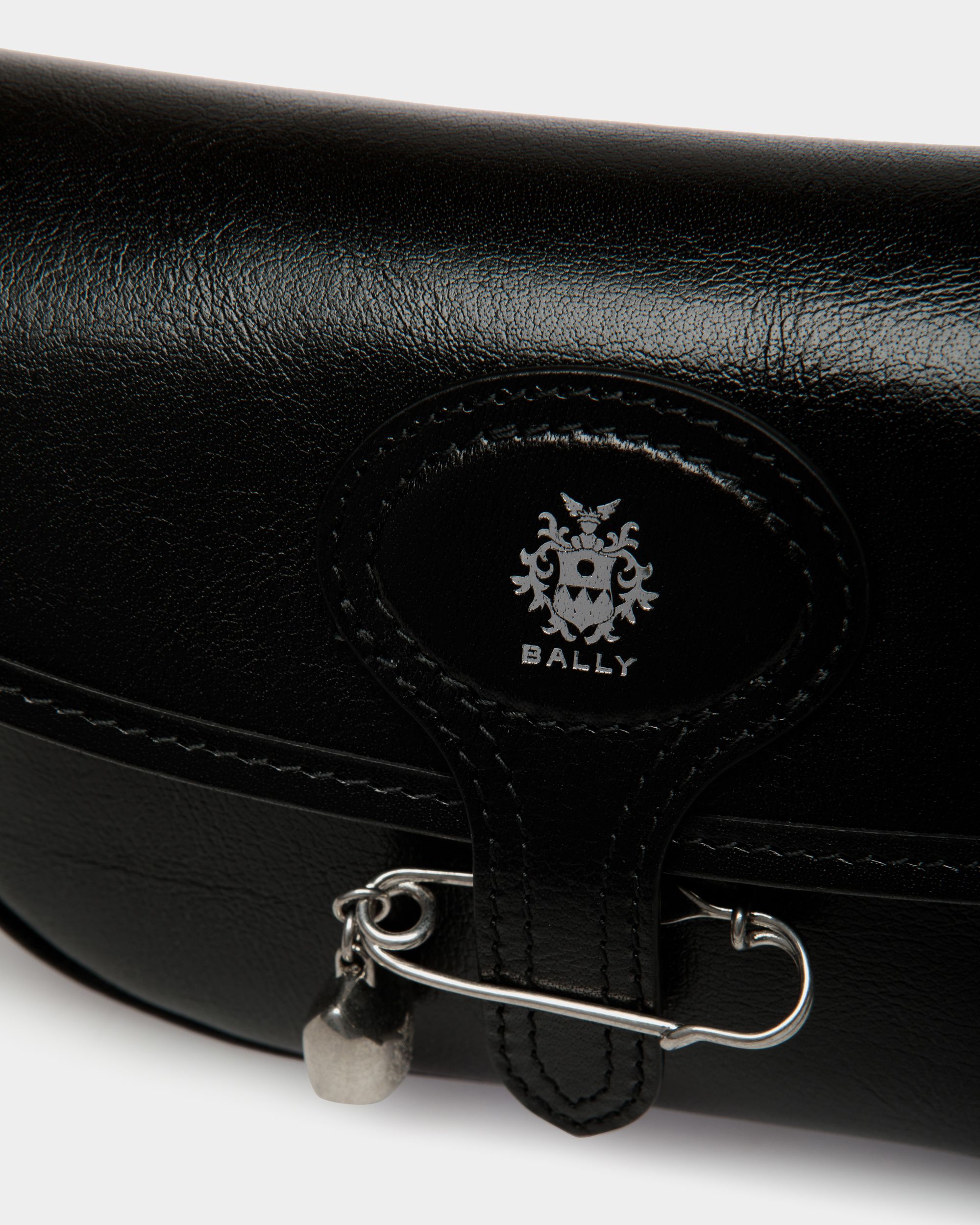 This Beckett minibag in black craquelure leather is embellished by a Belle safety pin and a Bally Crest on the front flap. Two interchangeable straps. one short and one longer. offer shoulder or crossbody portability.