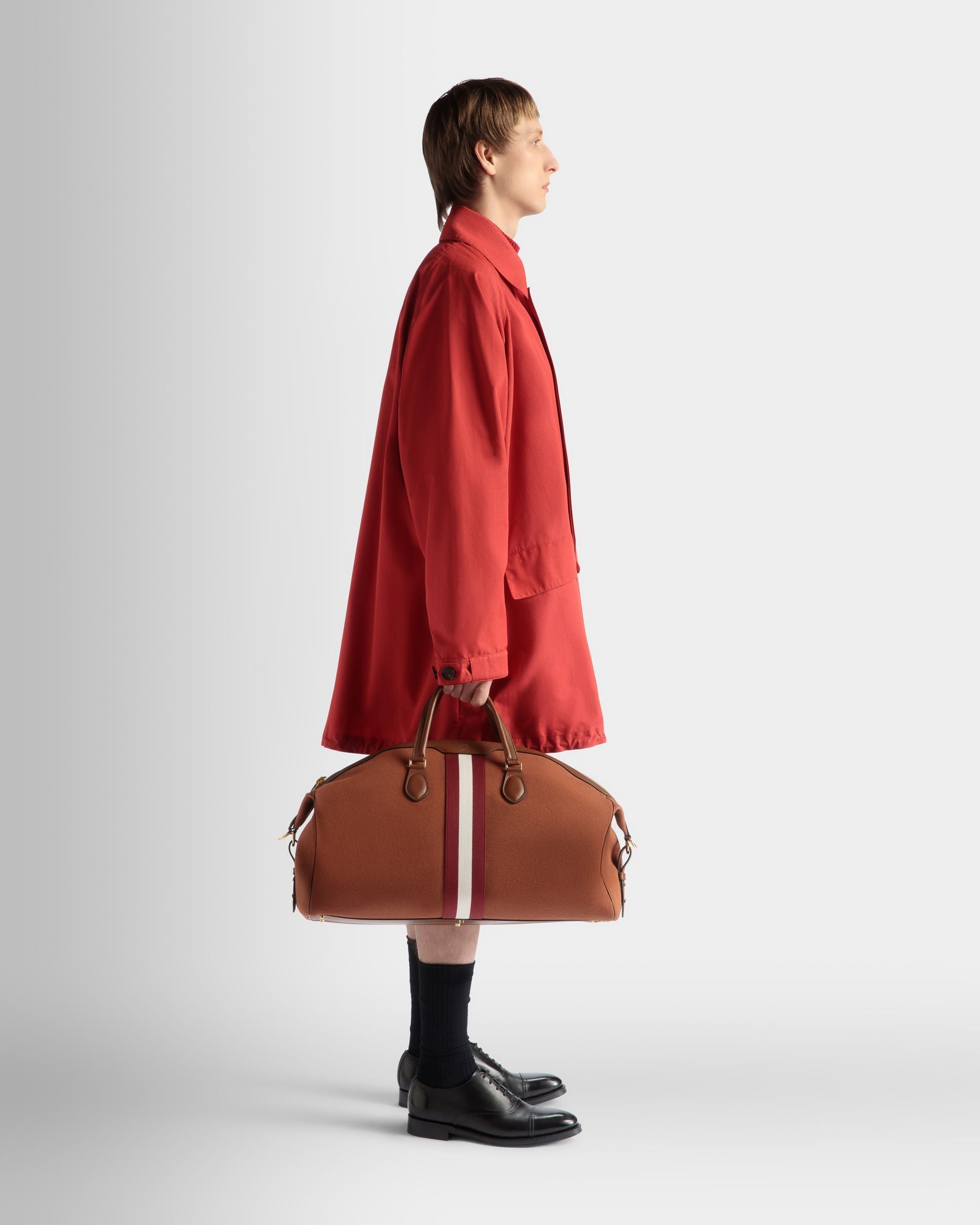 Elegant and practical. the Beckett Weekender bag in cotton canvas is inspired by a laid back poetic lifestyle. The roomy compartment with an inner zip pocket delivers optimal organization. The detachable shoulder strap ensures a number of transport options. Gold-tone metal hardware and the Bally Ribbon signifier add heritage and personality.