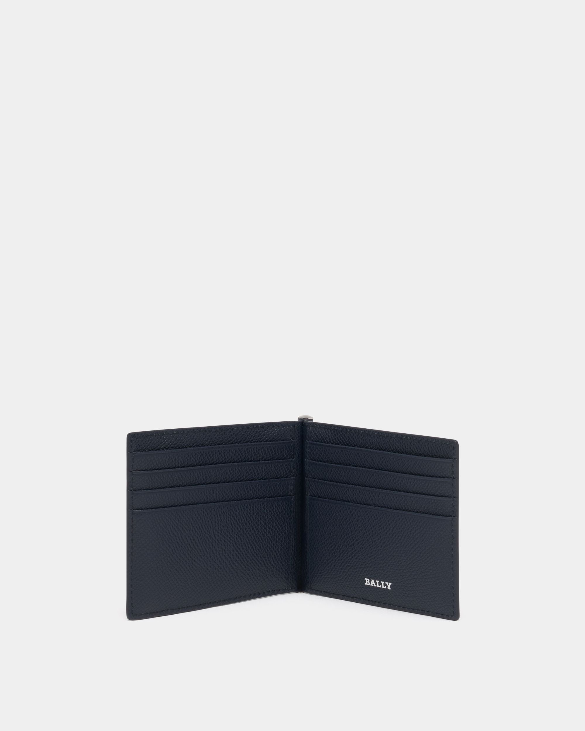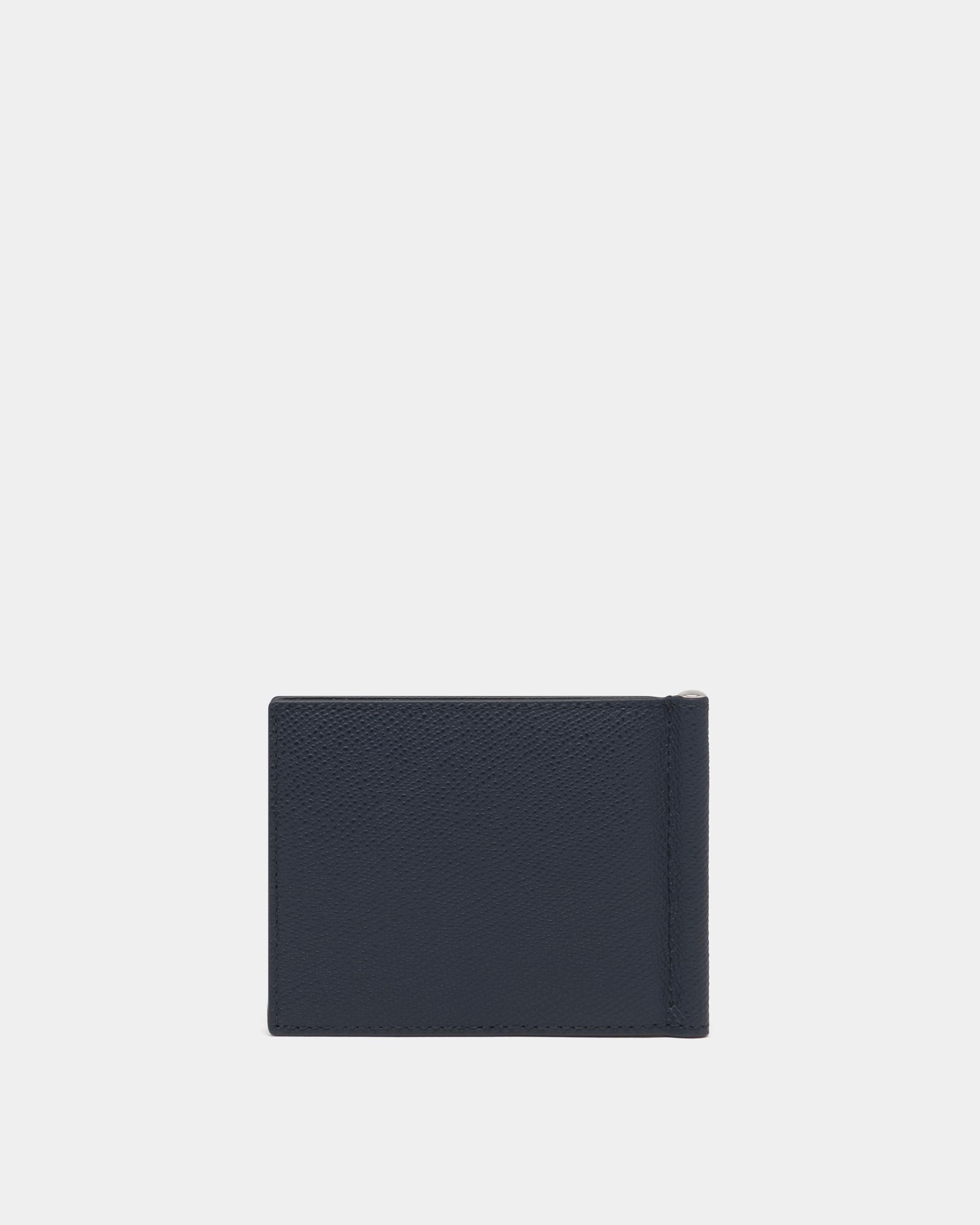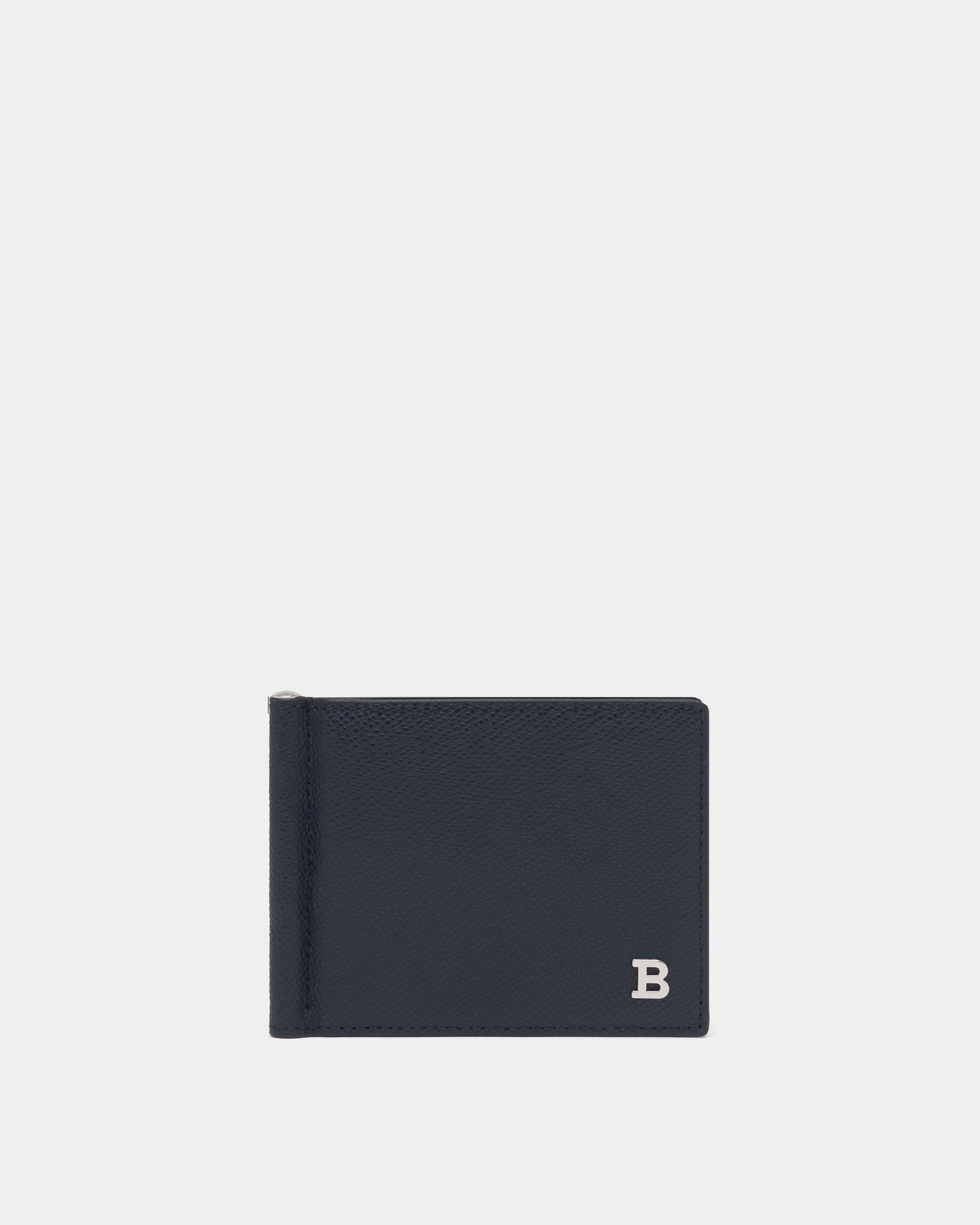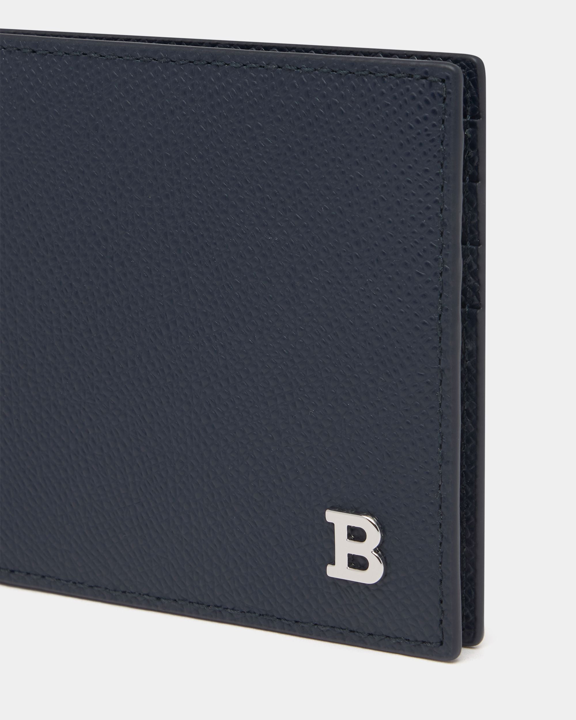 This wallet features a bifold design crafted in navy blue leather with grained embossing. A B Bold detail in metal finishes the front.