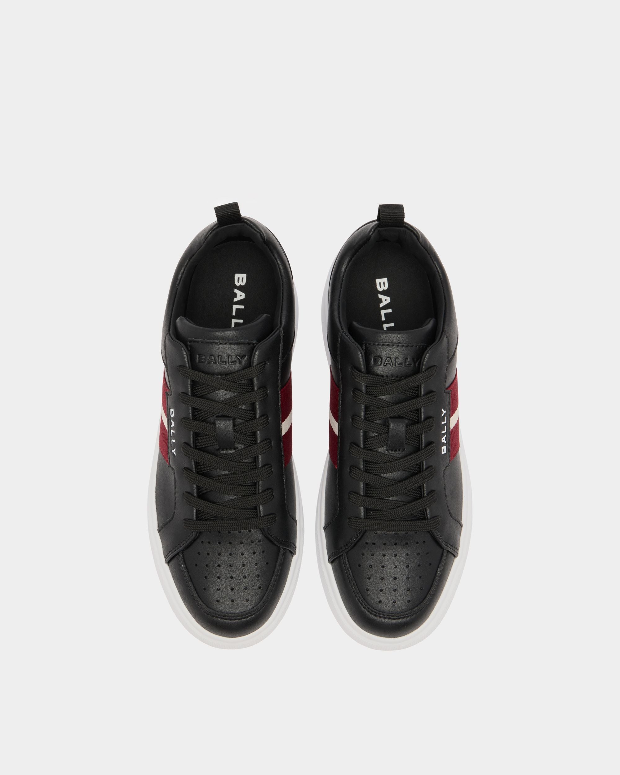 Blayze sneaker in black calfskin with a Bally Ribbon detail and a rubber sole. Additional details include perforations on the toe and a pull tab at the heel.