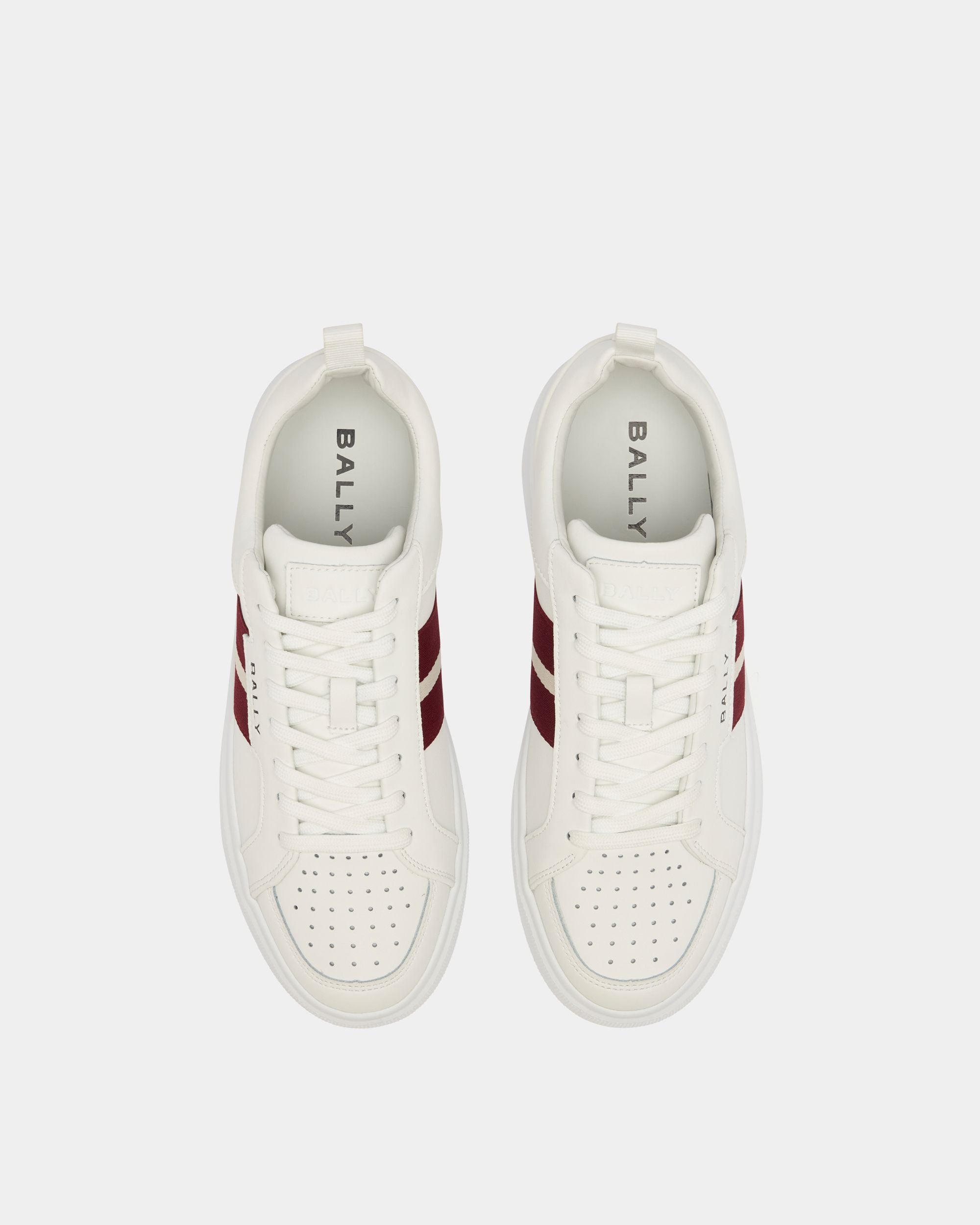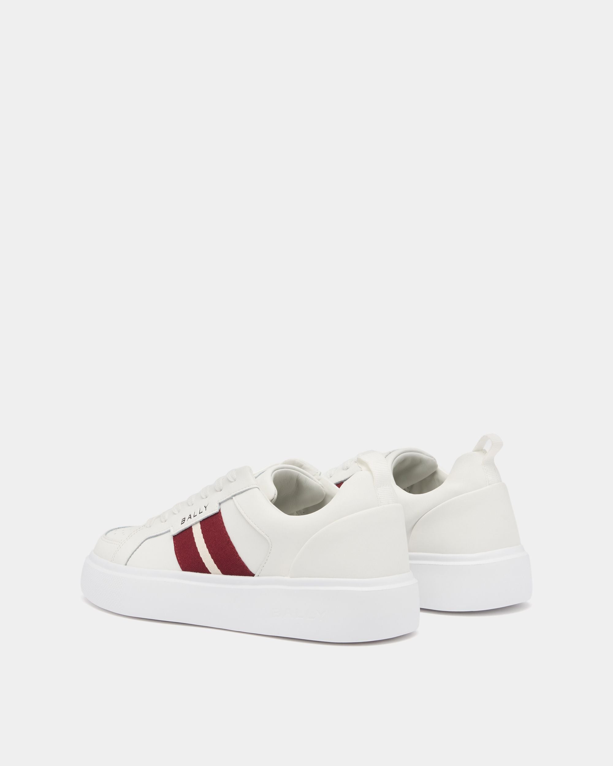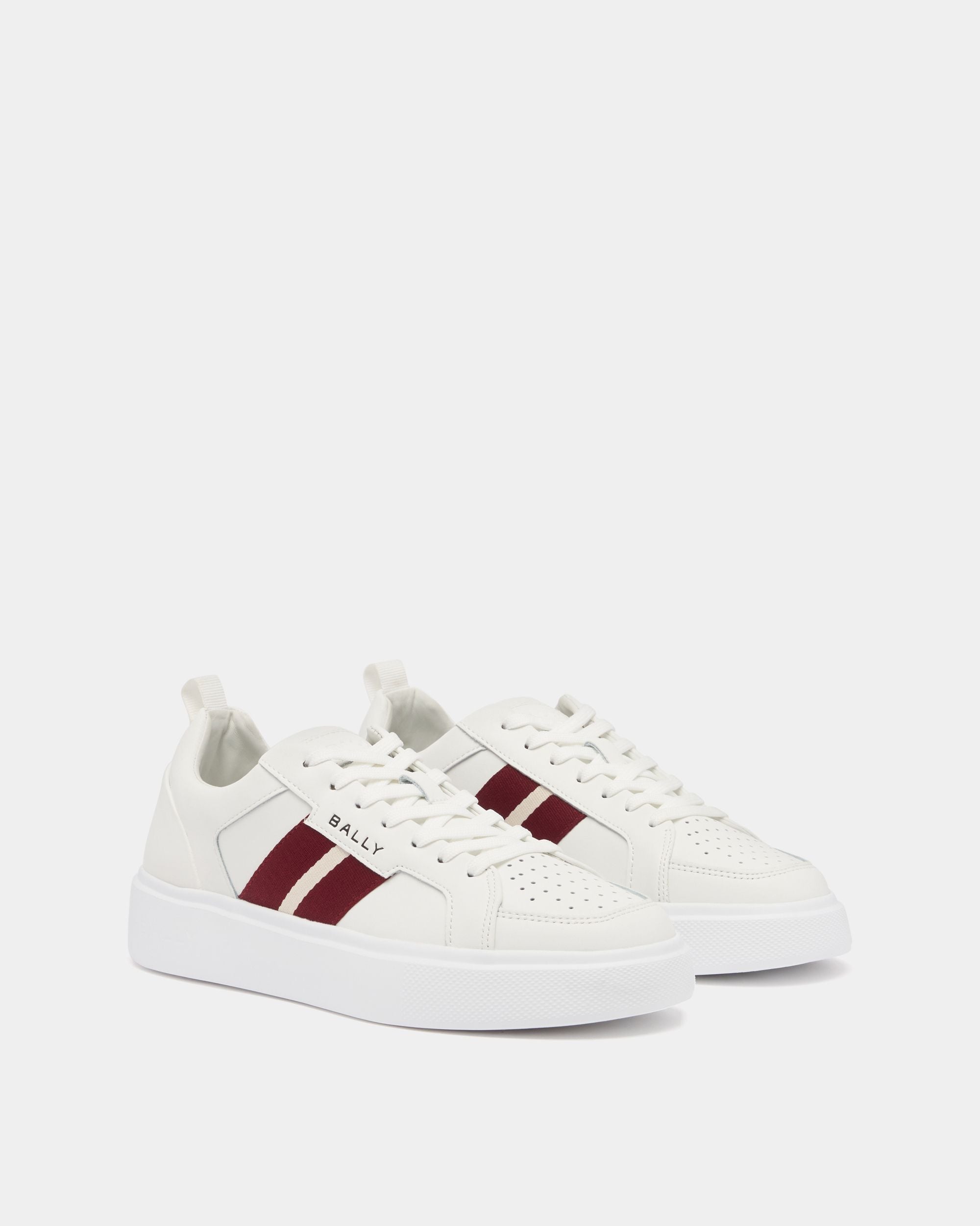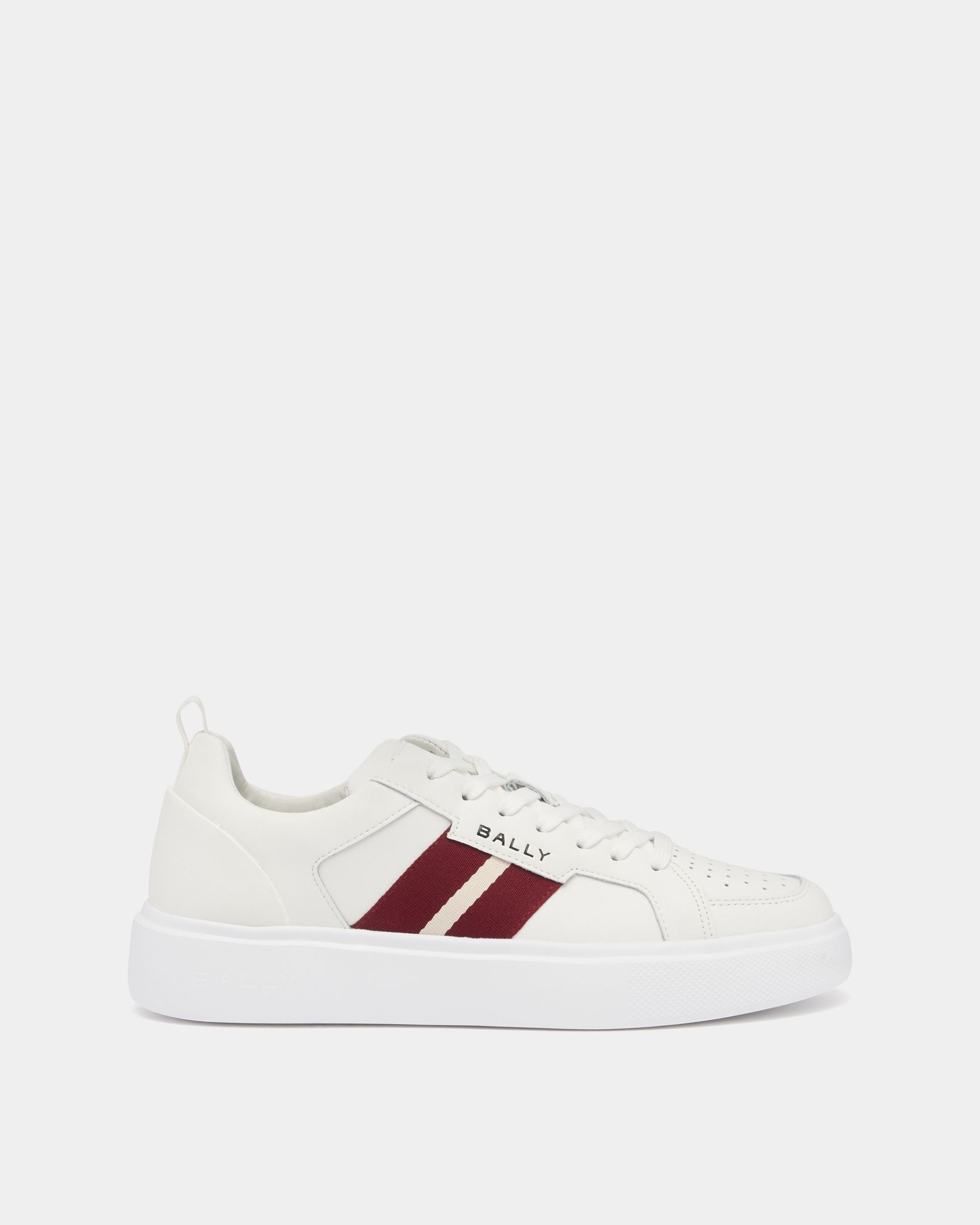 Blayze sneaker in white calfskin with a Bally Ribbon detail and a rubber sole. Additional details include perforations on the toe and a pull tab at the heel.