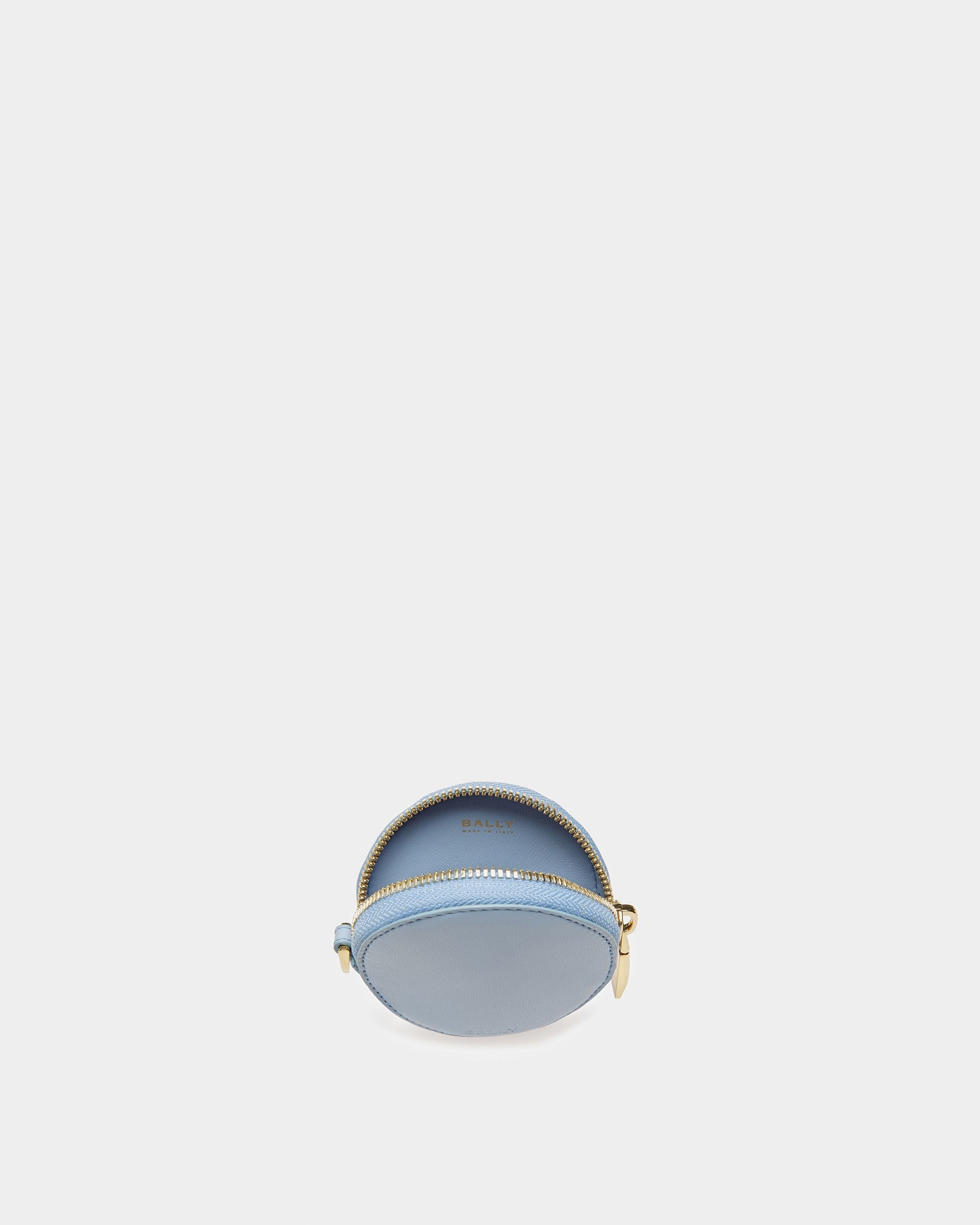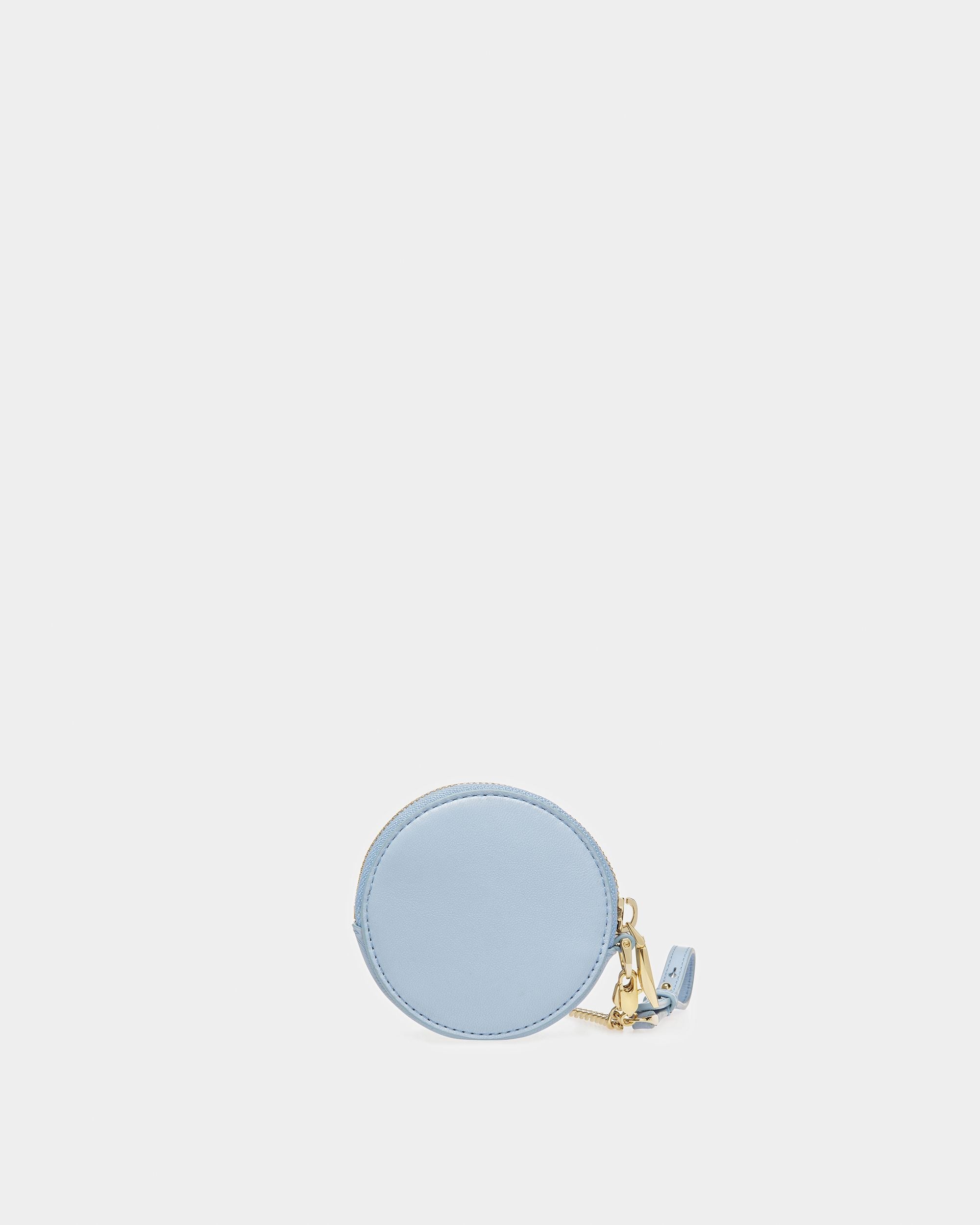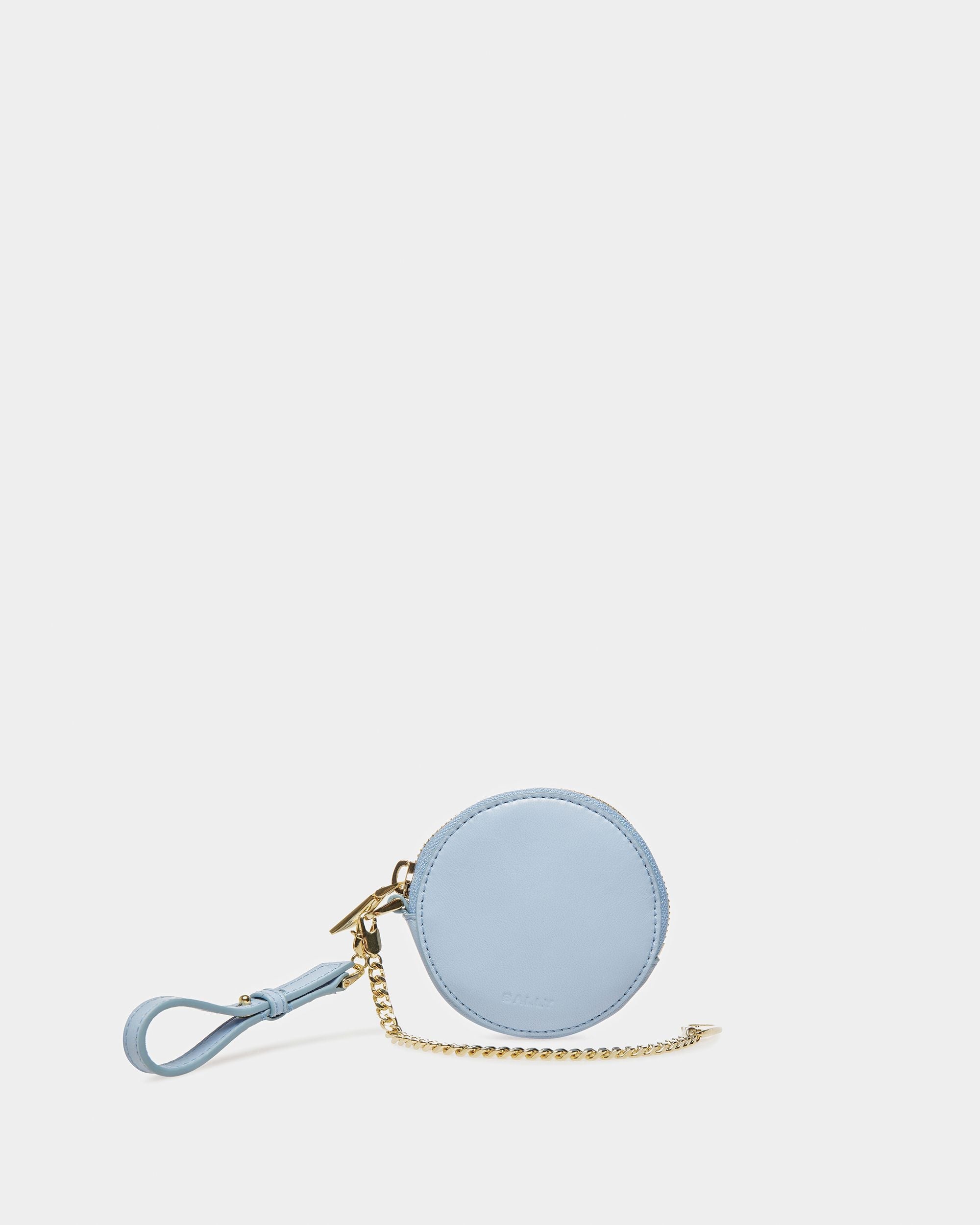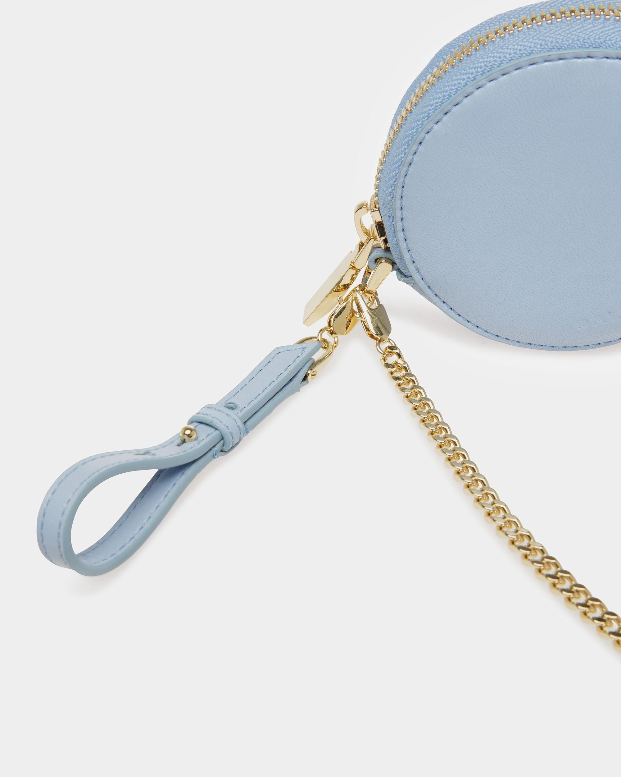 In a circular silhouette. this compact coin purse fastens via a zipper. A detachable metal chain adds a contemporary touch. and a small hook allows it to be attached to bags or pants.