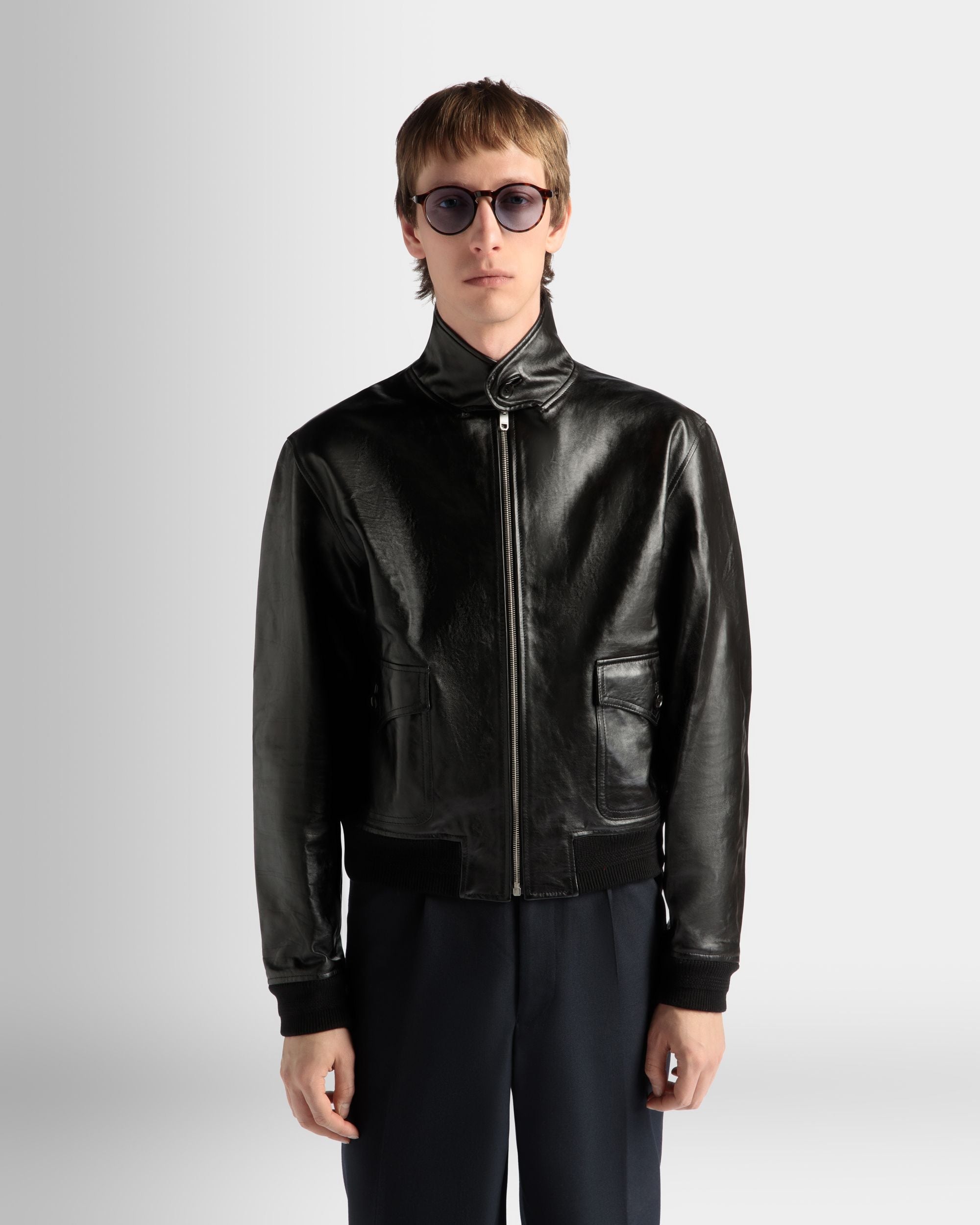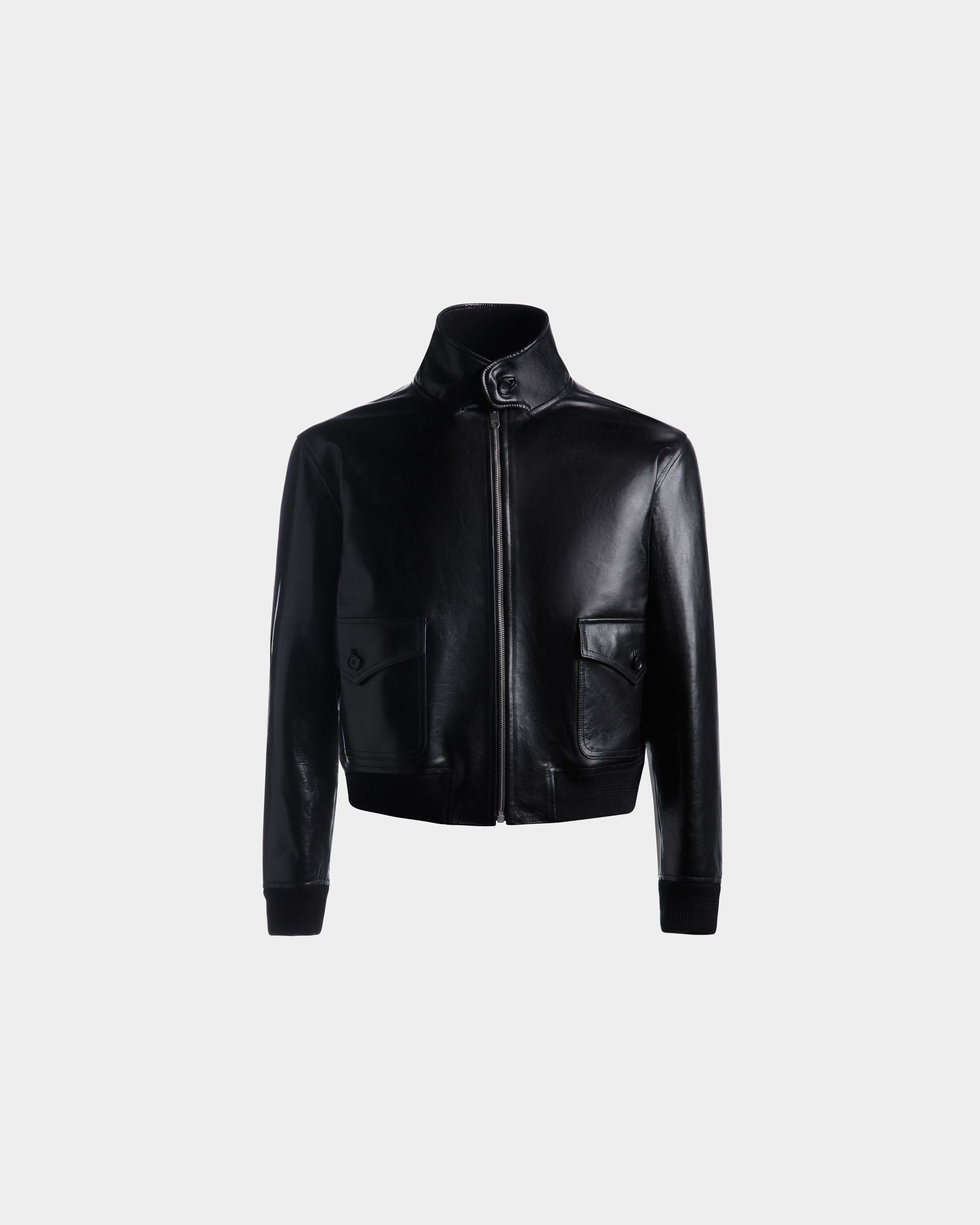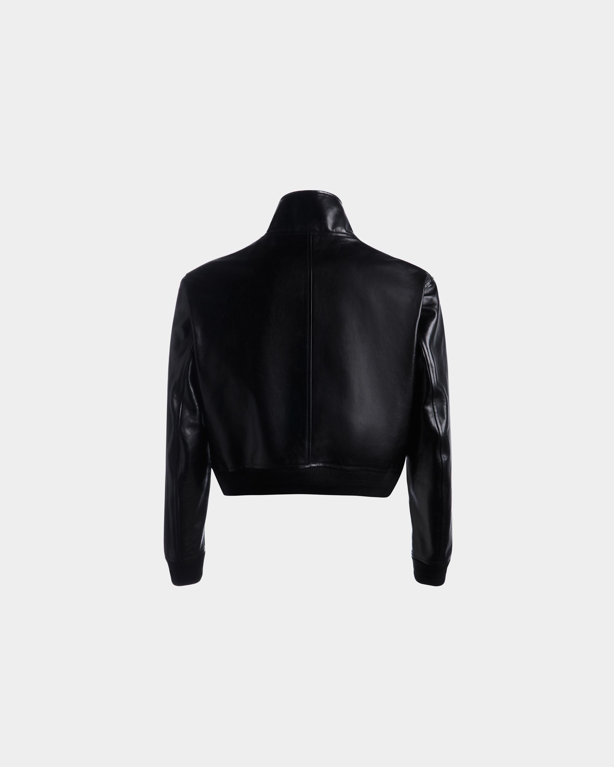 The perfect blend of edgy and sophisticated. this black leather blouson jacket is cropped for a modern silhouette. A button tab on the collar and metal zipper at the front help protect from the elements.