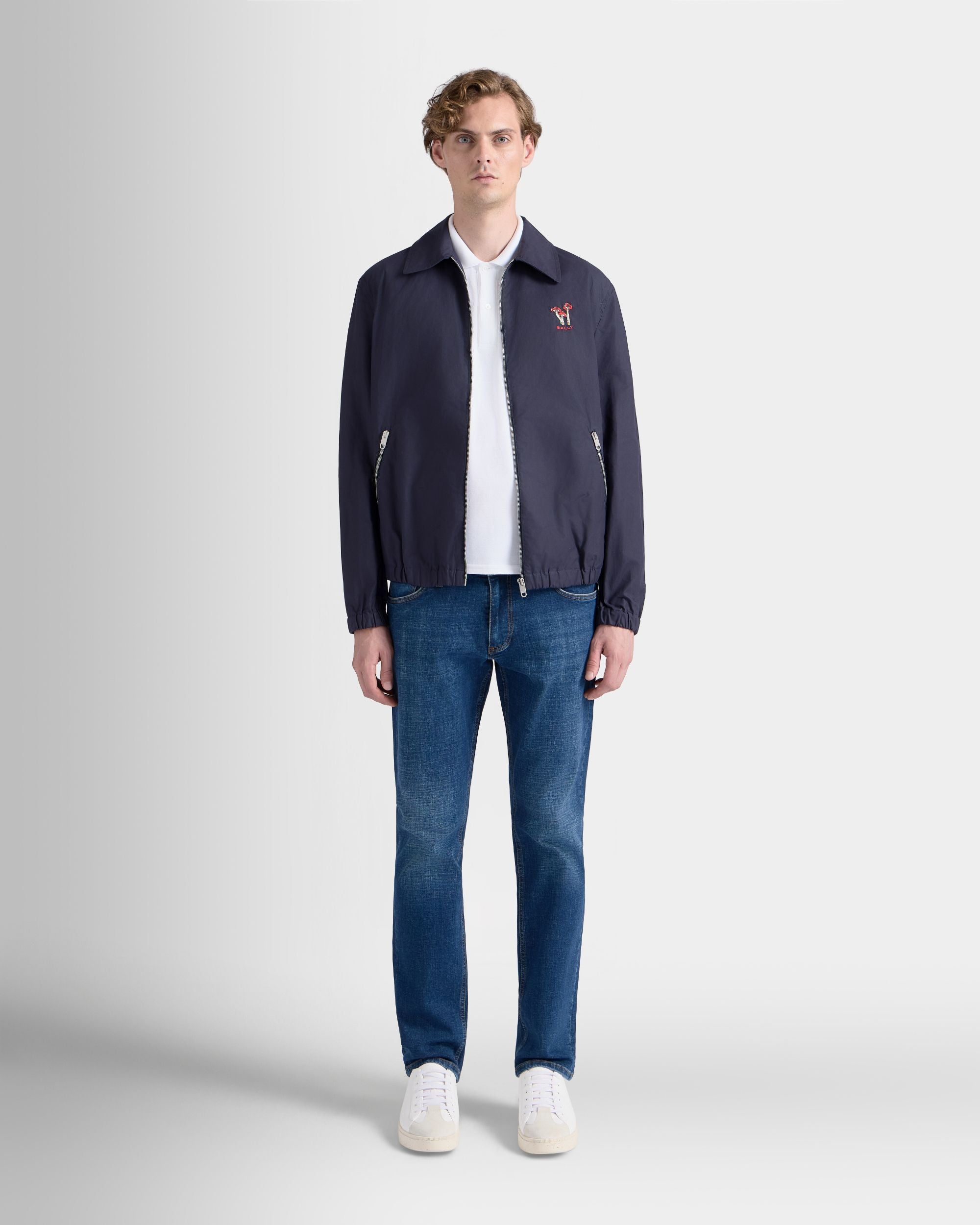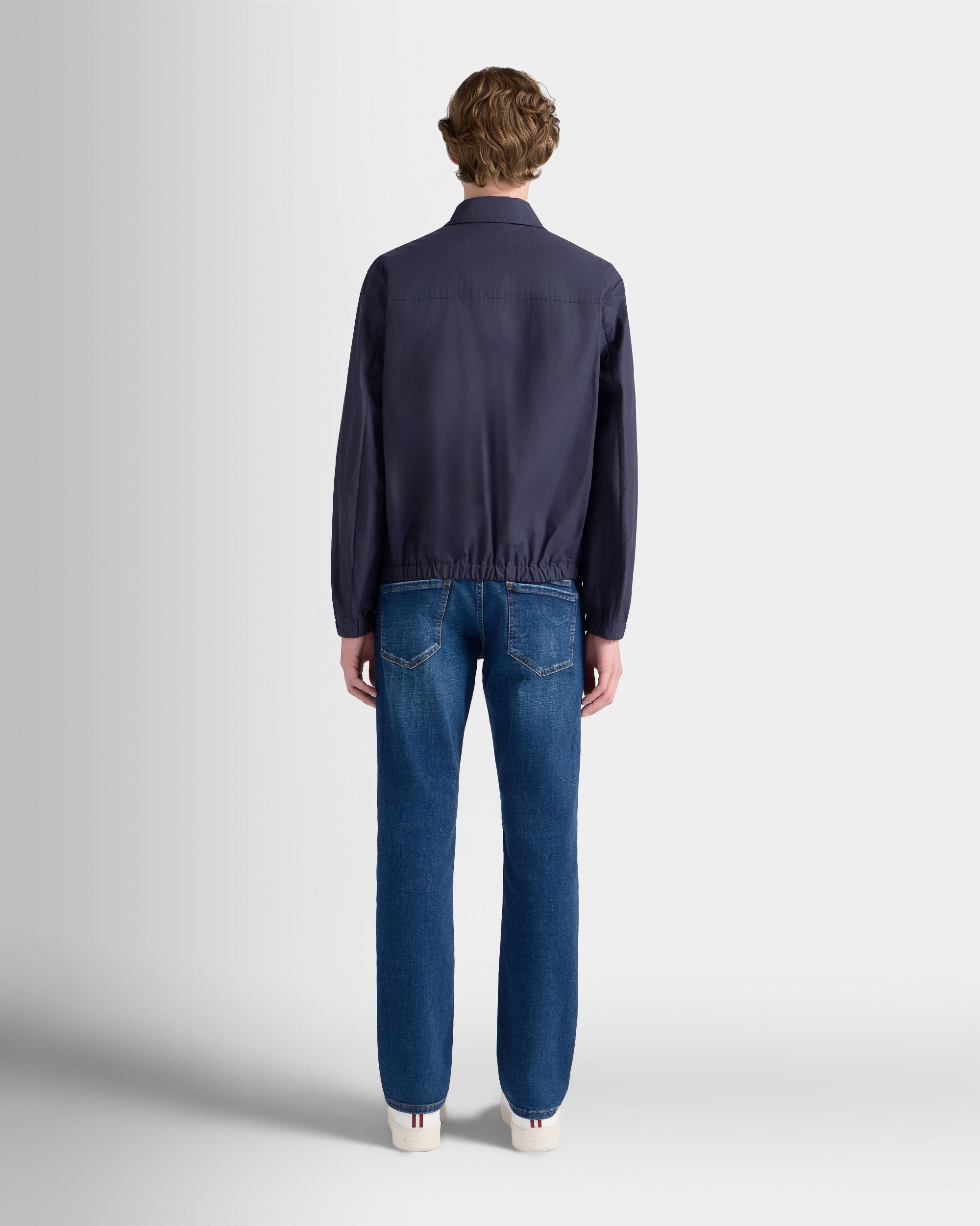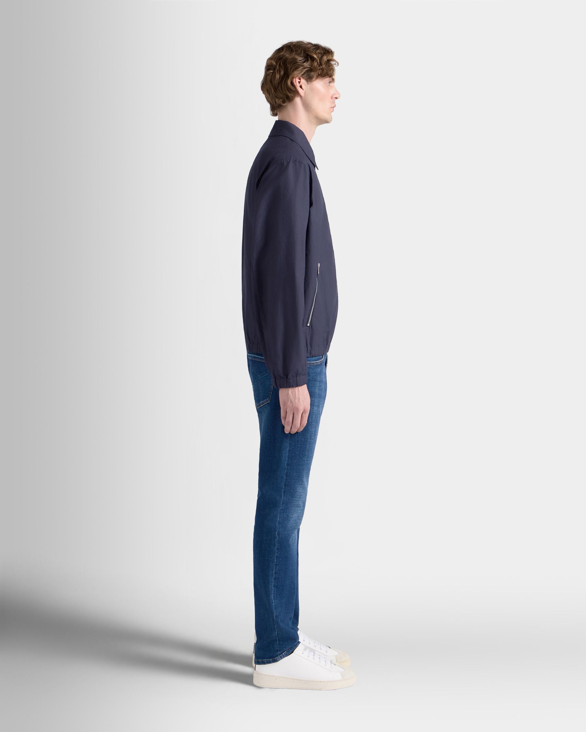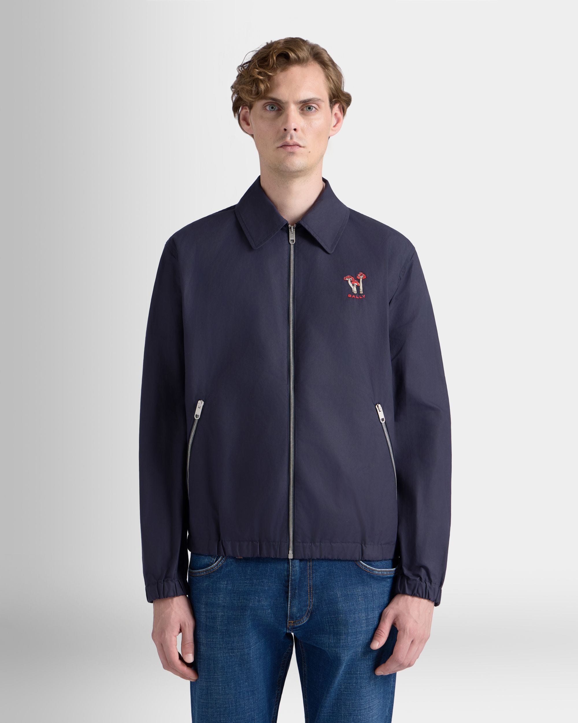 This navy blue blouson is made from 100% cotton poplin with a light wax finish for water resistance and a crinkled texture. The closure and two front pockets are secured by metal zippers.