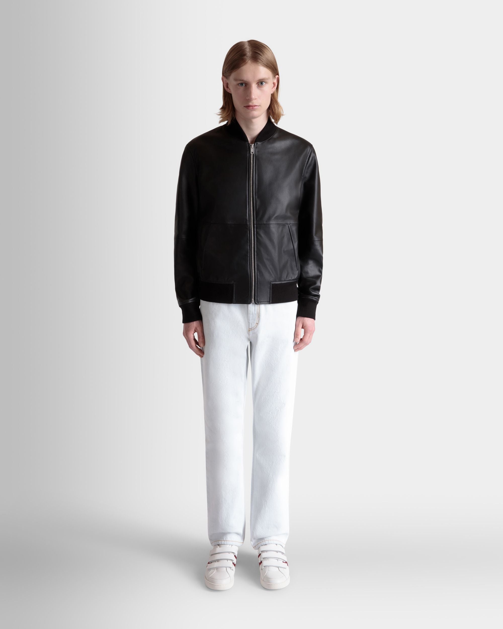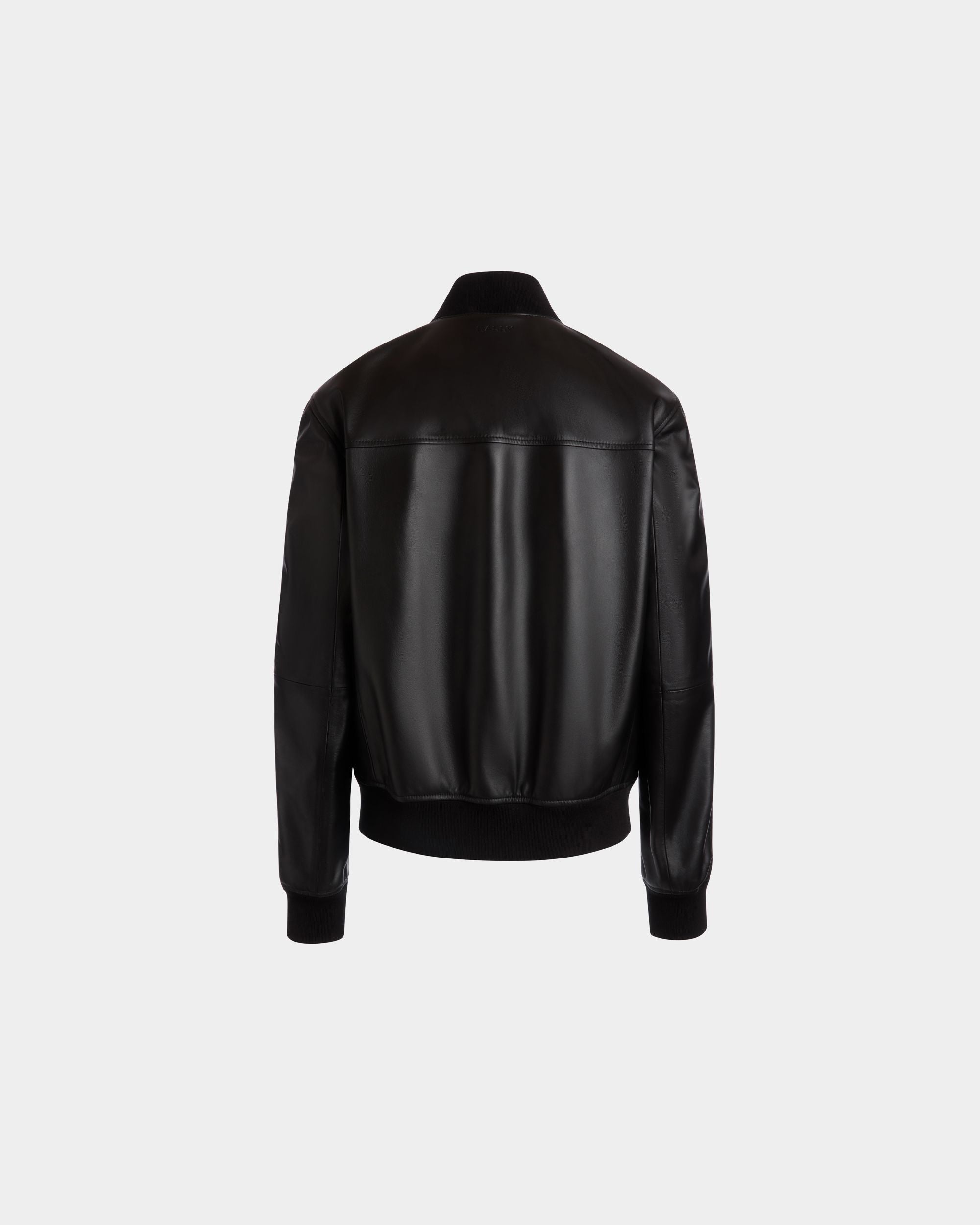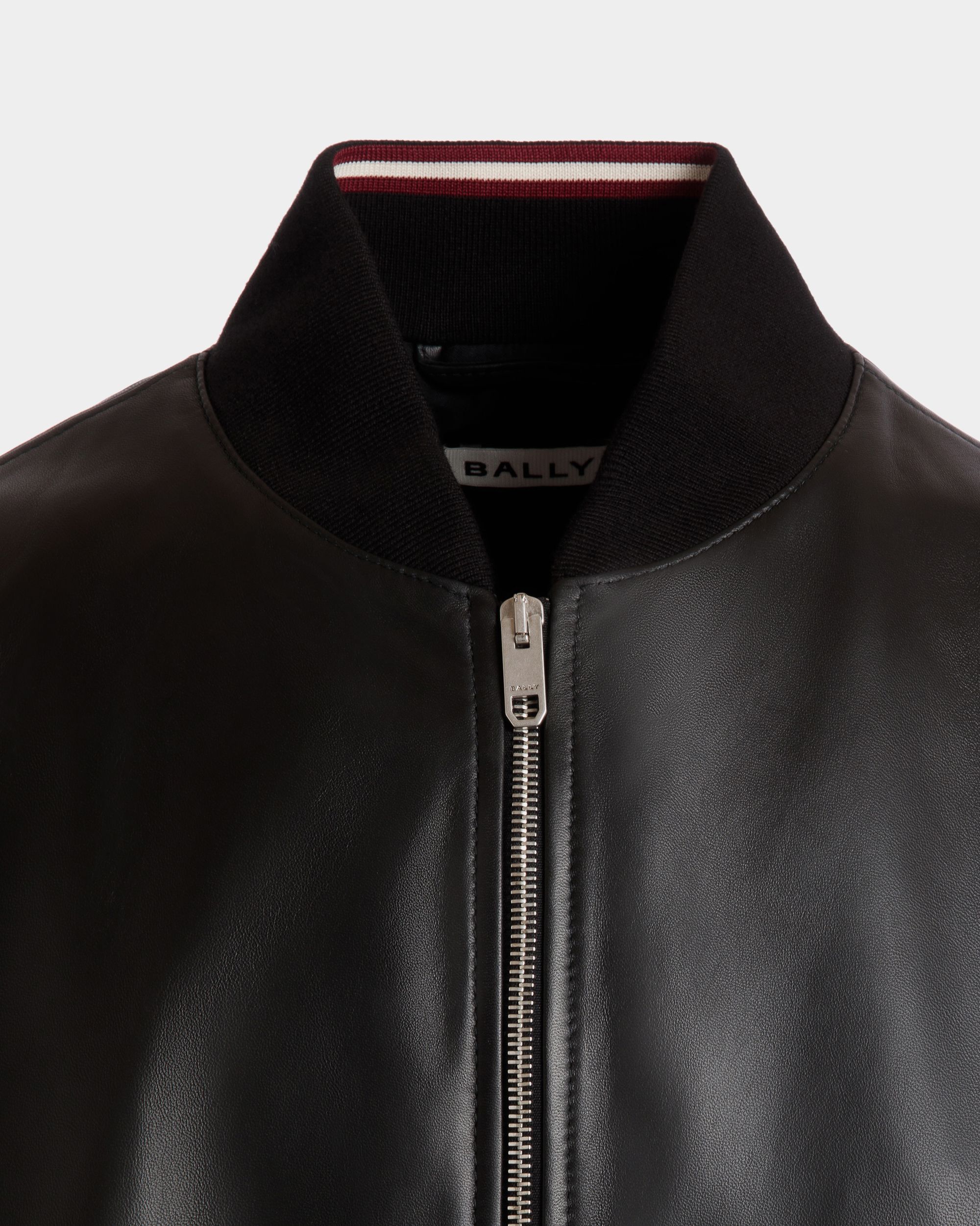 Cool and essential. this bomber jacket in black Nappa lambskin is fastened at the front by a metal zipper. Stretch knit fabric trims the cuffs. lower hem and collar. which is embellished by a red and white Bally Ribbon on the inside.