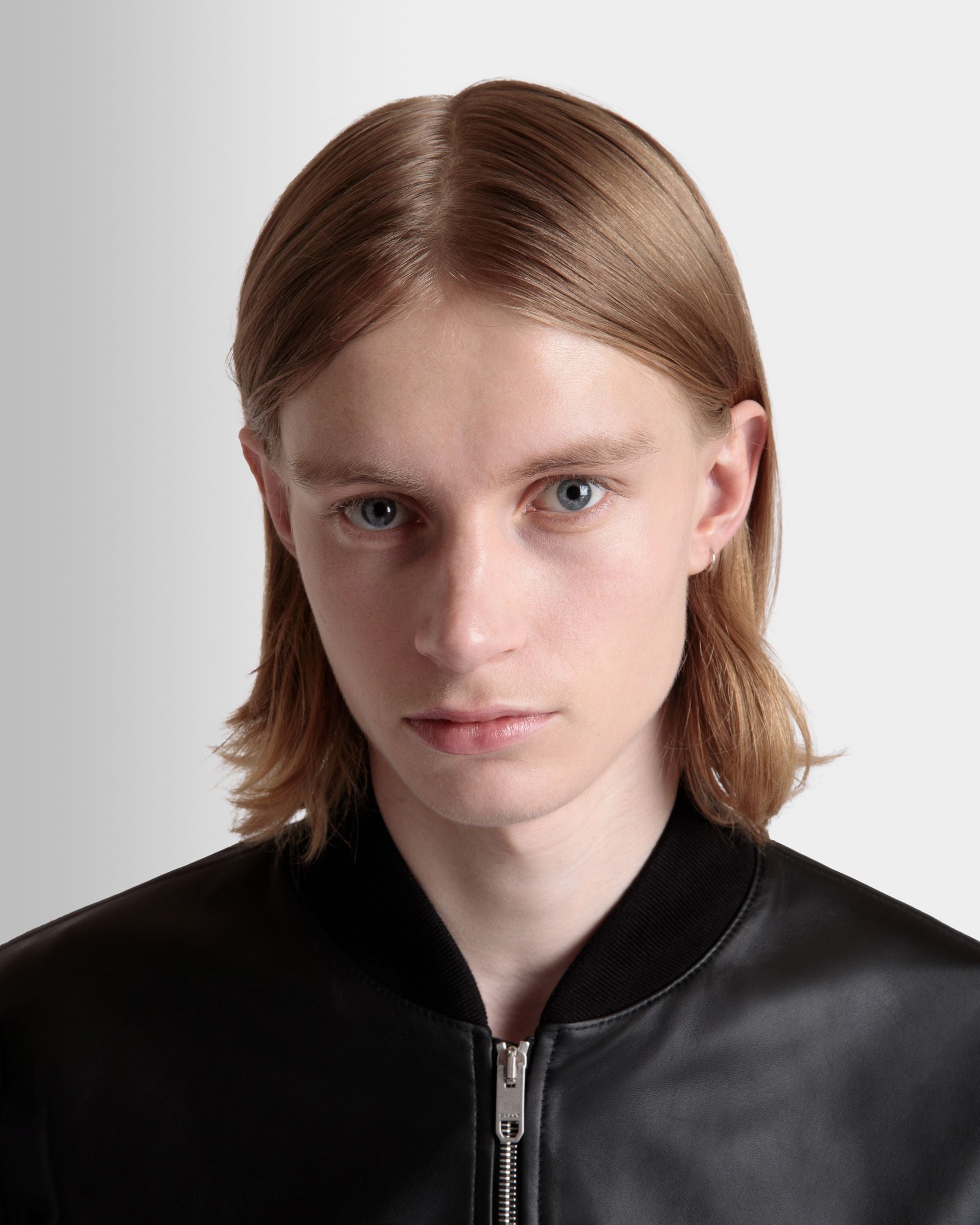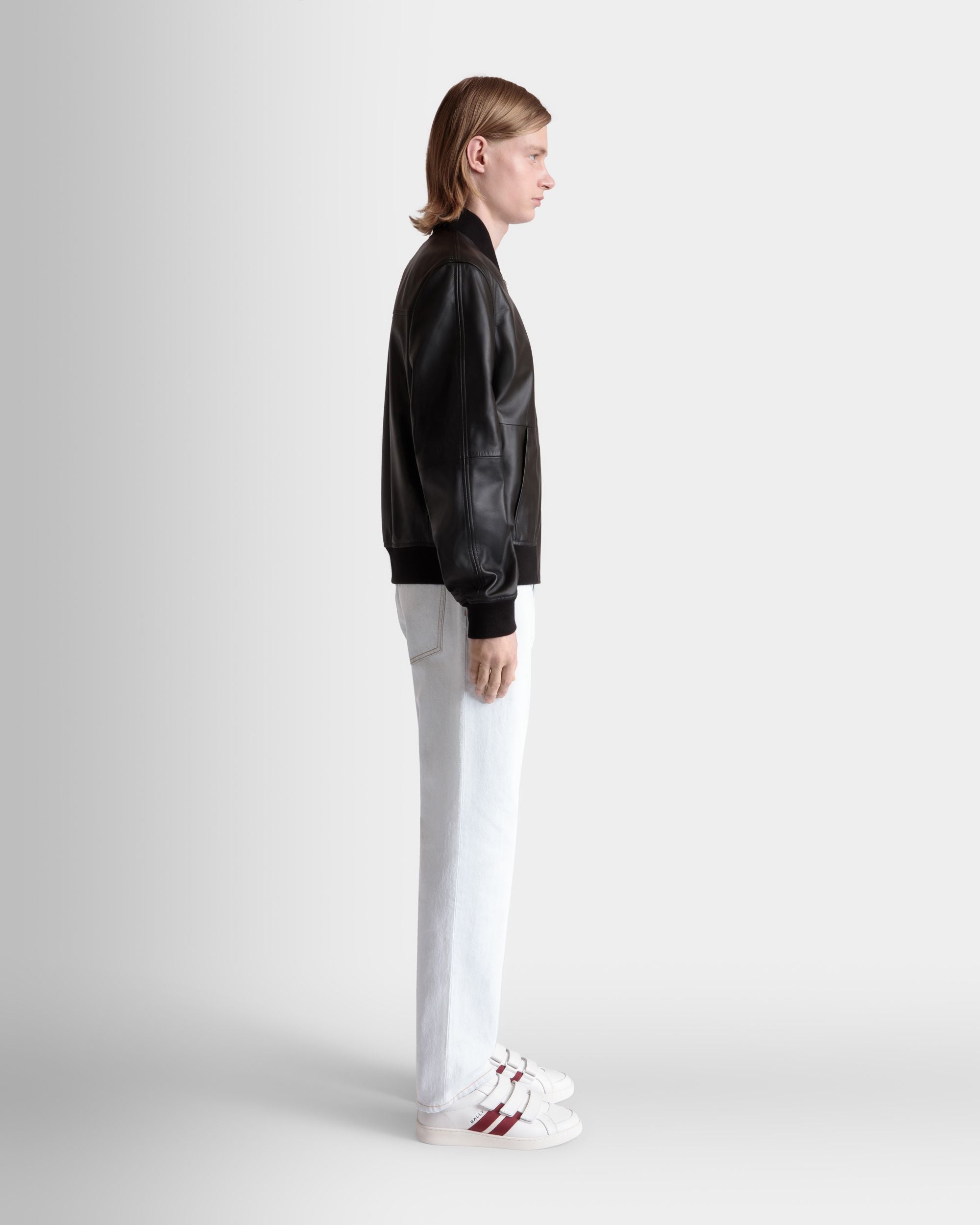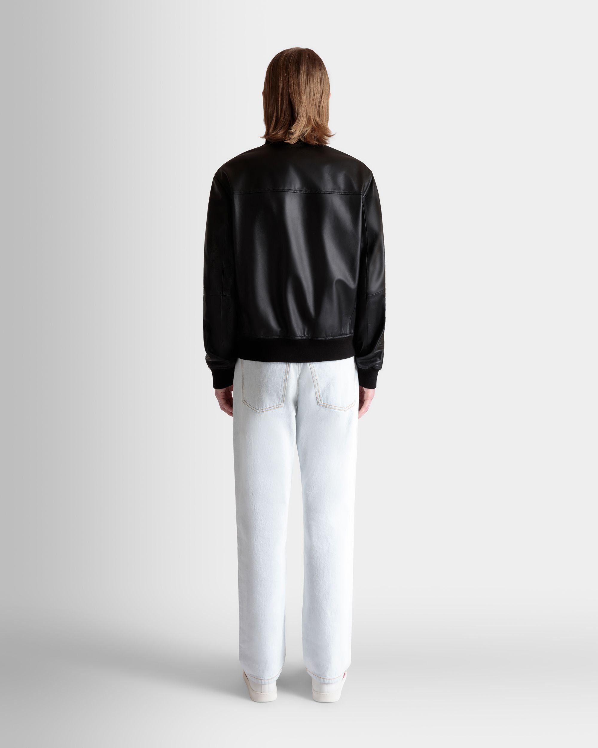 Cool and essential. this bomber jacket in black Nappa lambskin is fastened at the front by a metal zipper. Stretch knit fabric trims the cuffs. lower hem and collar. which is embellished by a red and white Bally Ribbon on the inside.