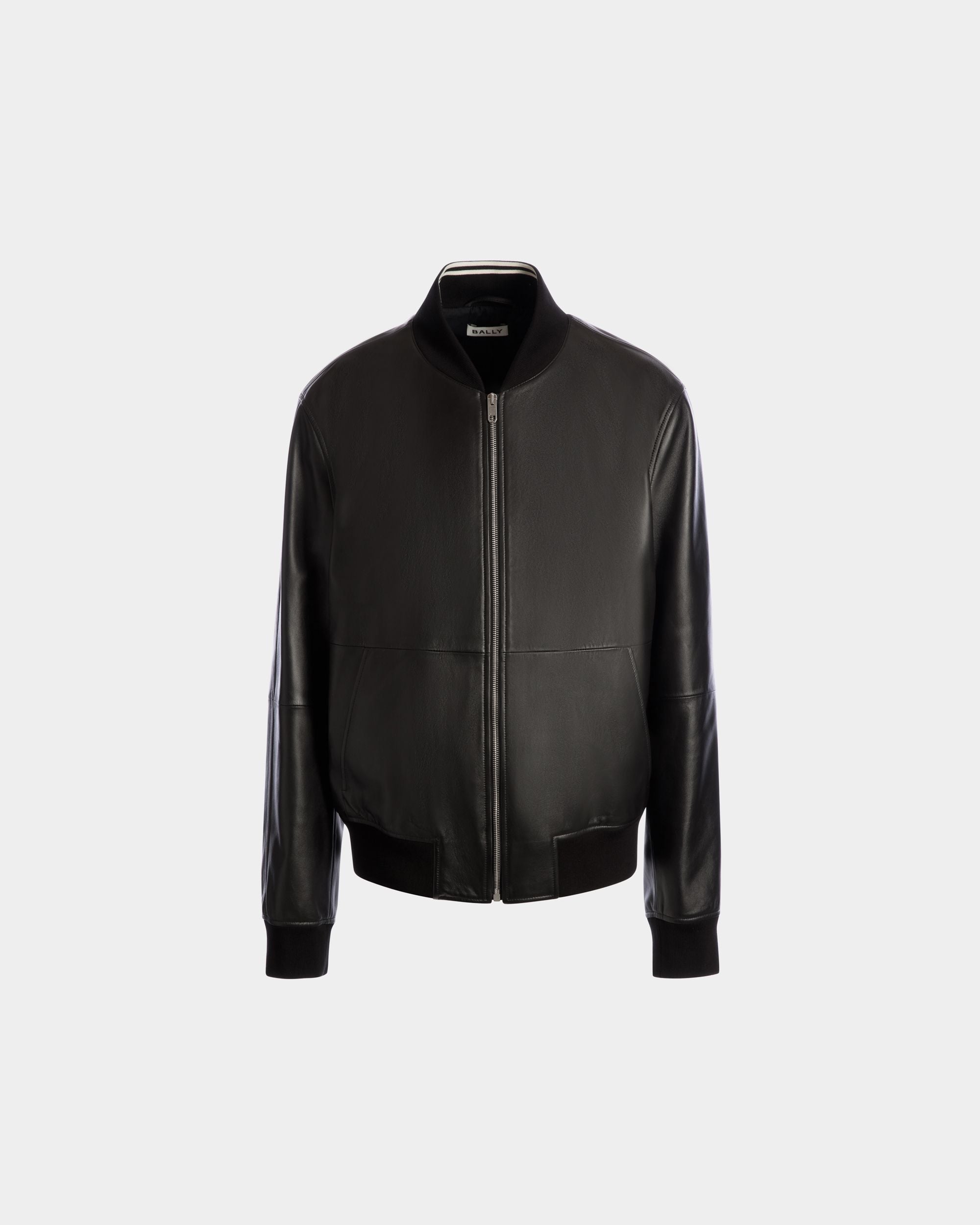 Cool and essential. this bomber jacket in buttery soft Nappa lambskin is fastened at the front by a metal zipper. Stretch knit fabric trims the cuffs. lower hem and collar. which is embellished by a black and white Bally Ribbon on the inside.