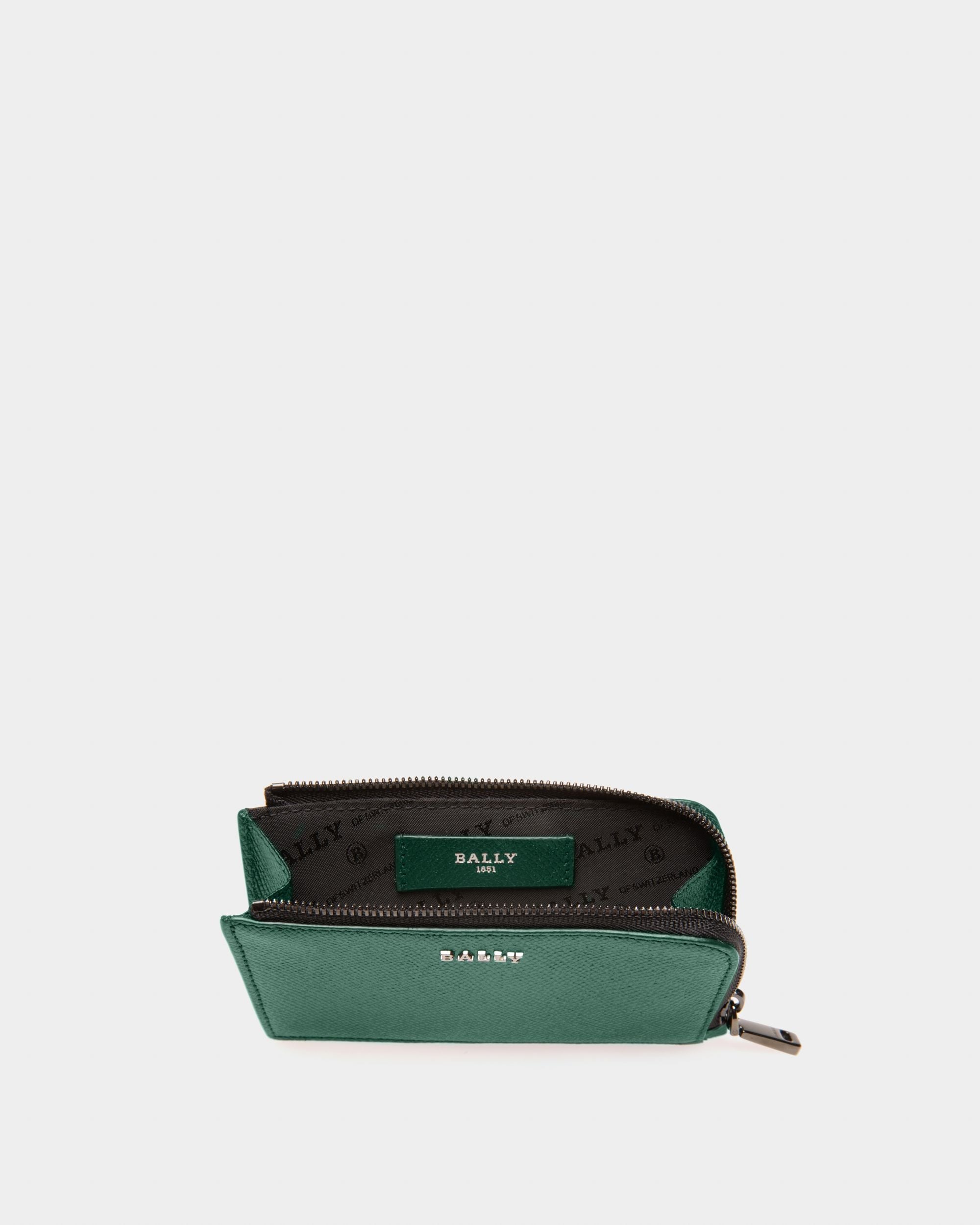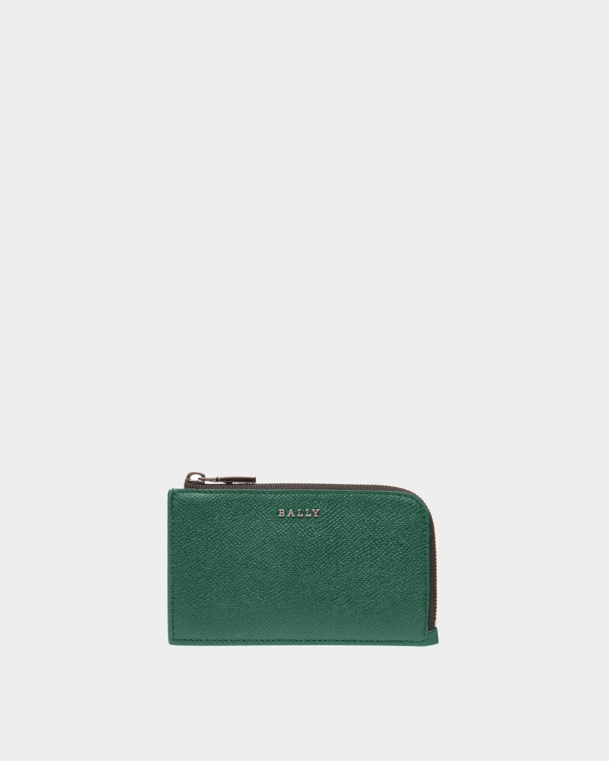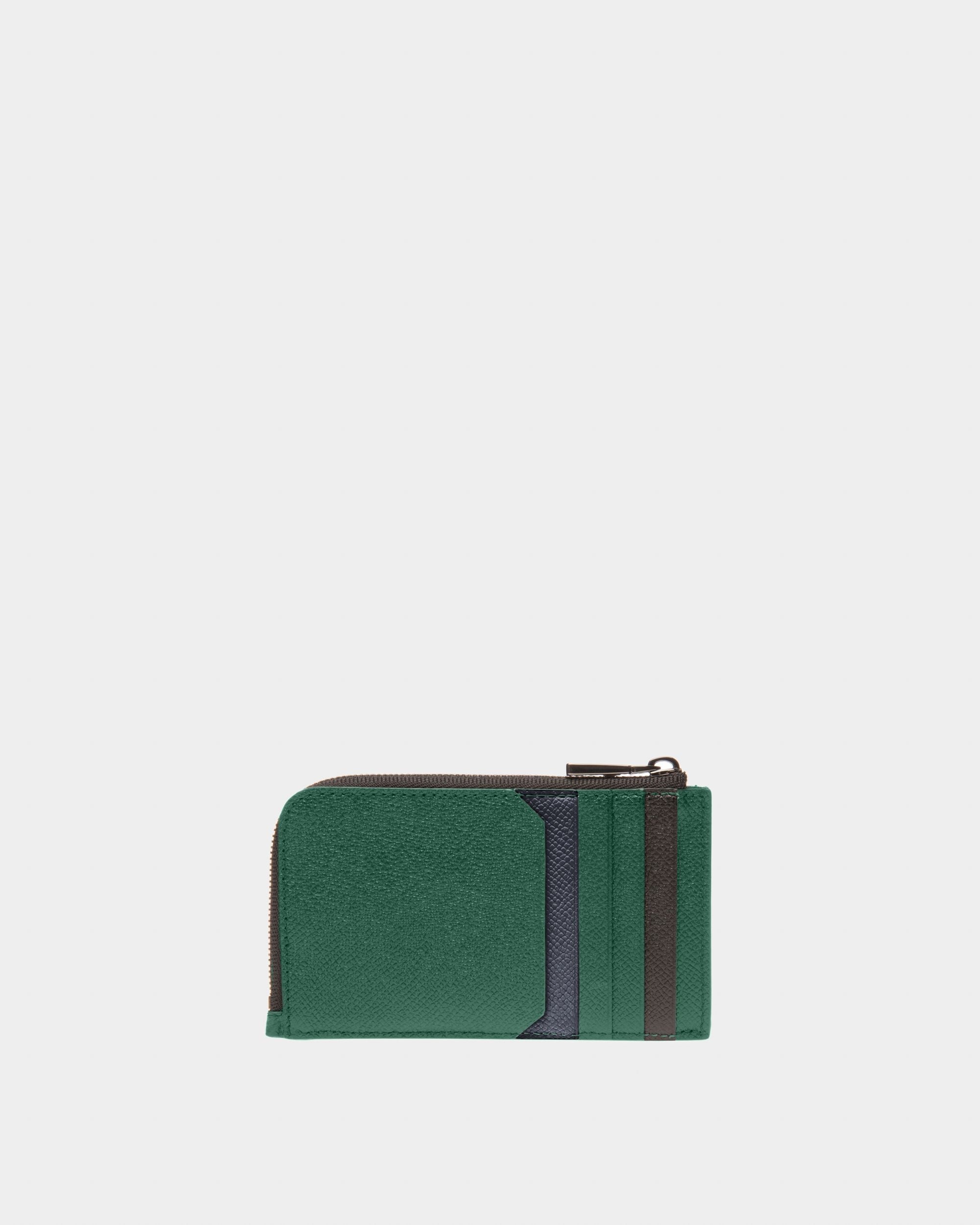 The Bord card holder is crafted from green leather with contrasting accents in black and navy. It features a top zip closure. internal flat pocket and card slots at the rear.