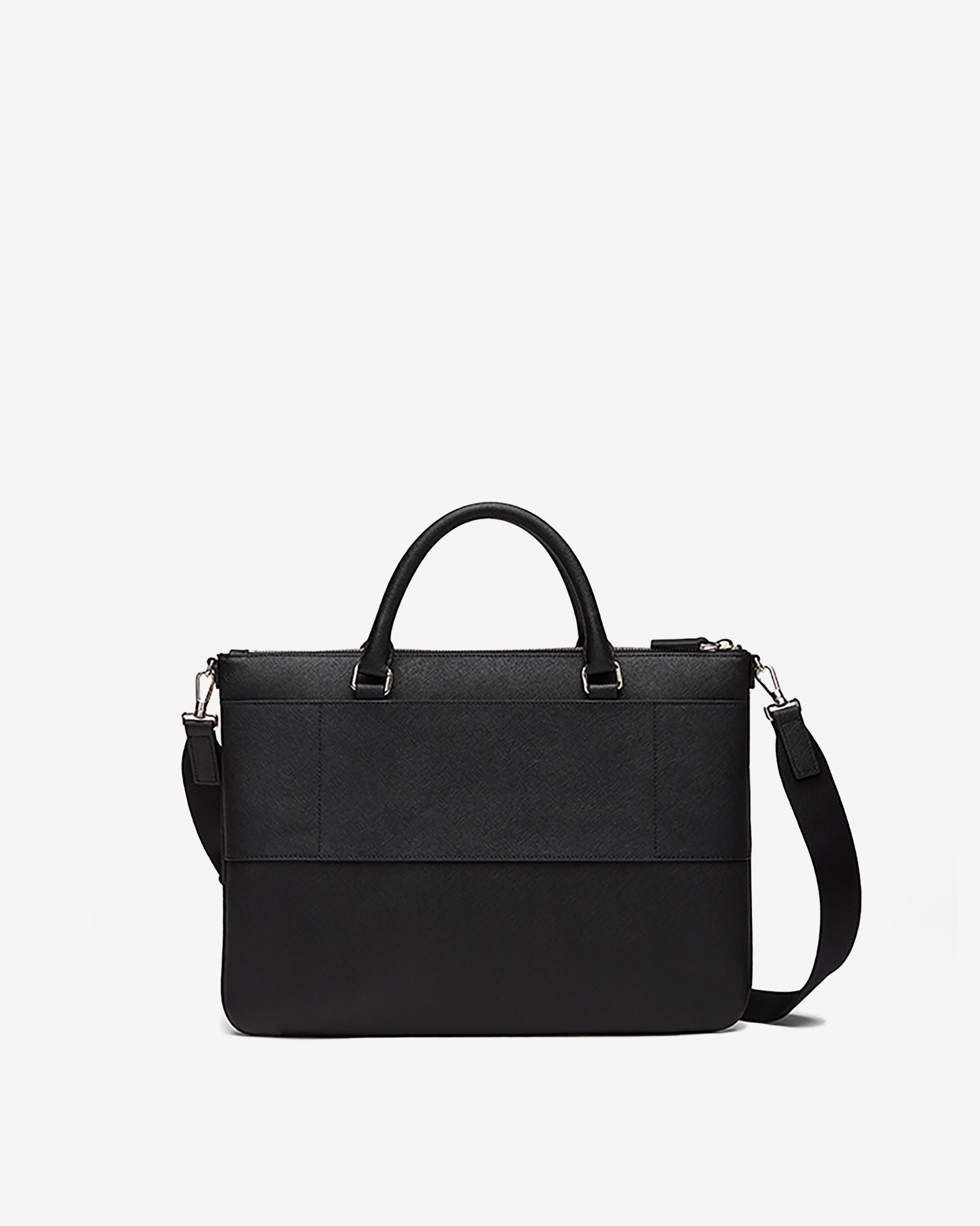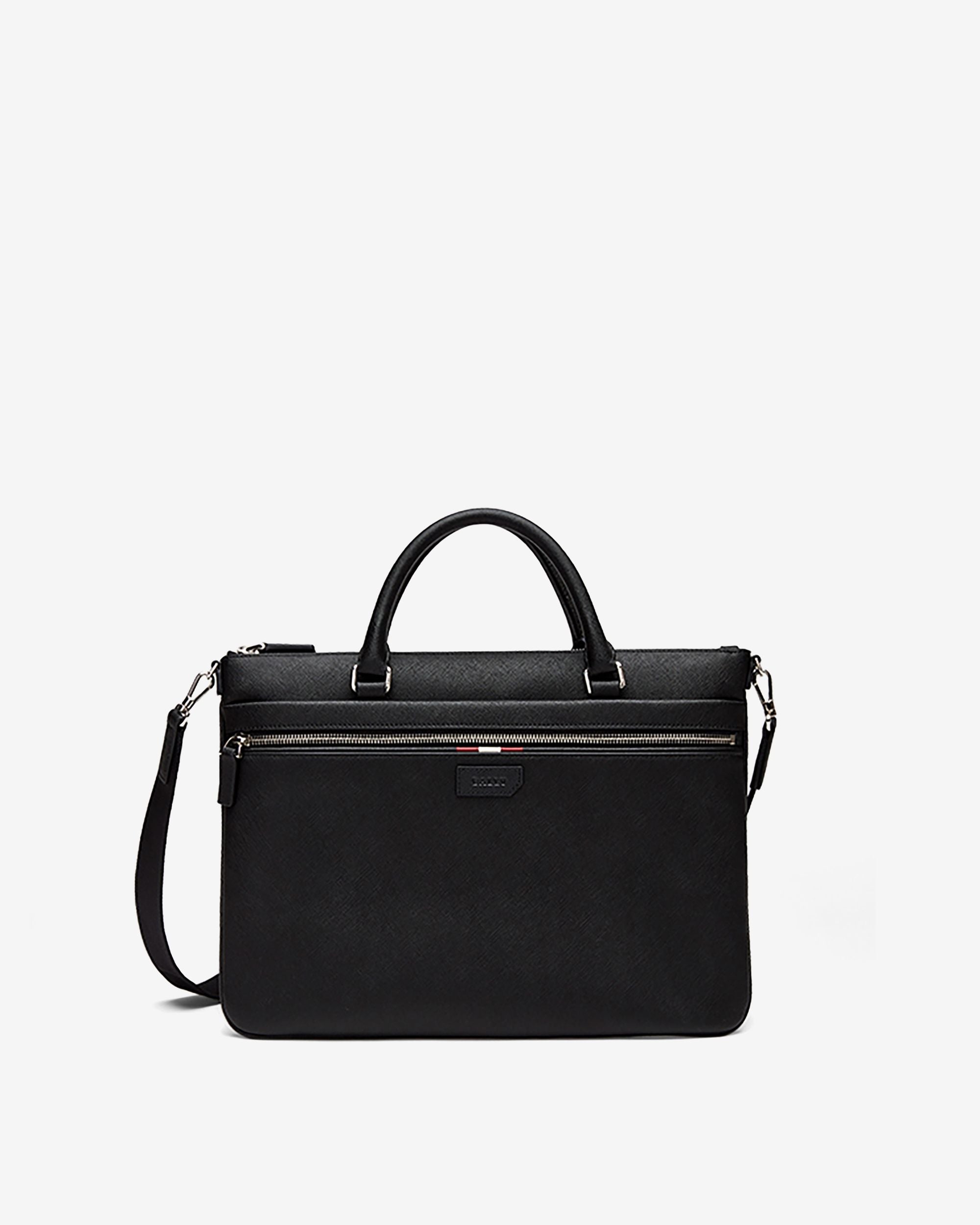 This briefcase in black leather is elevated by textural embossing. giving rise to a refined finish that ensures longevity. Top handles. a shoulder strap and a zipped front pocket ensure versatility.