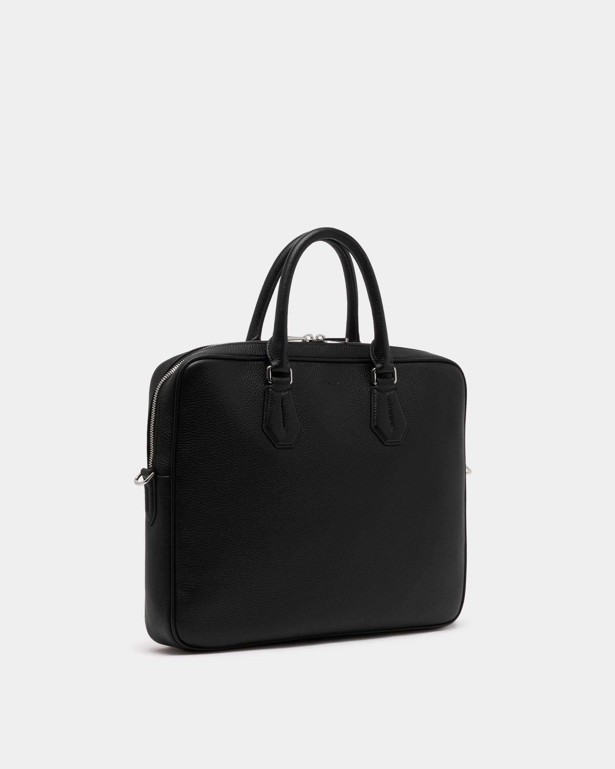 This briefcase is made from durable grained leather. It is detailed with a debossed Bally logo on the front.