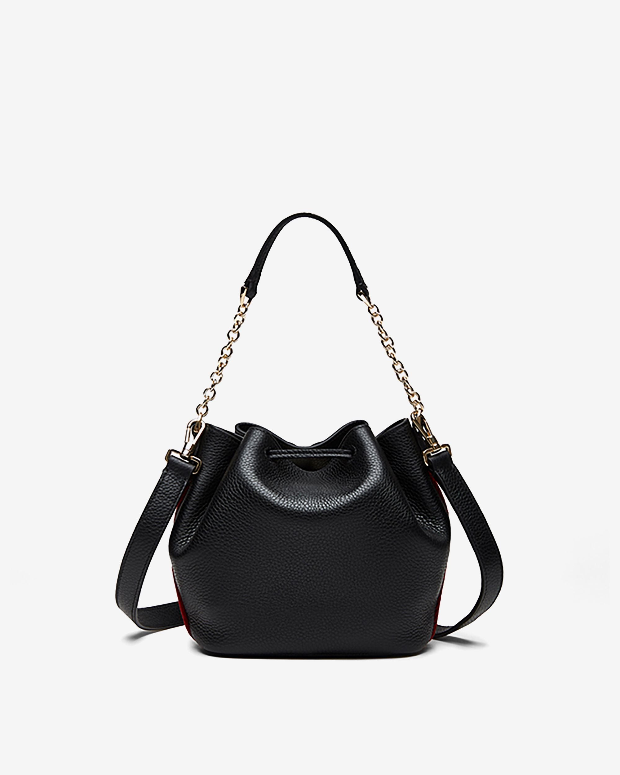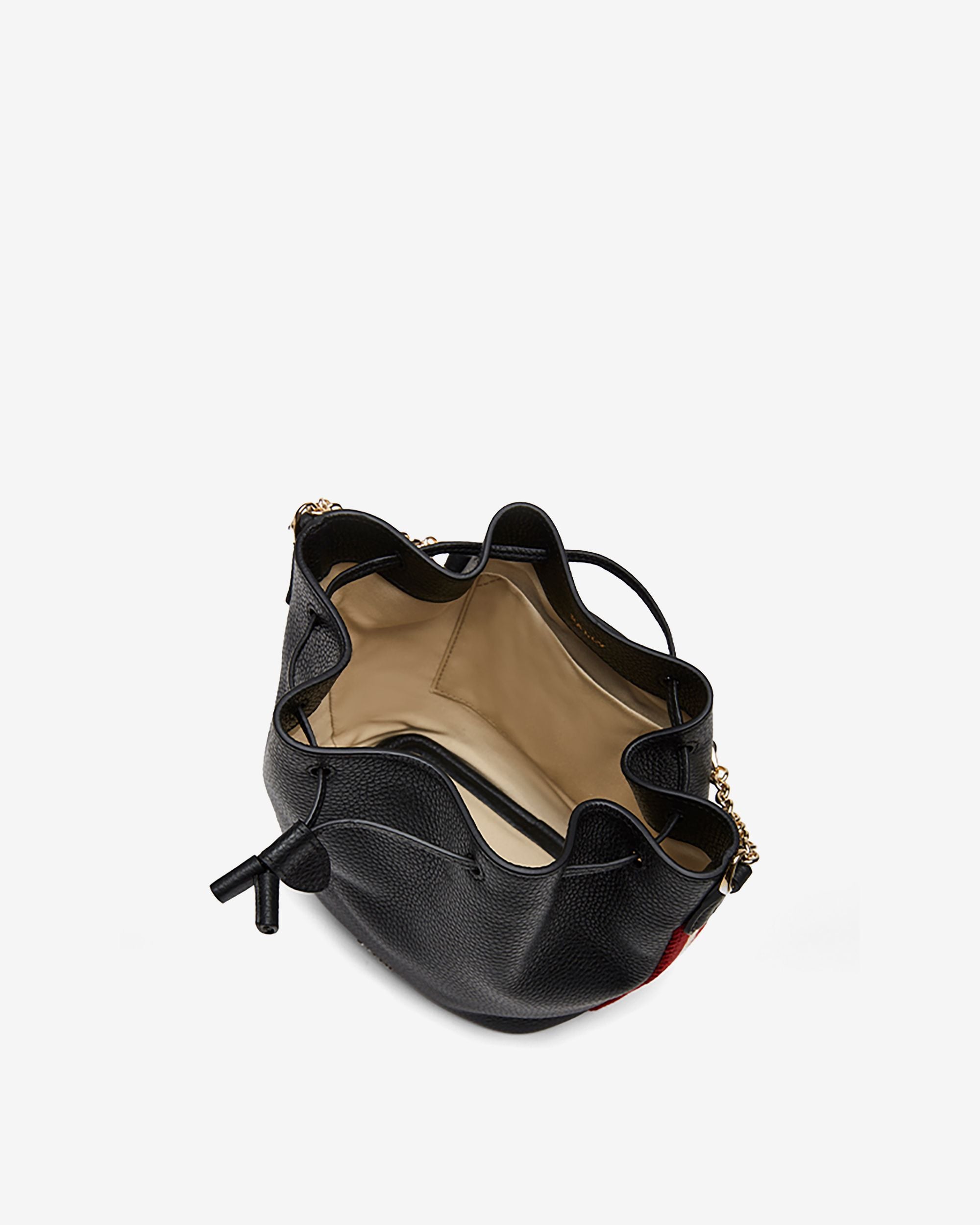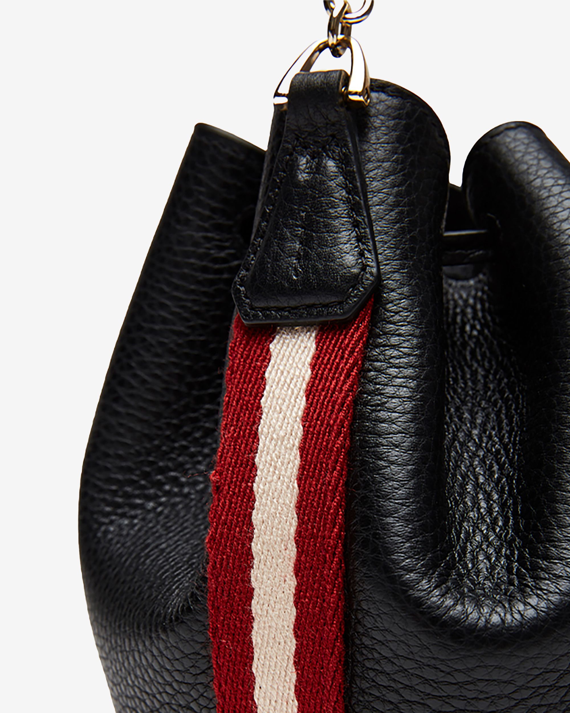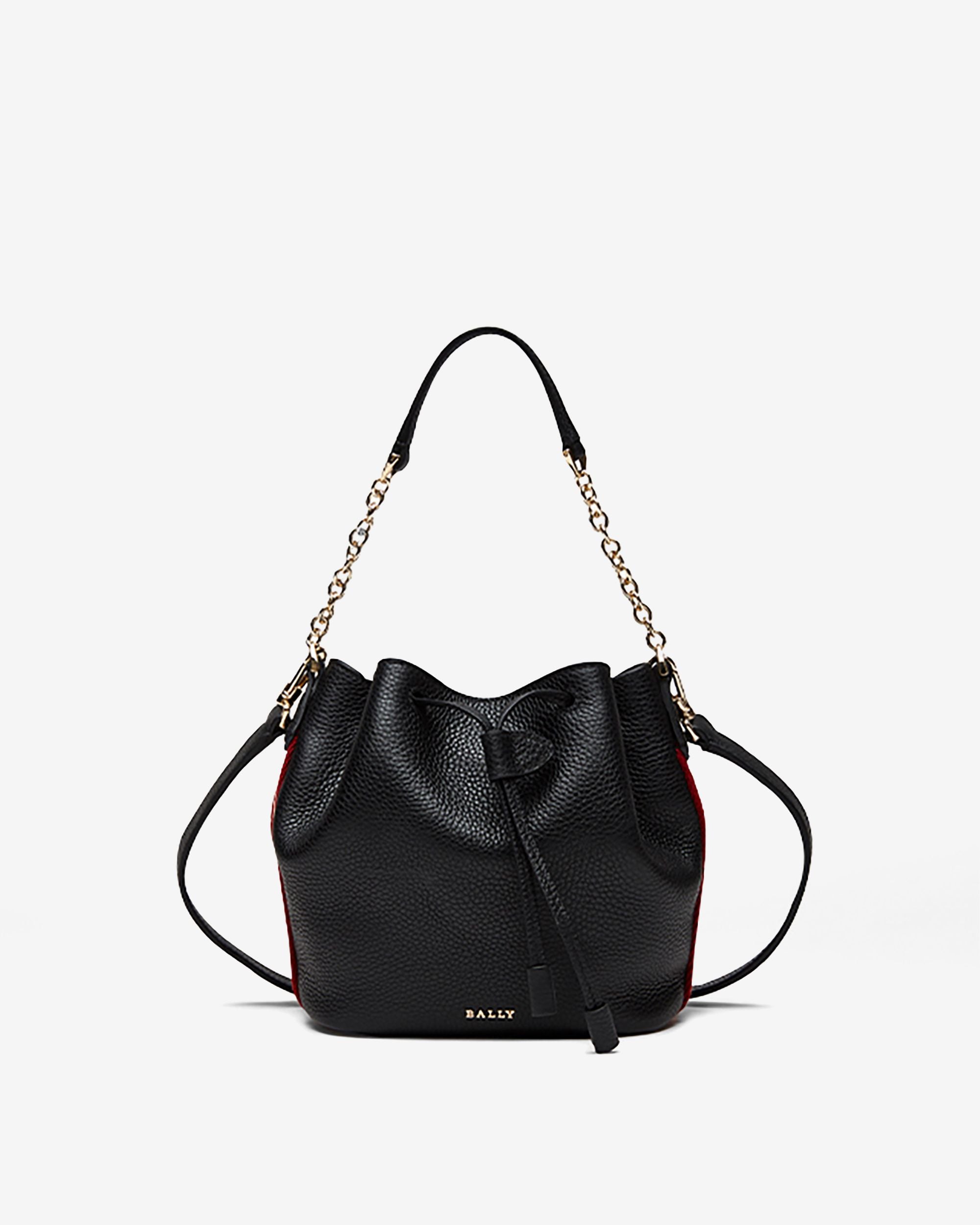 This bucket bag is designed into a compact silhouette in fine black leather with a grained finish and Bally Ribbons at the sides. Gold-tone details. from the Bally logo to the metal chain handle. add a chic touch.