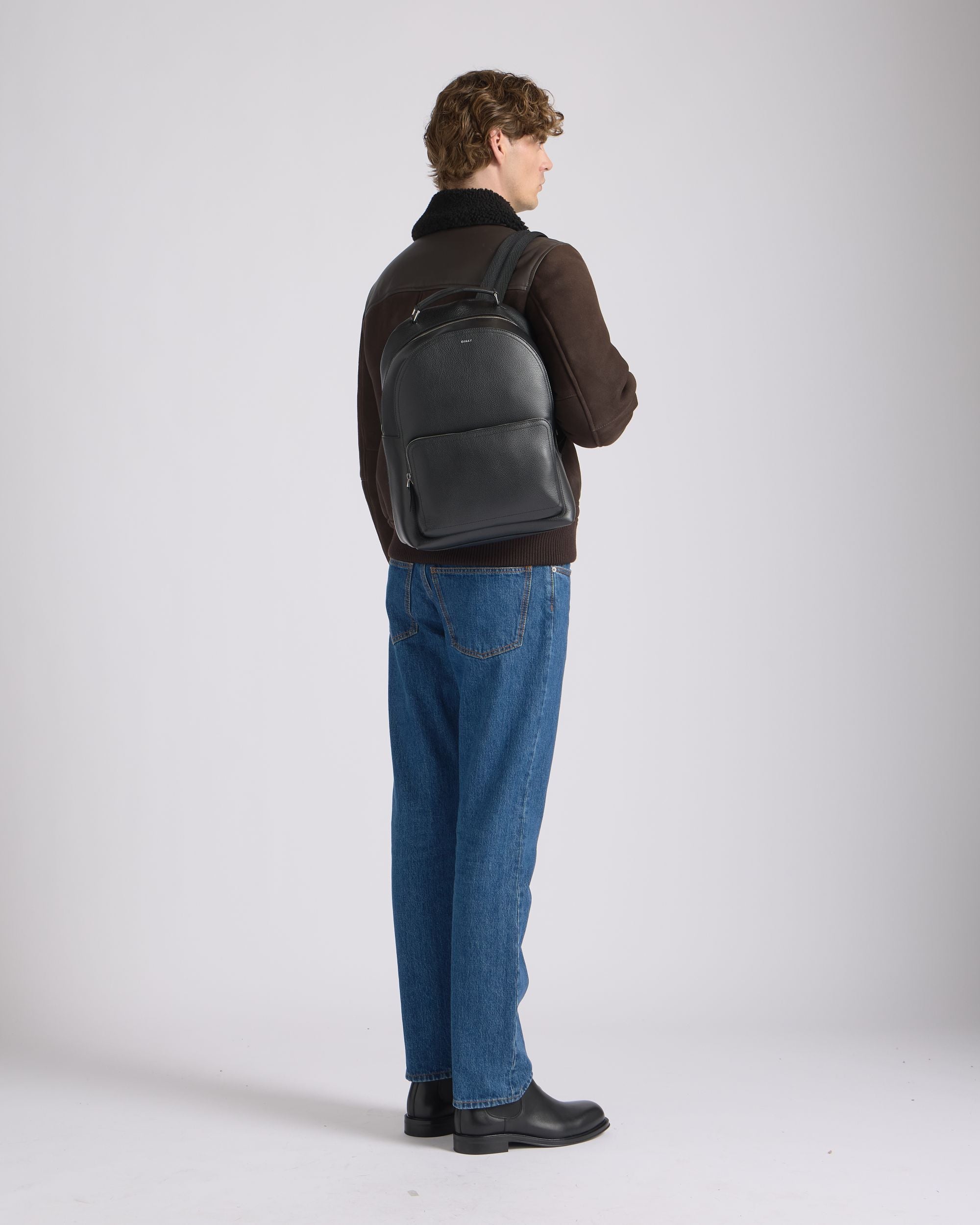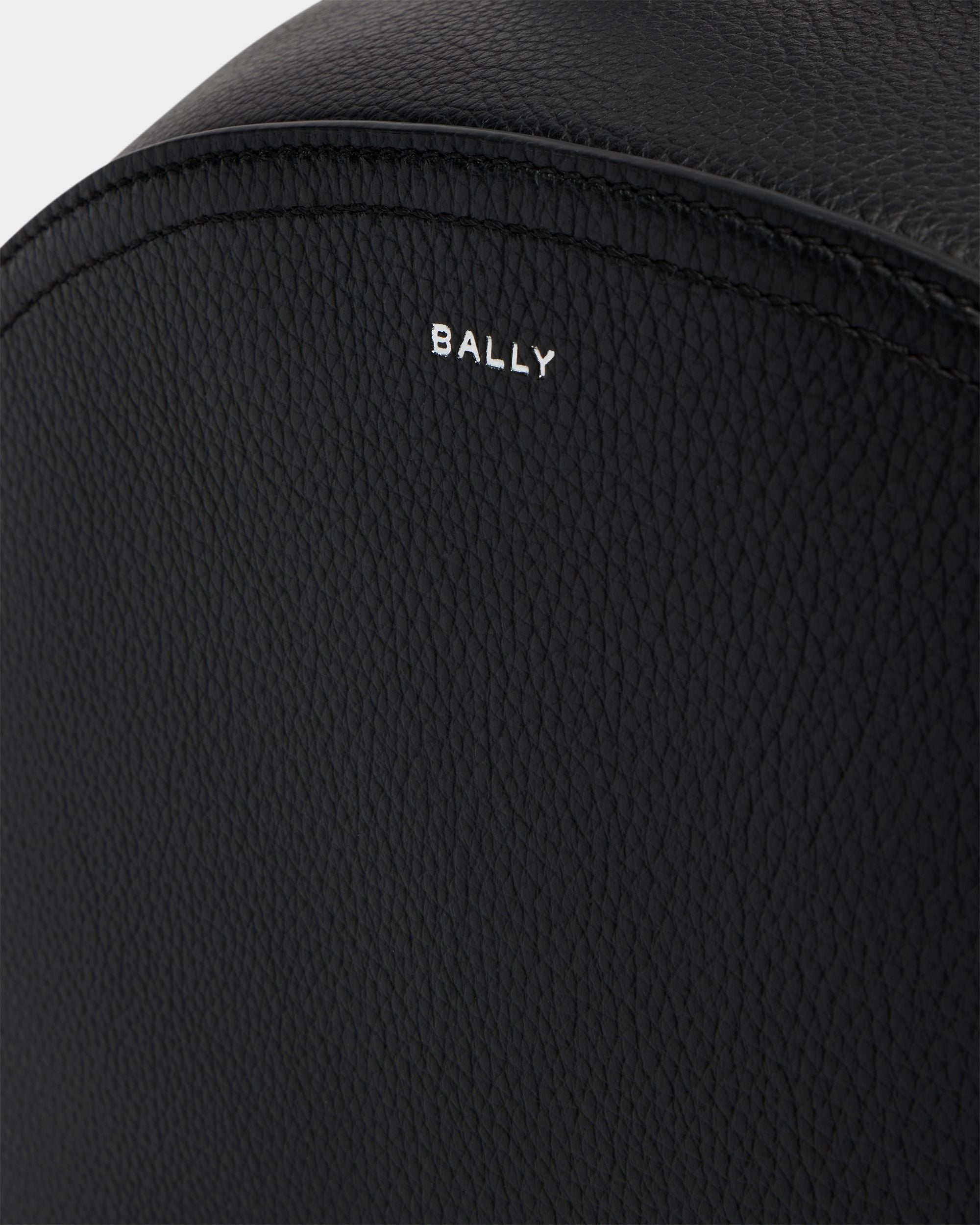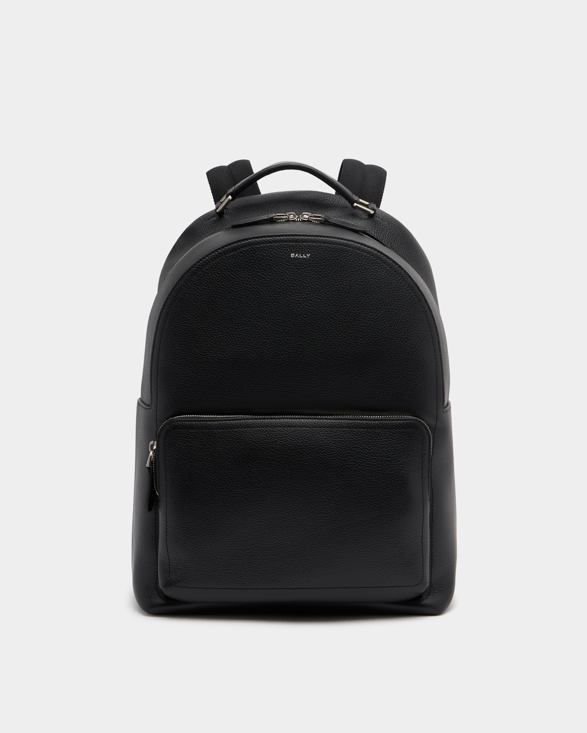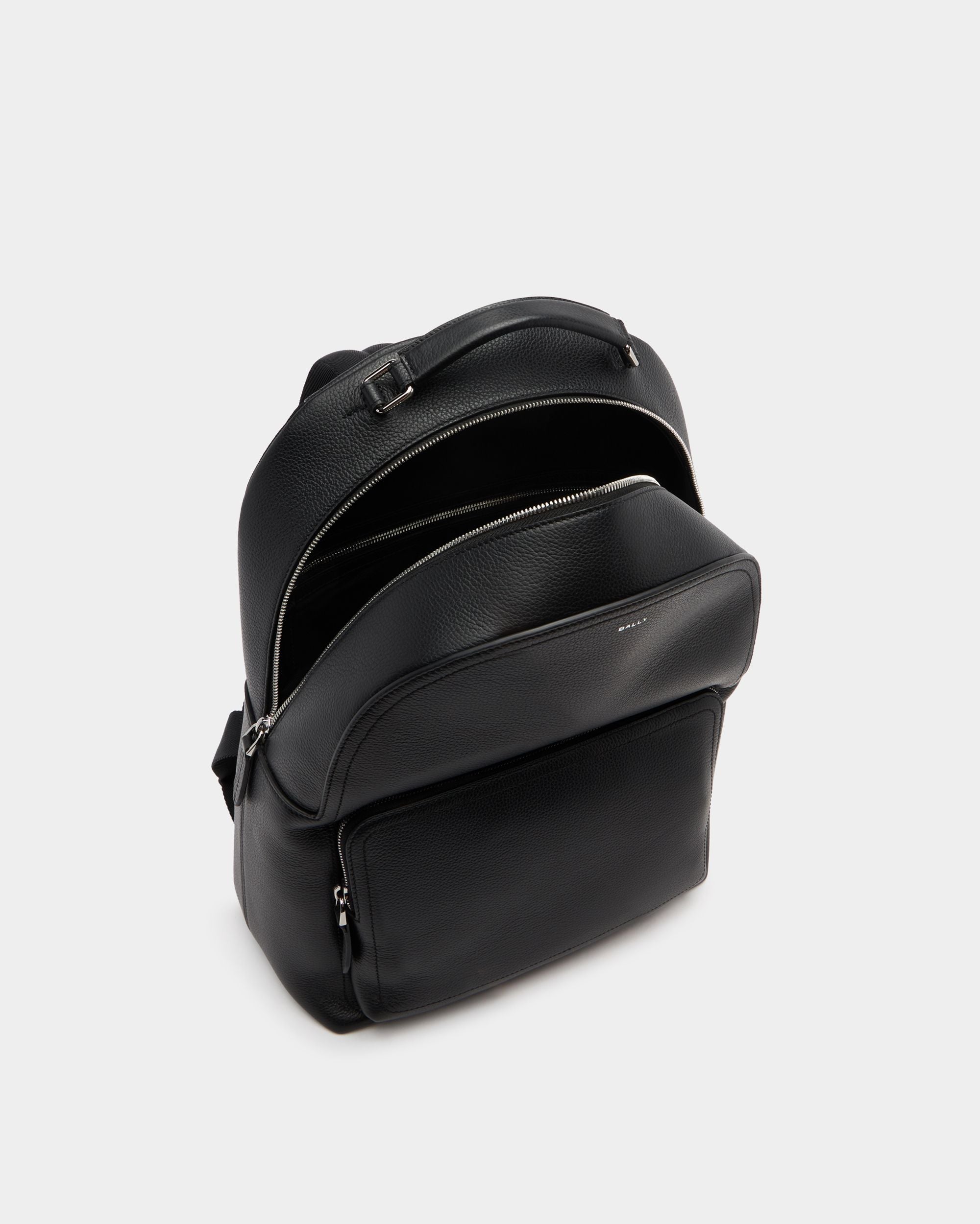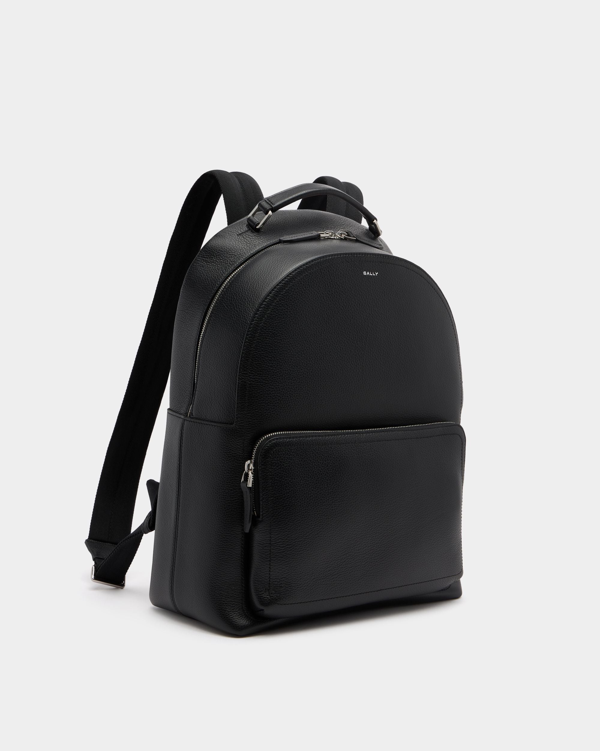 The Capitol backpack in black grained leather features an essential silhouette with a front pocket. top handle and a foil Bally logo.