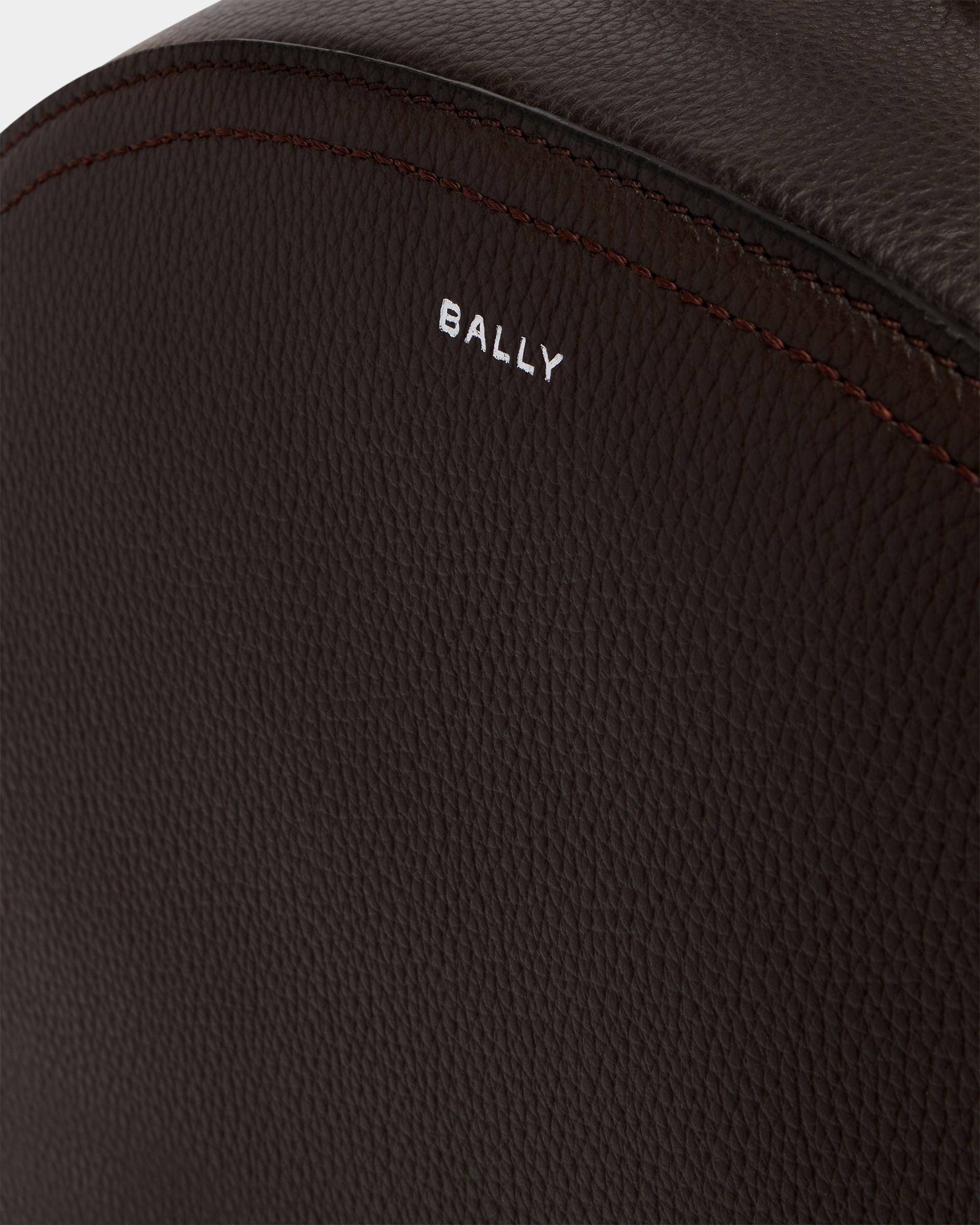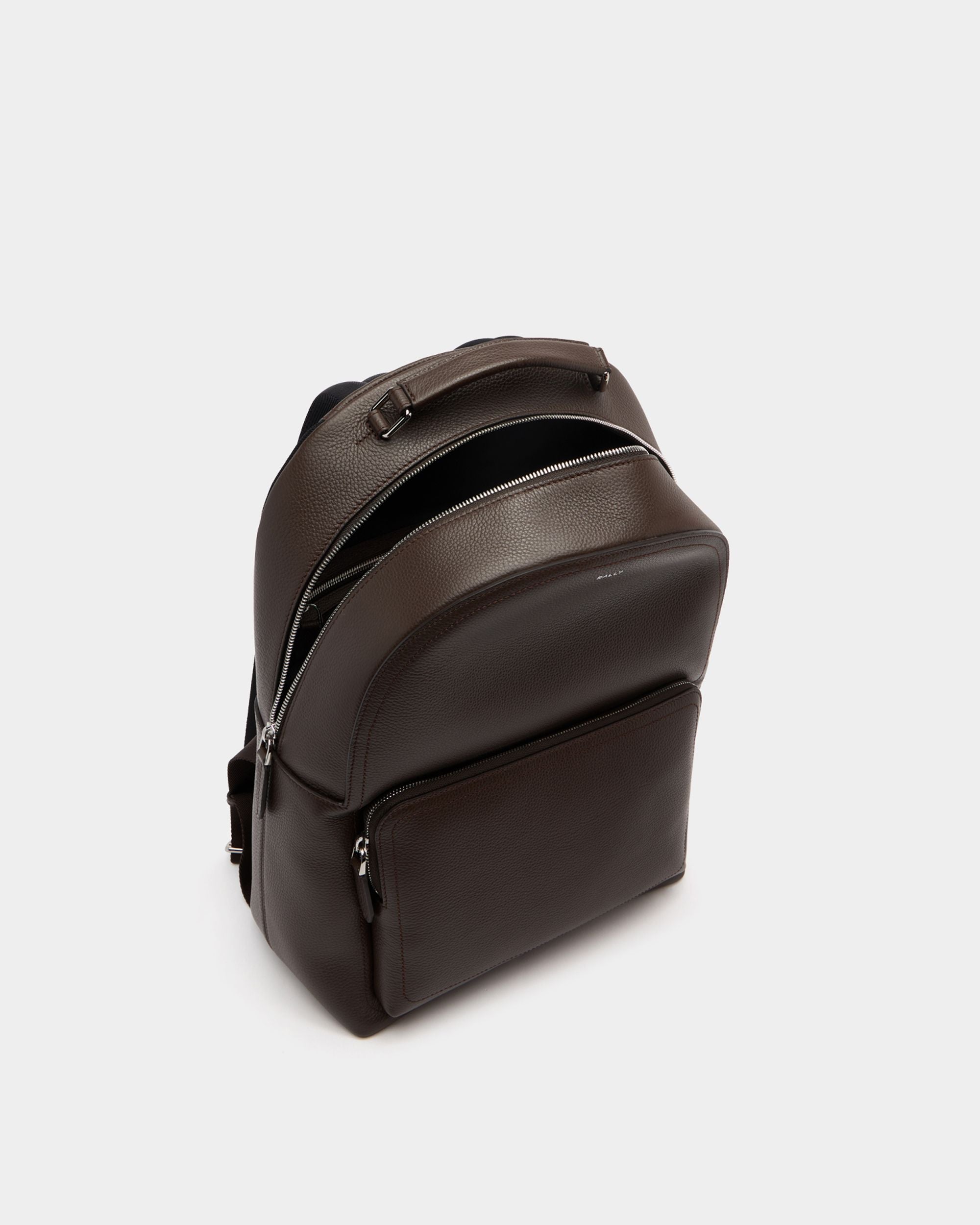 The Capitol backpack in Ebano grained leather features an essential silhouette with a front pocket. top handle and a foil Bally logo.