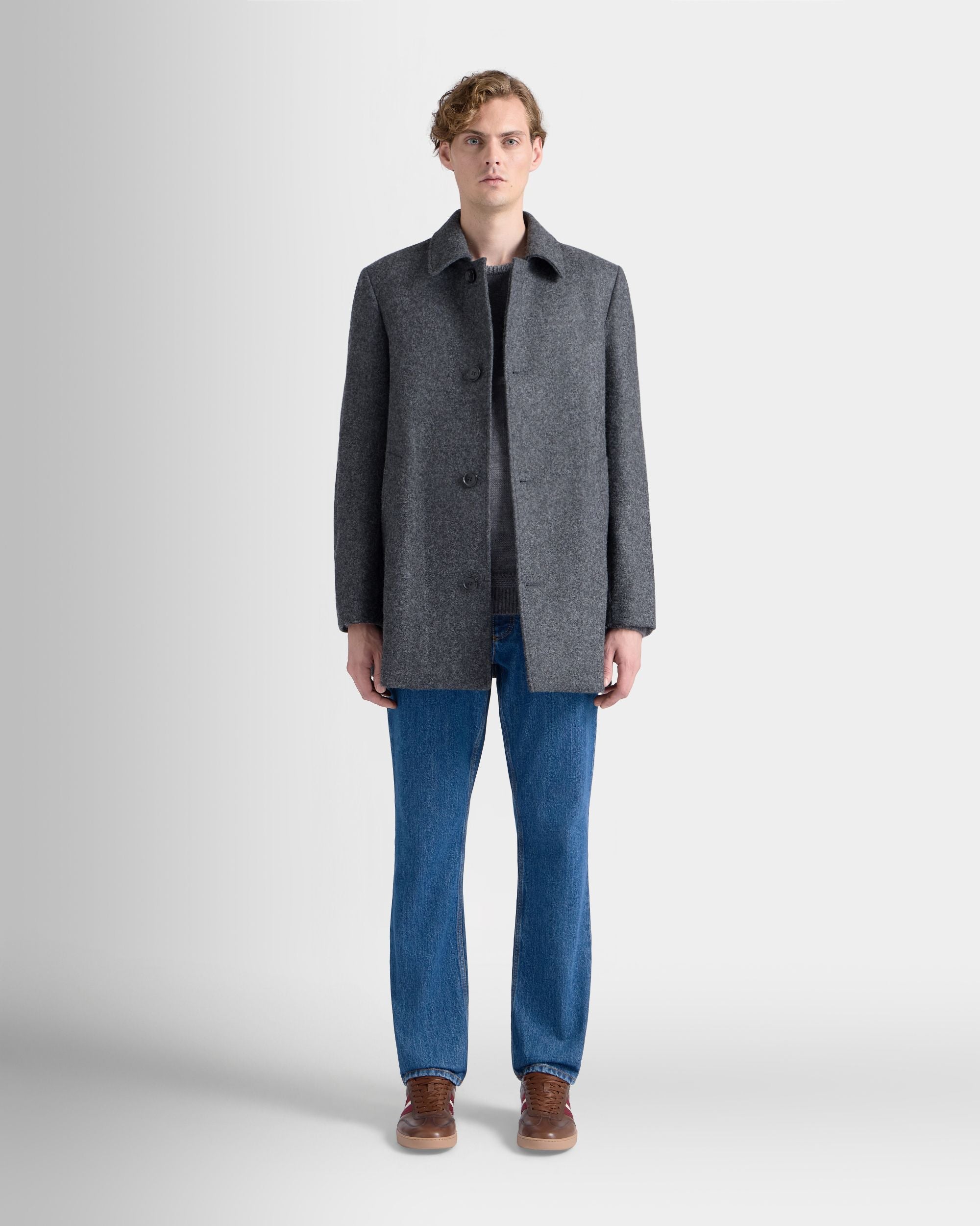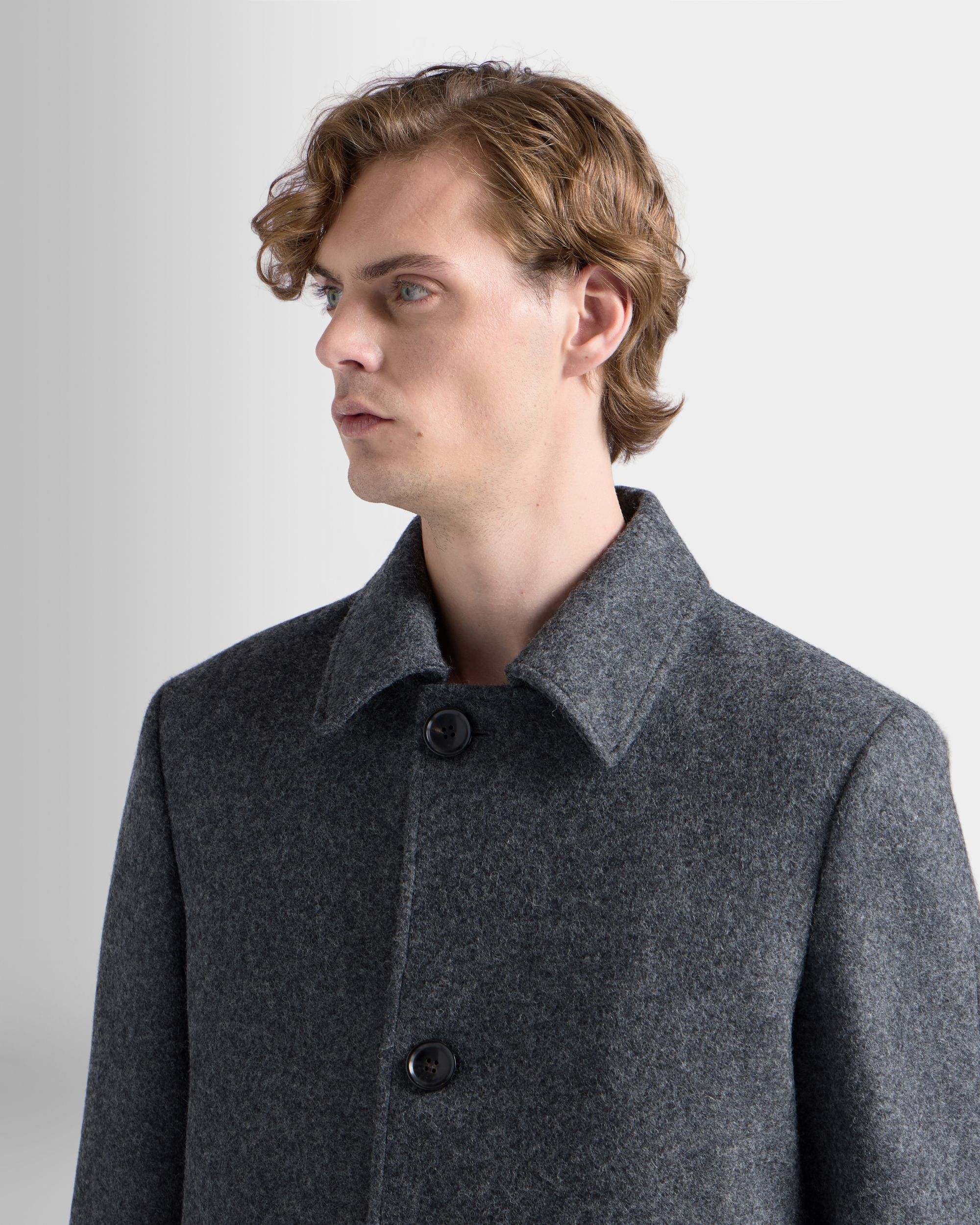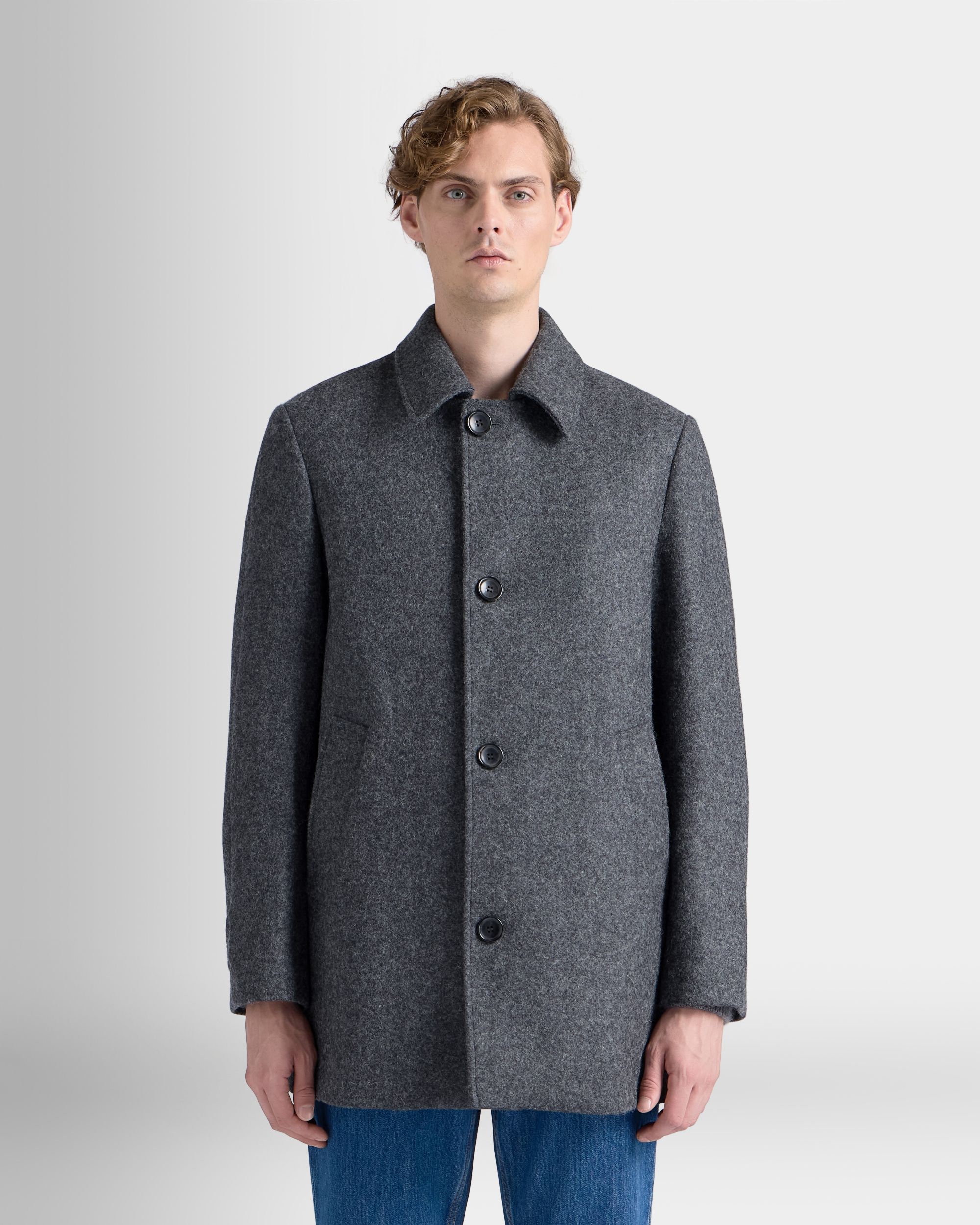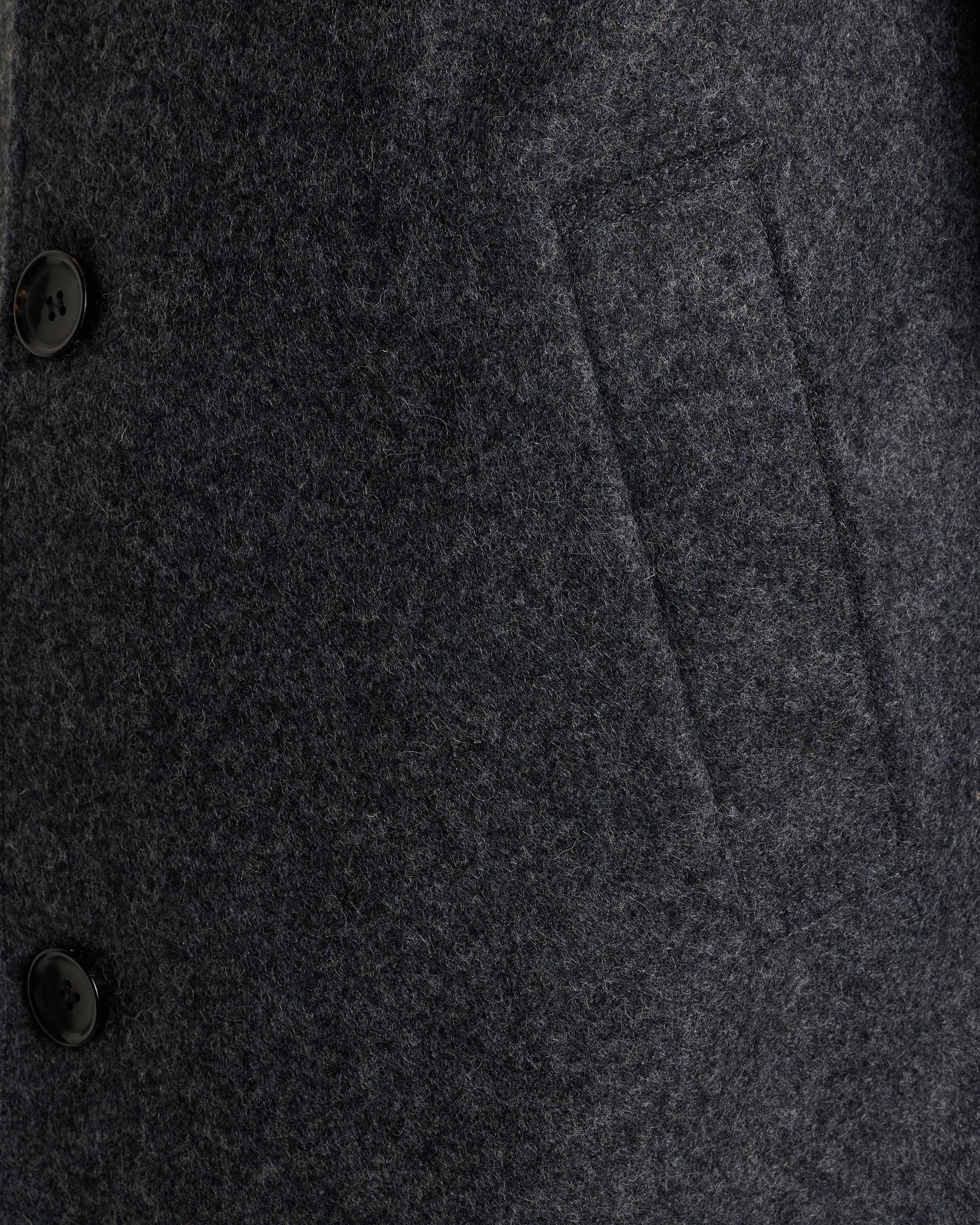 Single-breasted car coat in dark grey wool Melton with a m??lange finish. The linear silhouette of this coat is enriched by welted front pockets. a shirt collar and a Crest label on one cuff.