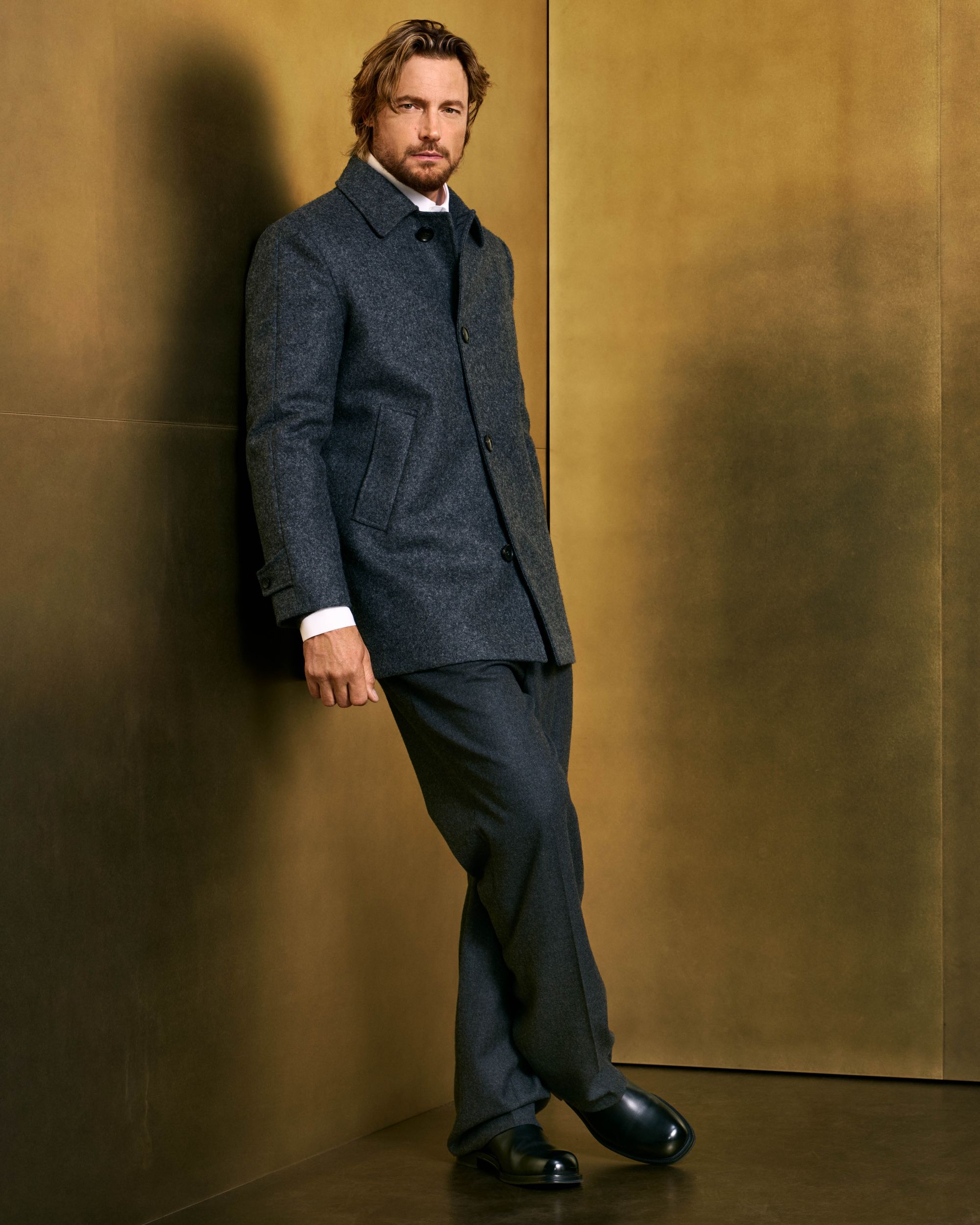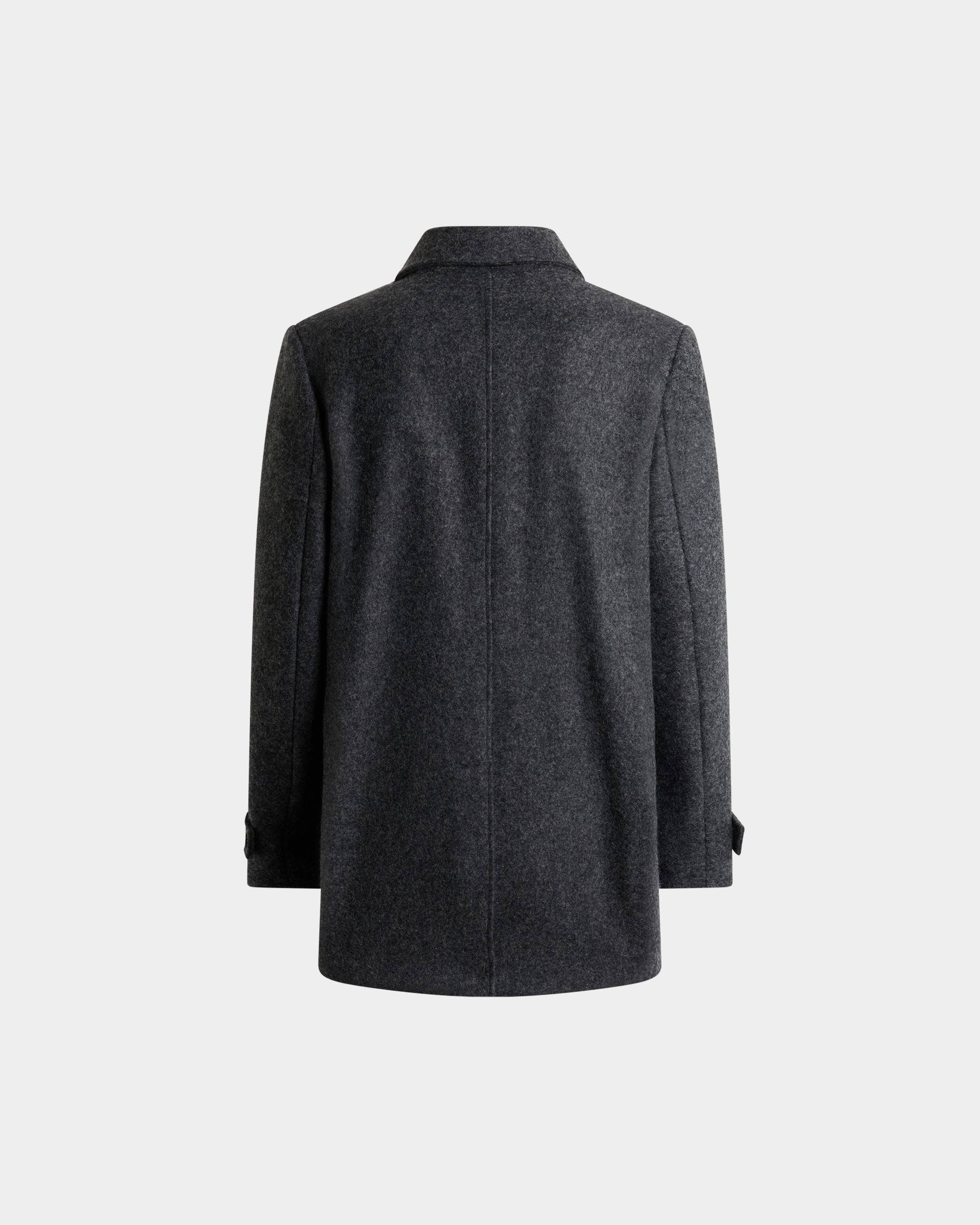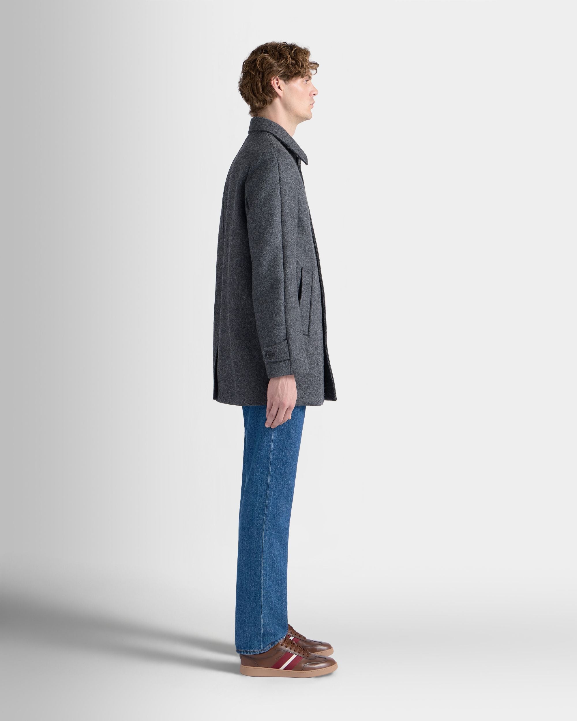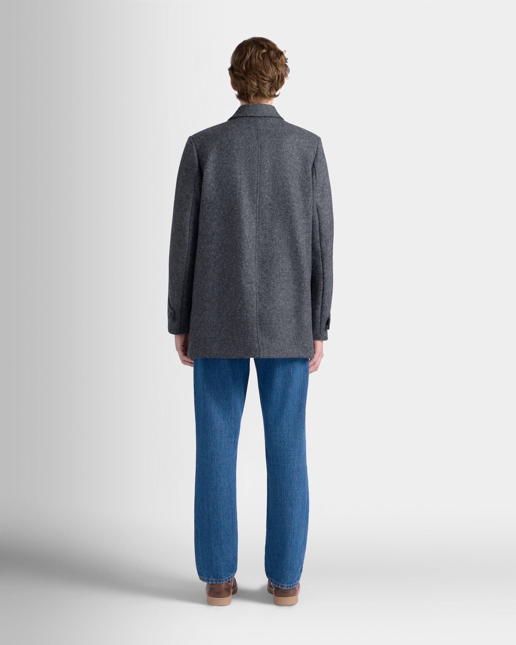 Single-breasted car coat in dark grey wool Melton with a m??lange finish. The linear silhouette of this coat is enriched by welted front pockets. a shirt collar and a Crest label on one cuff.