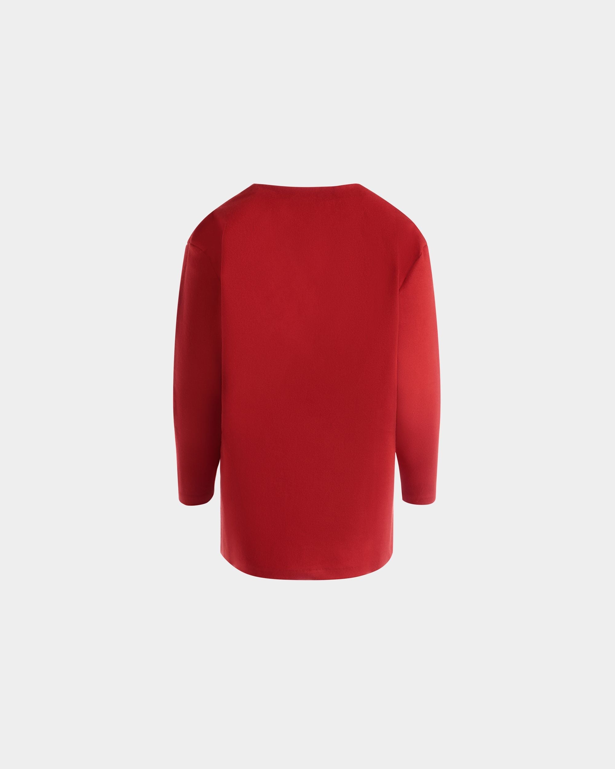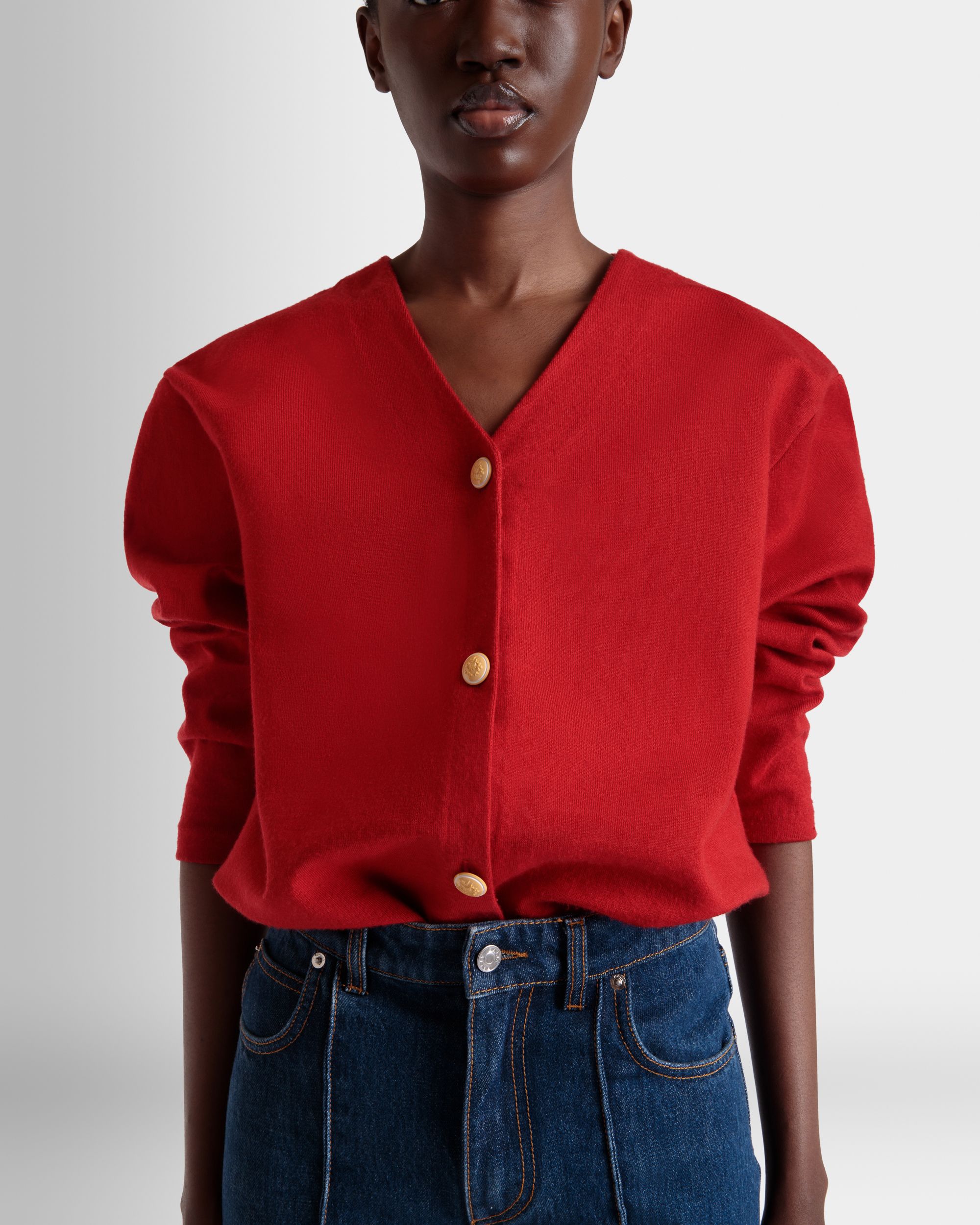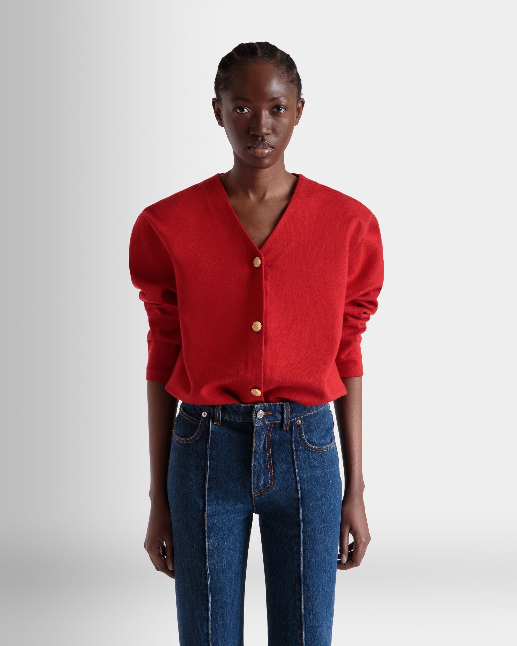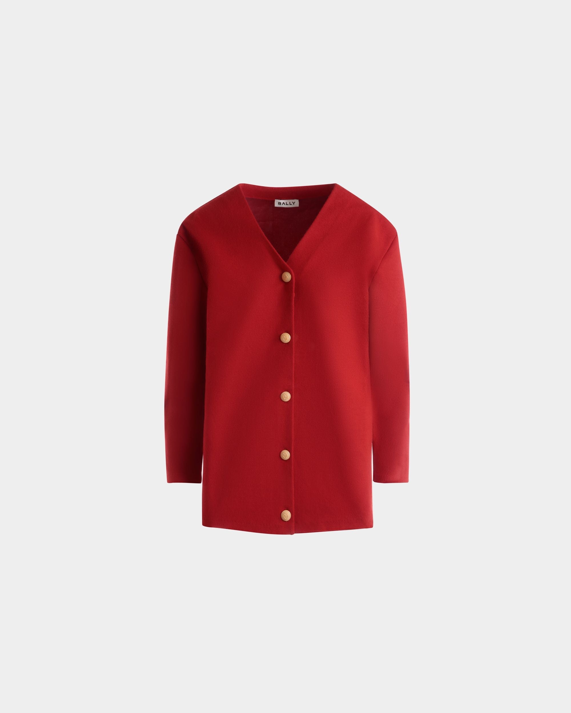 Red cardigan in a fine blend of wool and silk. with five galalith buttons engraved with the Bally Crest.