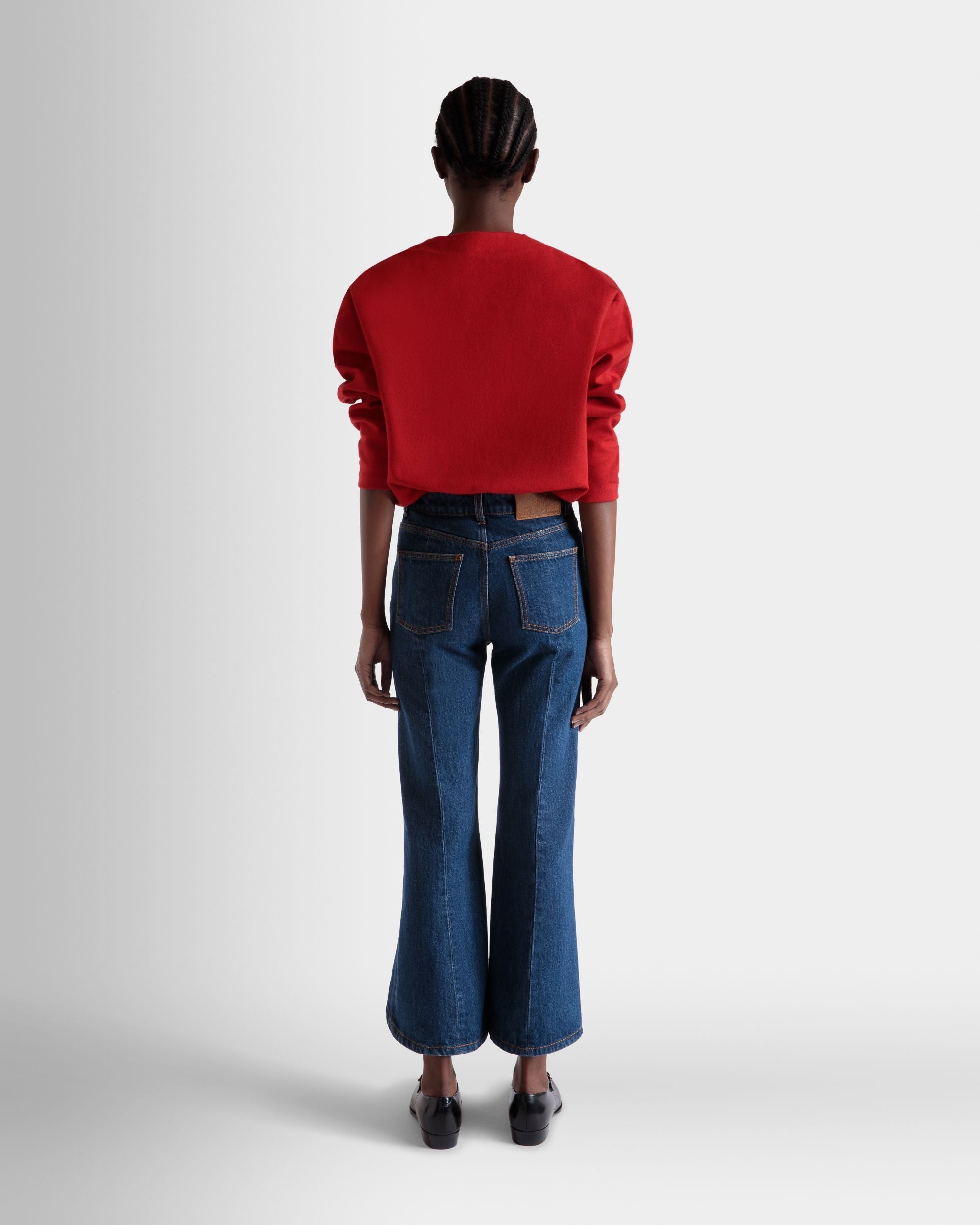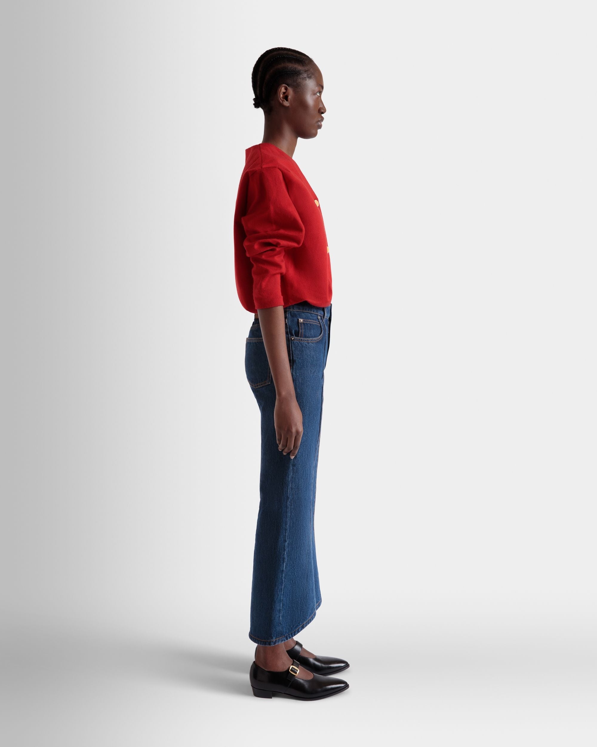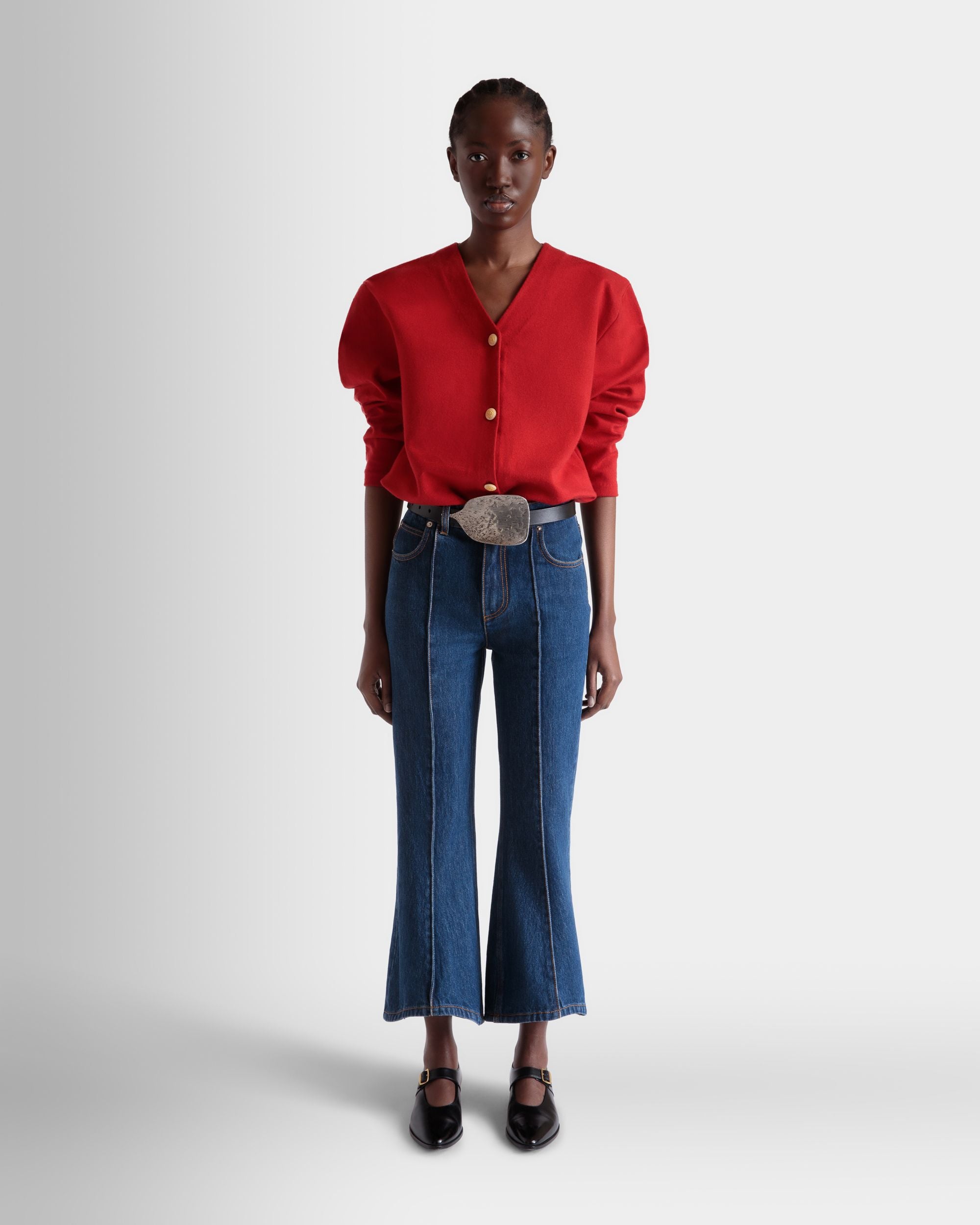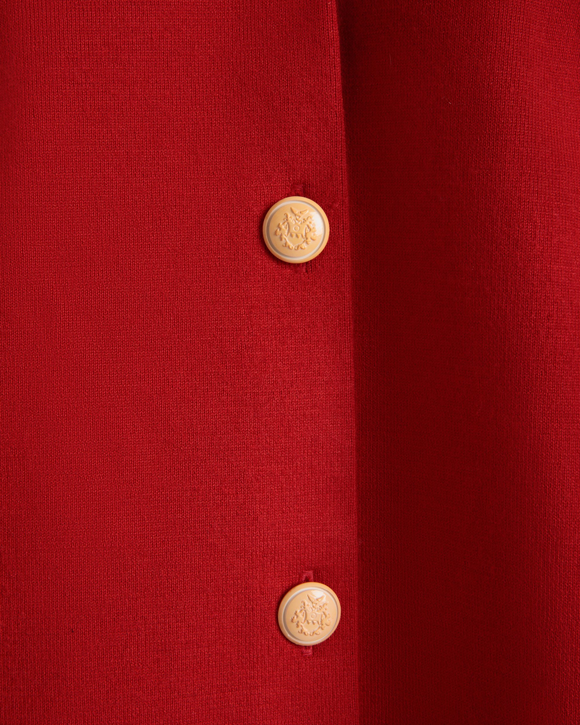 Red cardigan in a fine blend of wool and silk. with five galalith buttons engraved with the Bally Crest.