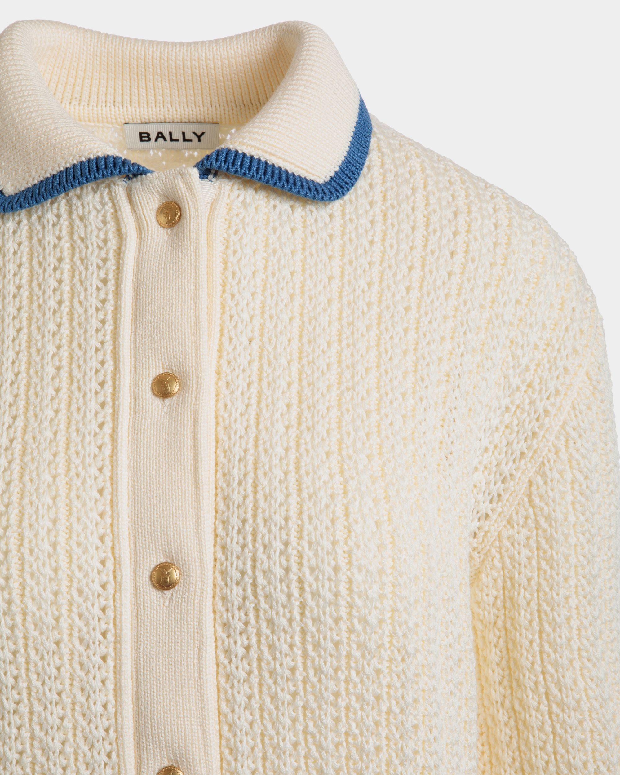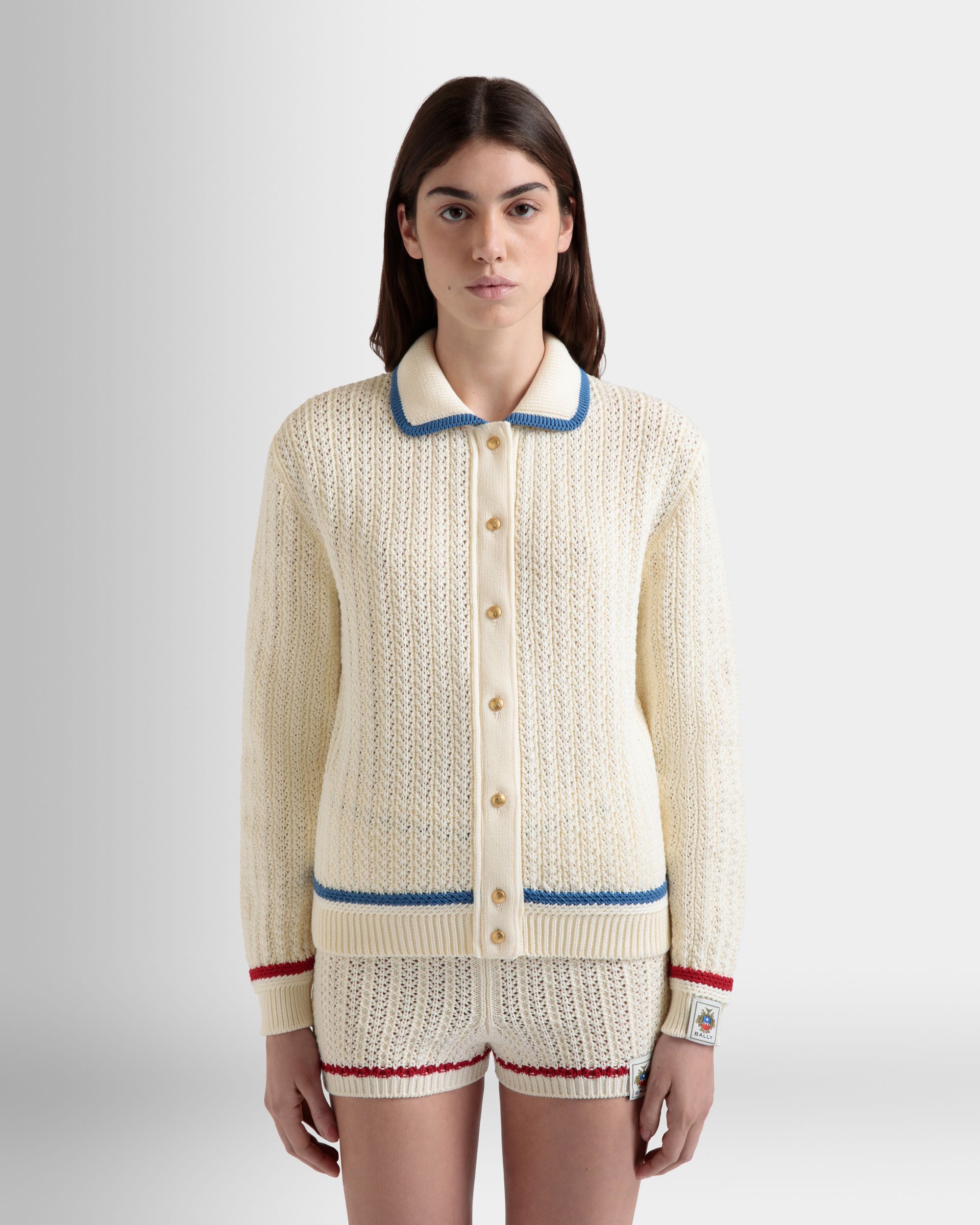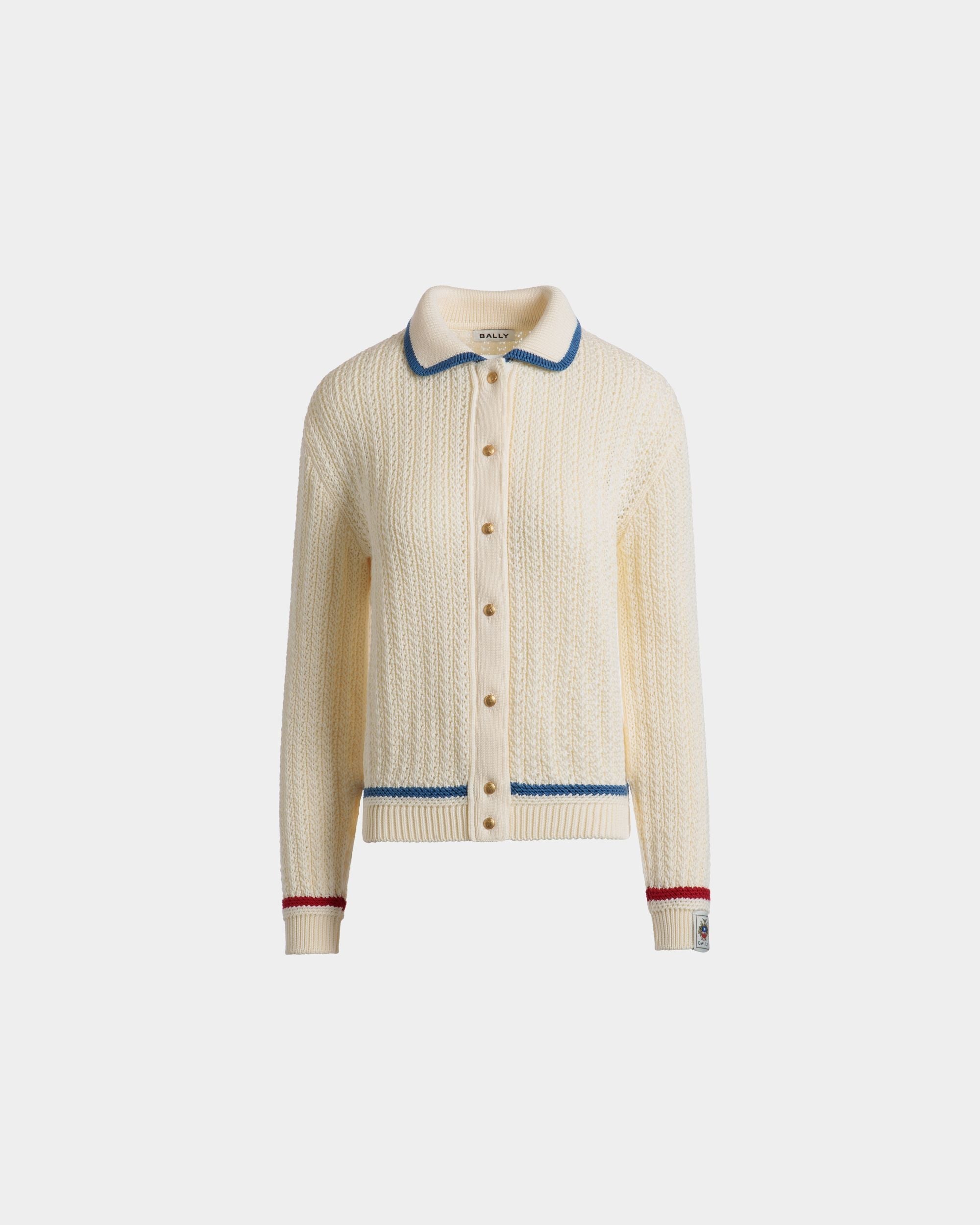 In ajour-knit cotton. this ivory cardigan is finished by blue and red stripes on the collar and cuffs. A Bally Crest label trims the left wrist.