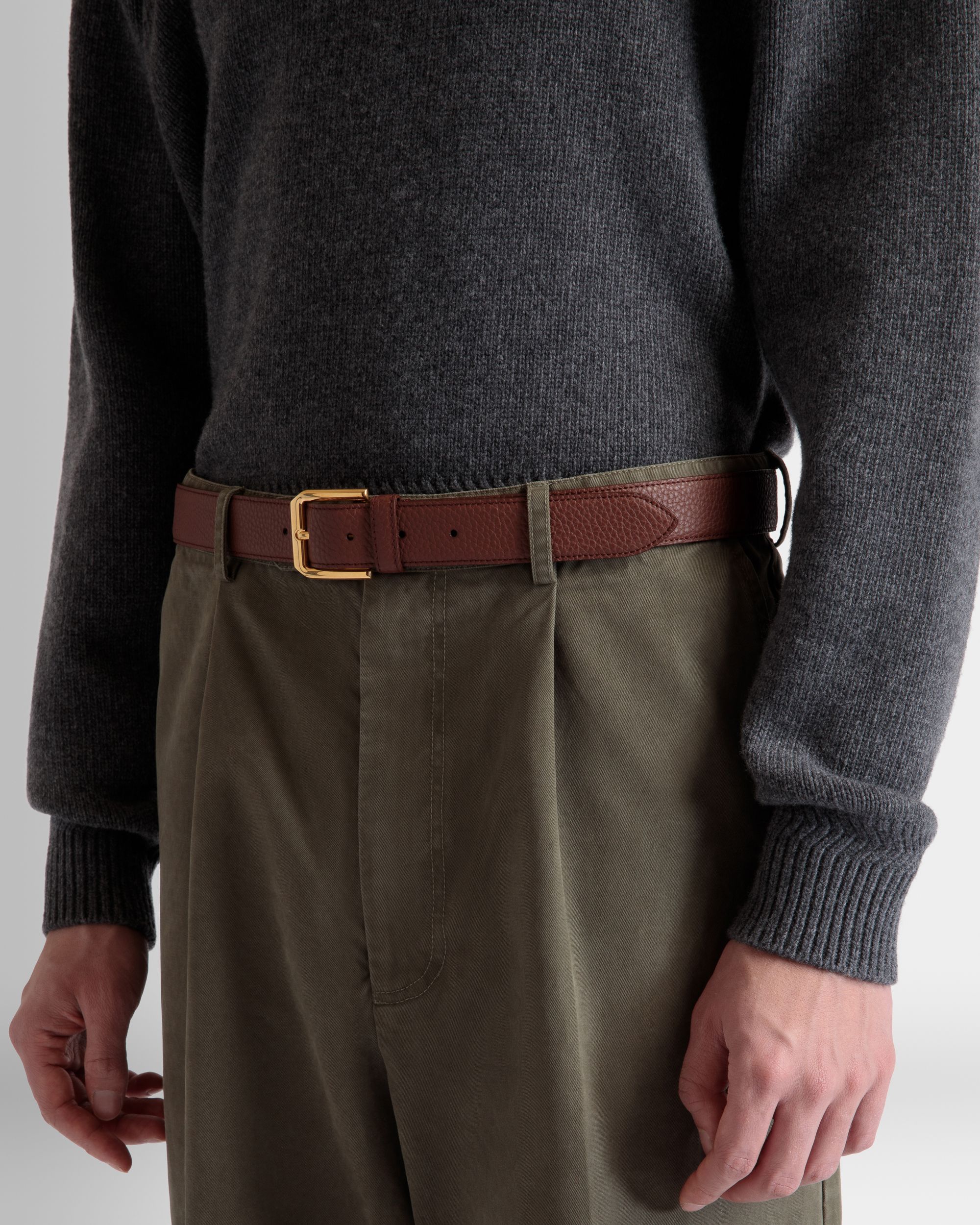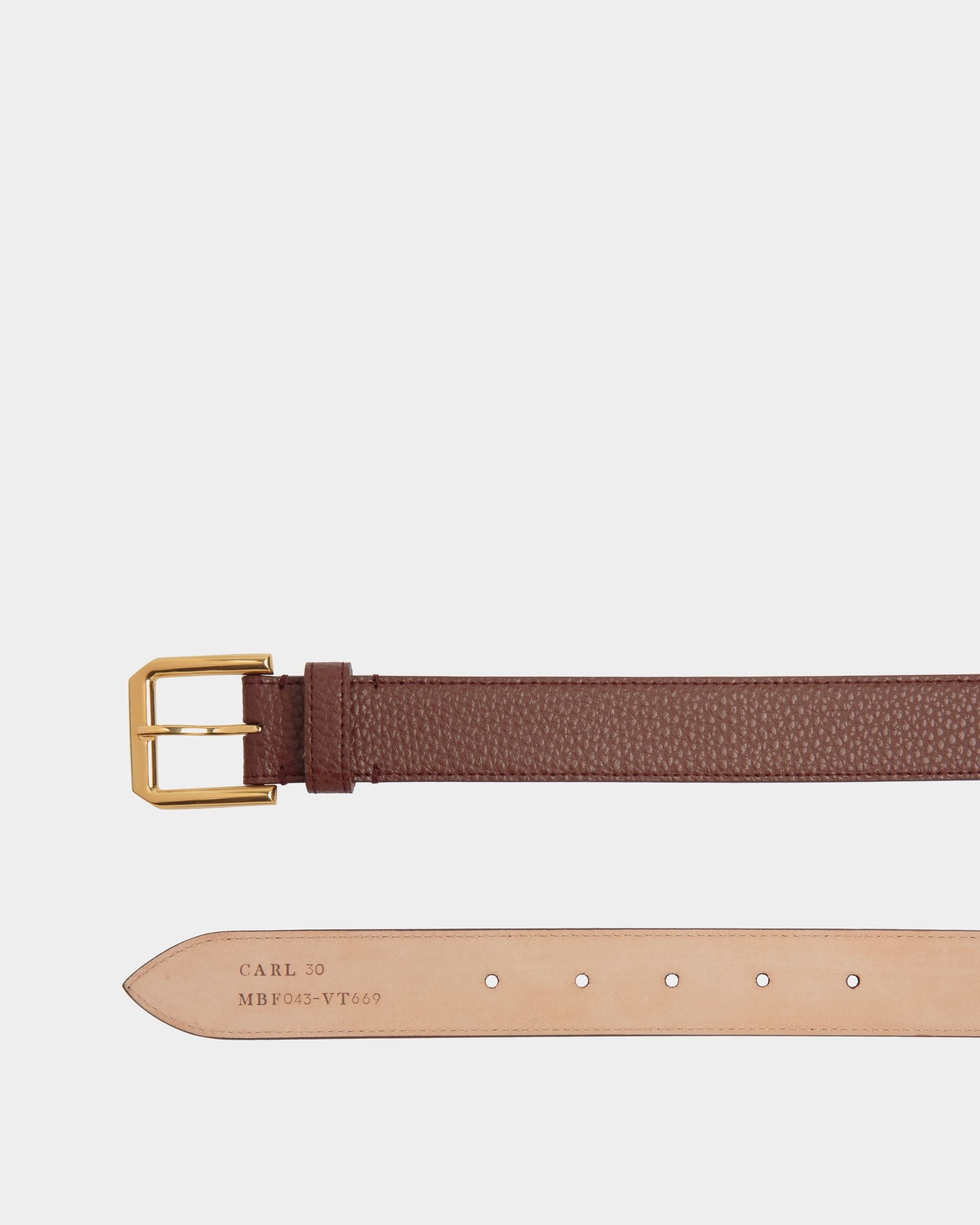 Simple and elegant. the Carl 30mm belt in grained leather embodies Bally leatherworking traditions. Fixed in its length. the front of this belt is secured by a hammered metal buckle.
