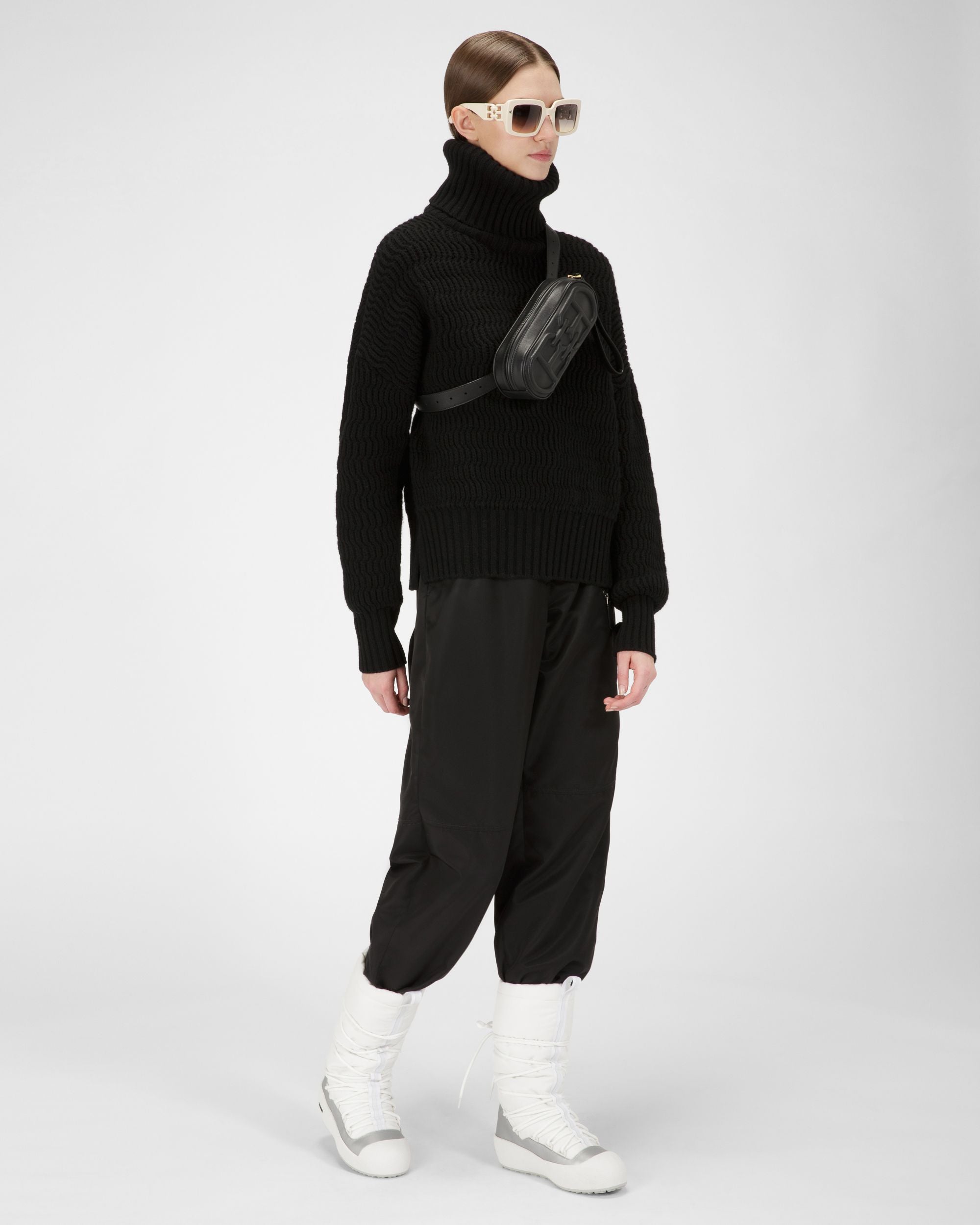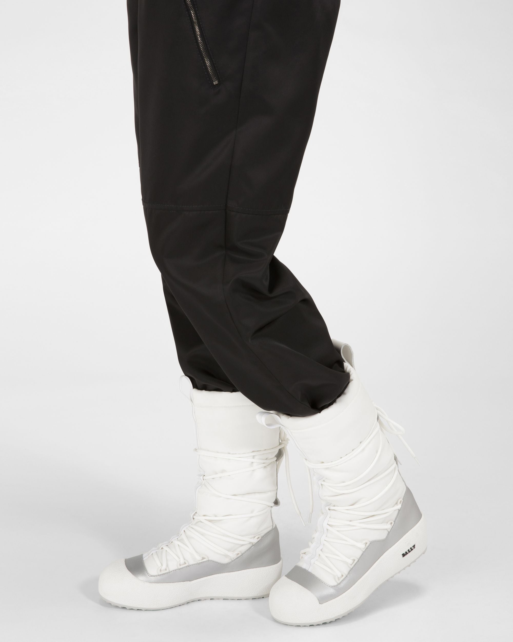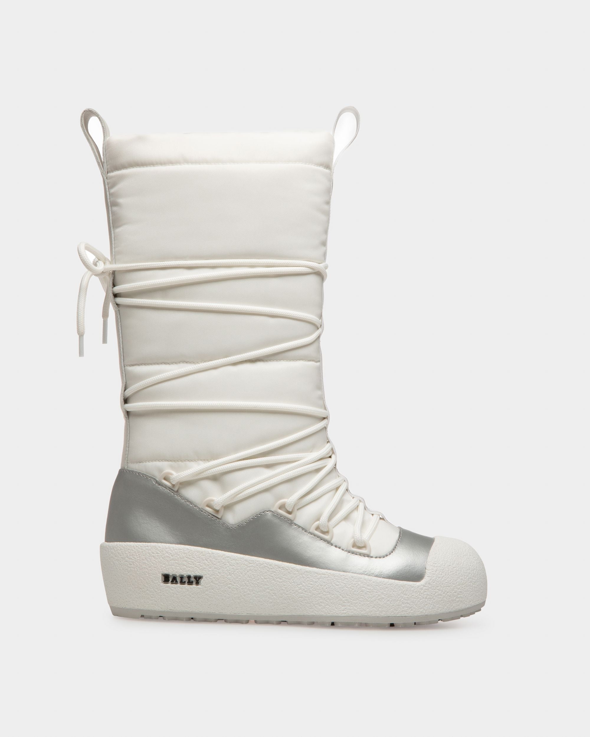 The Bally Curling collection was first introduced in 1950 and continues to build upon years of craftsmanship whilst implementing a contemporary aesthetic and the latest technology. An elegant snow shoe. the Cathye boot is made of recycled nylon in white. with silver rubber-coated leather details and a rubber toecap and sole. The ultimate winter design. it is lined with a shearling fur certified by the Leather Working Group (LWG) as adhering to environmental best practices during its production. The rubber sole features VibramĀ® Arctic Grip technology engineered to provide maximum grip on cold. iced or snowy surfaces.