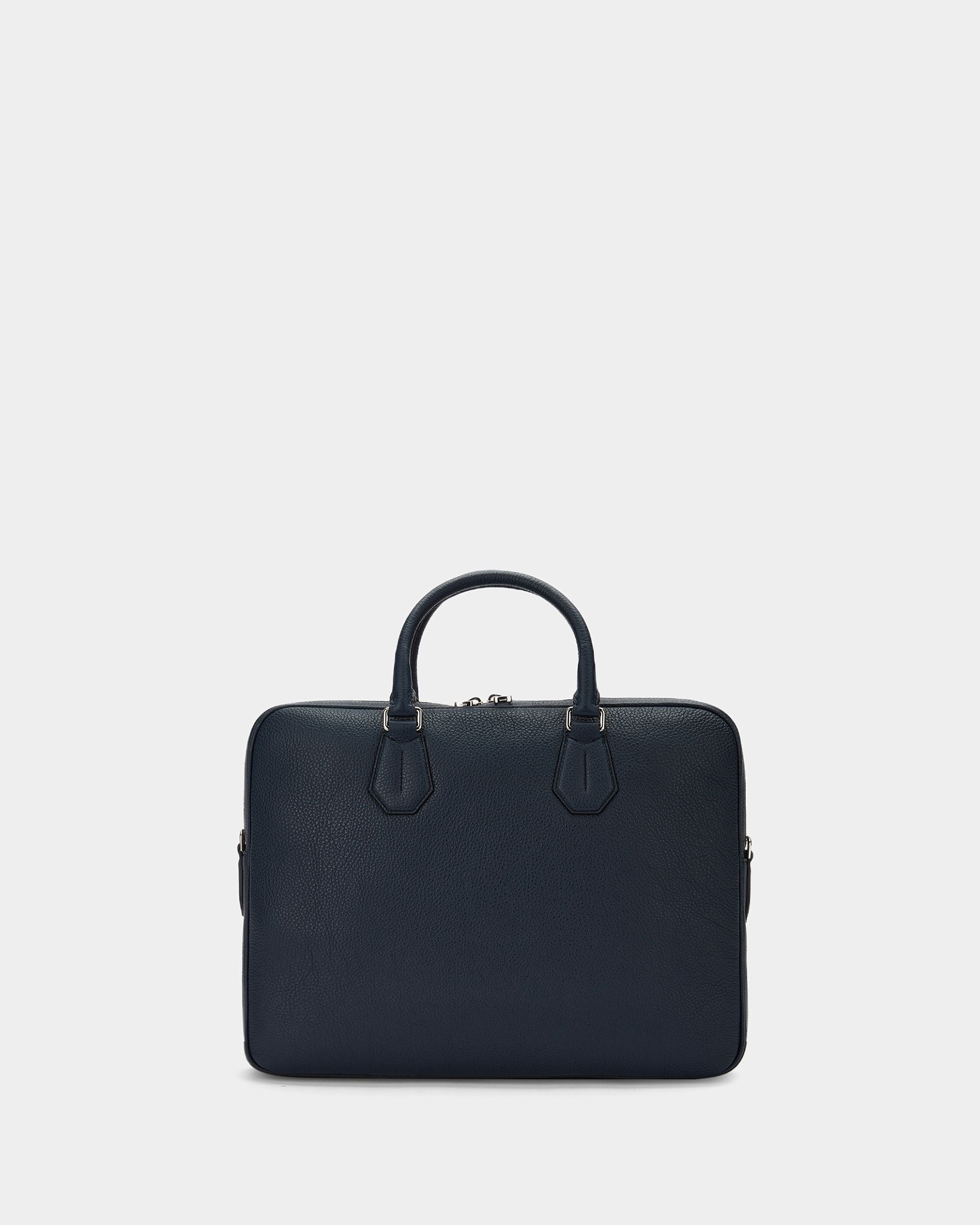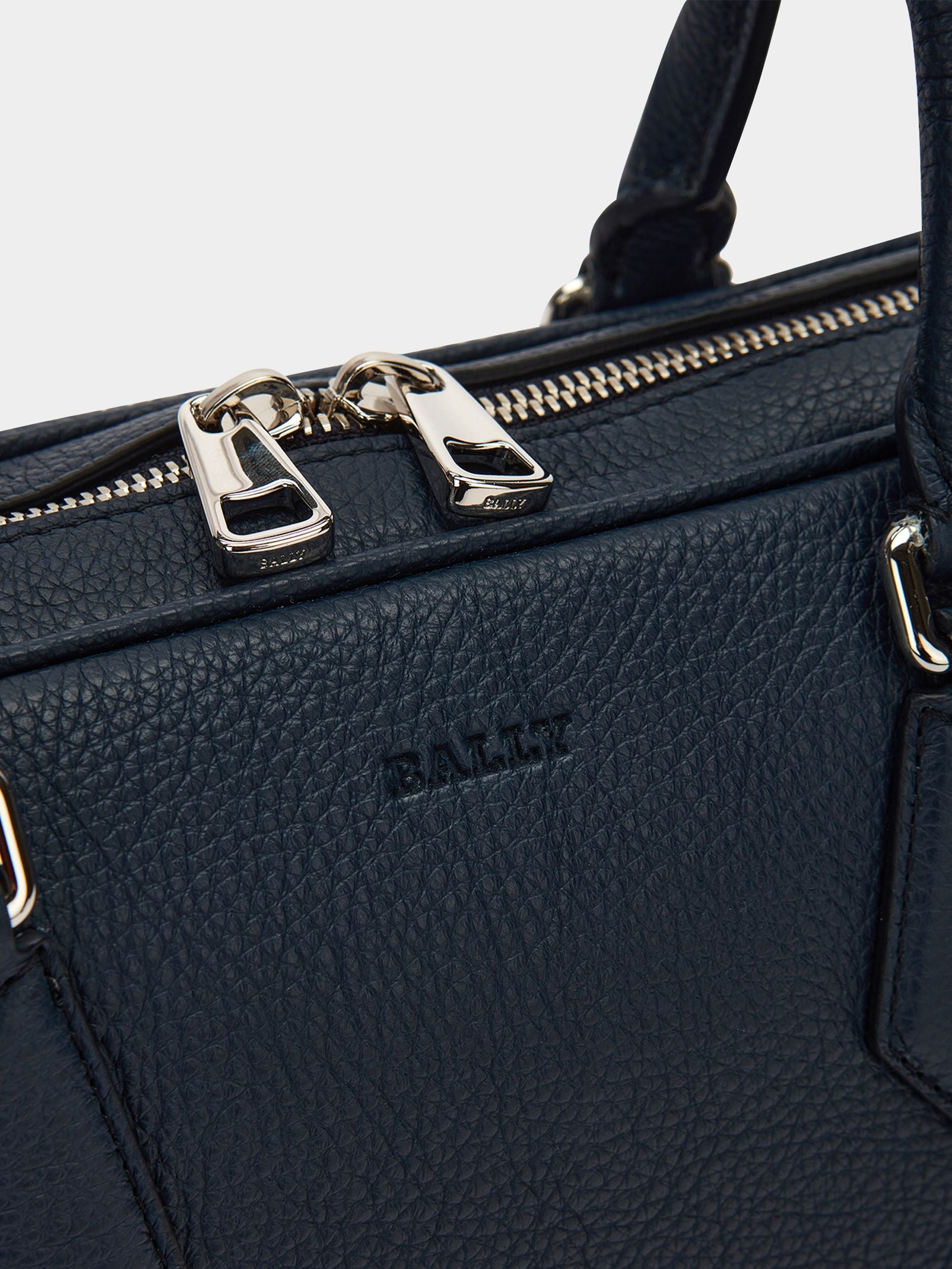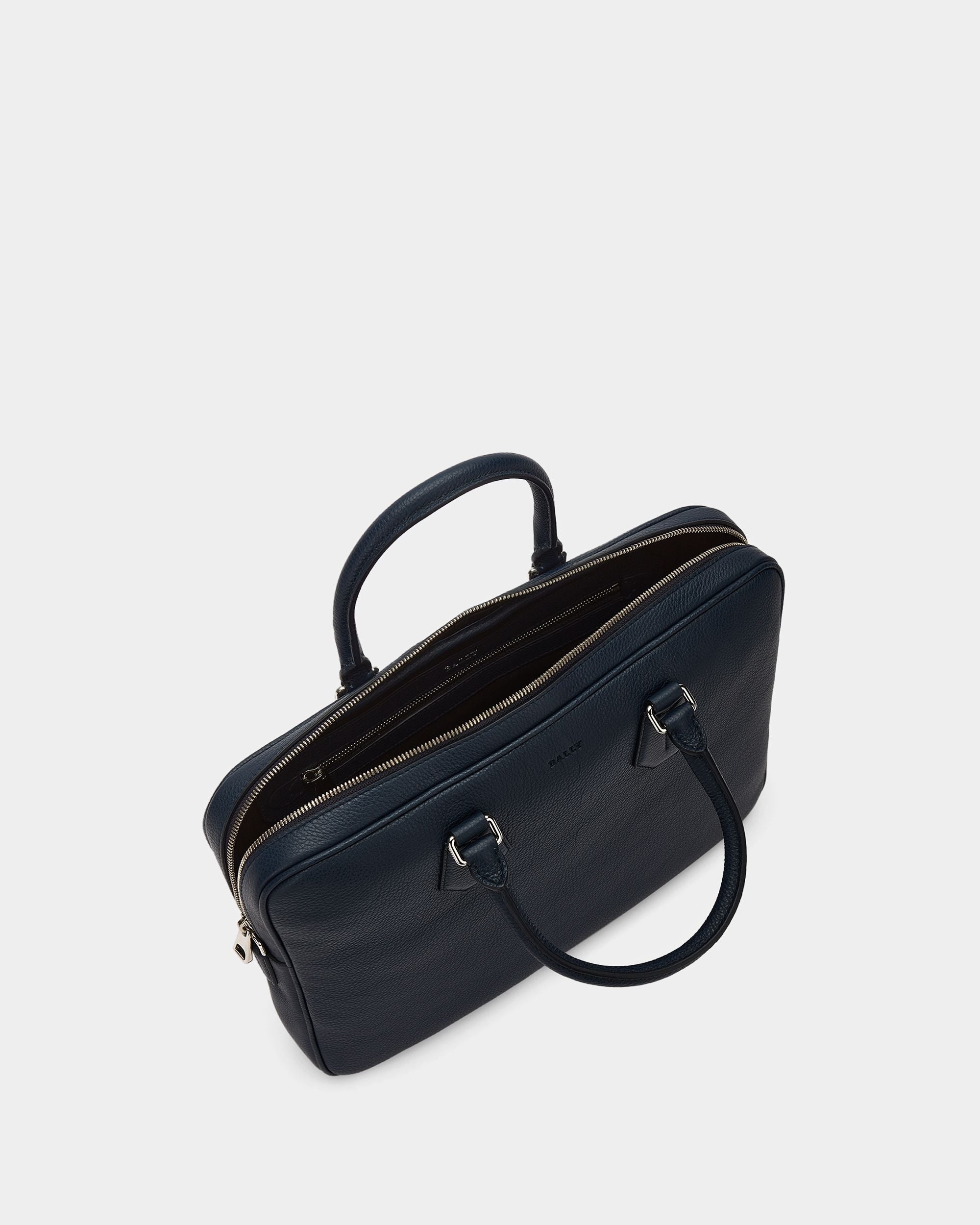 The City business bag is designed for effortless organization. Its essential silhouette in navy blue grained calfskin is enriched with a small Bally logo to the front.