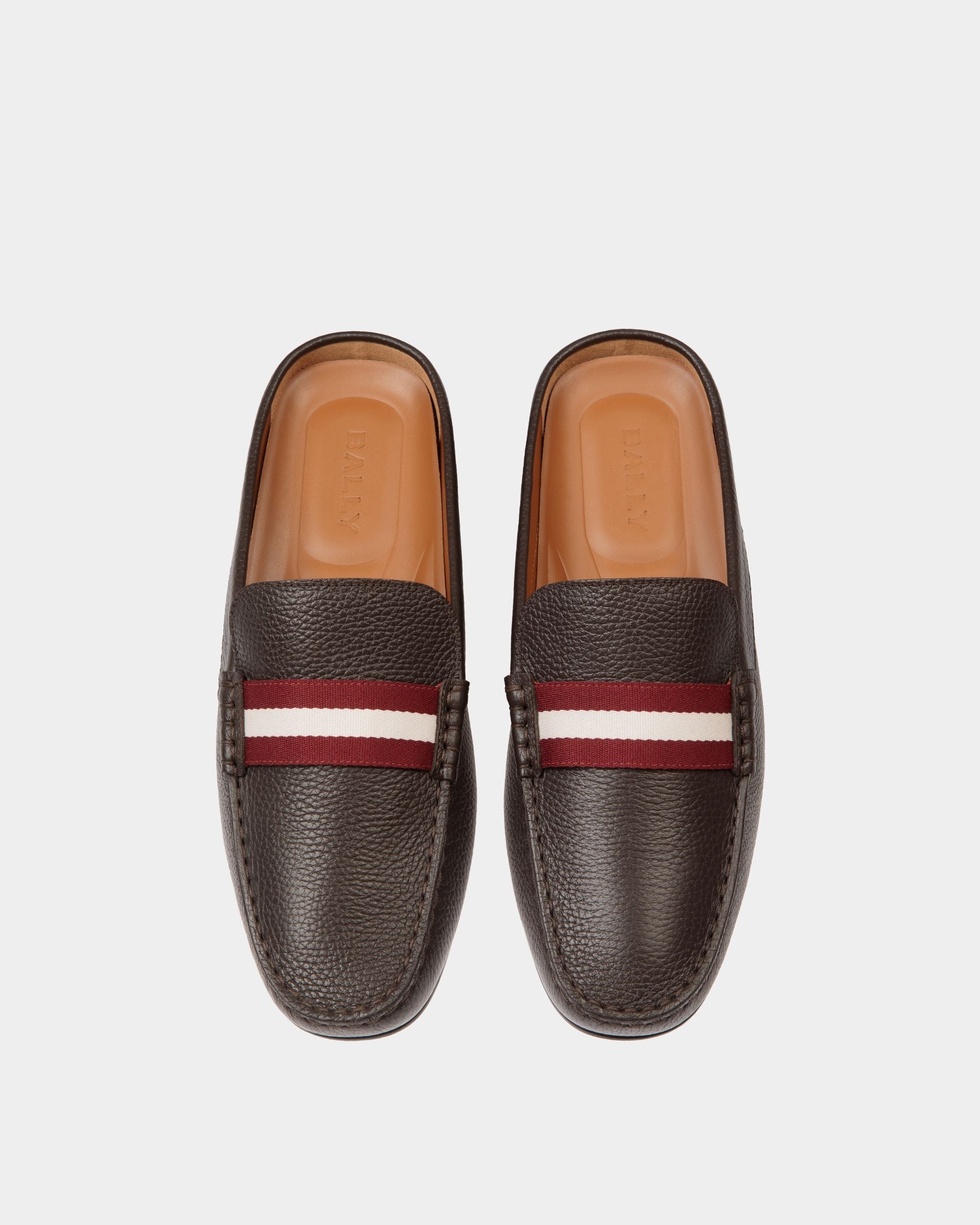 The Clay driver in Ebano grained leather is made for comfort. with a mule silhouette and a split rubber sole. A Bally Ribbon in red and white crosses the top.