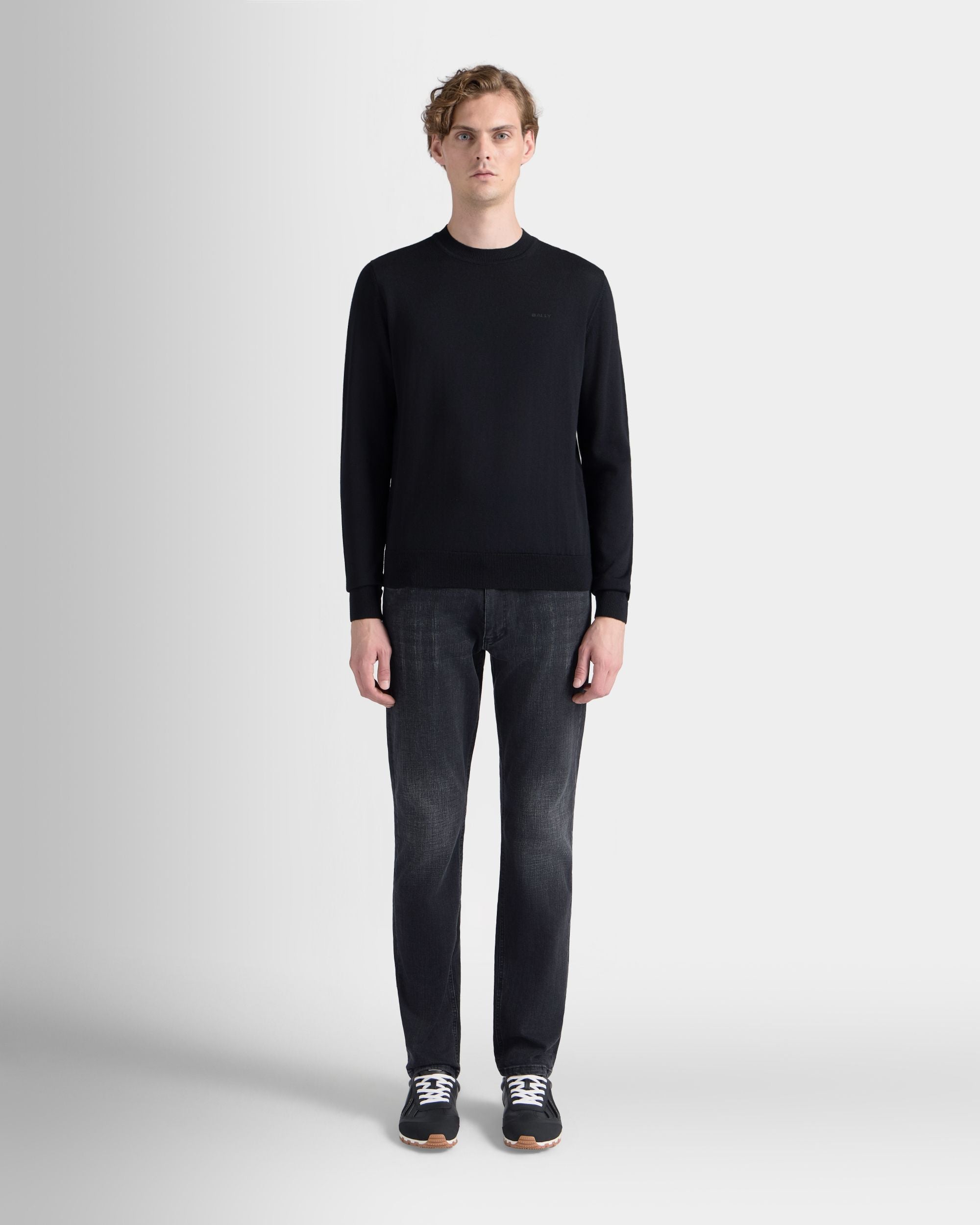 Crewneck sweater in black wool with an embroidered Bally logo on the left chest.