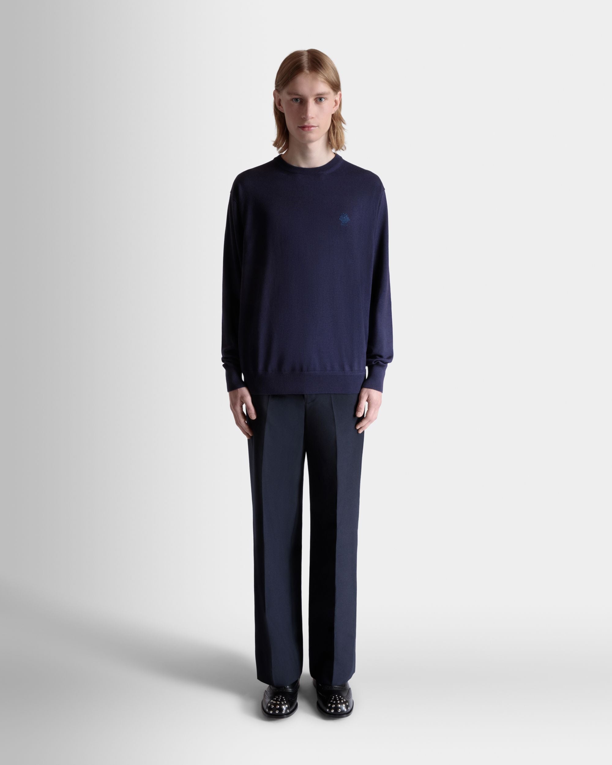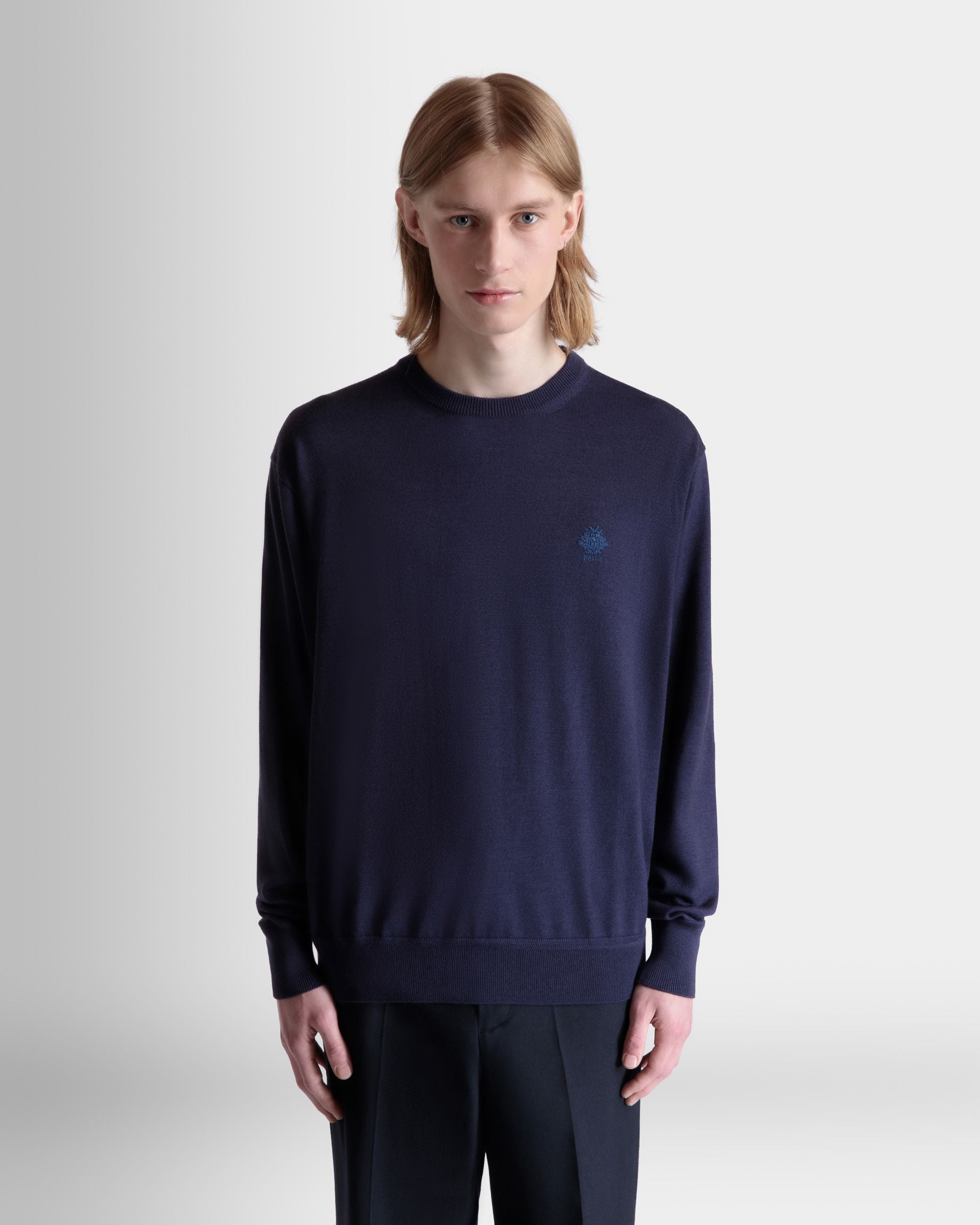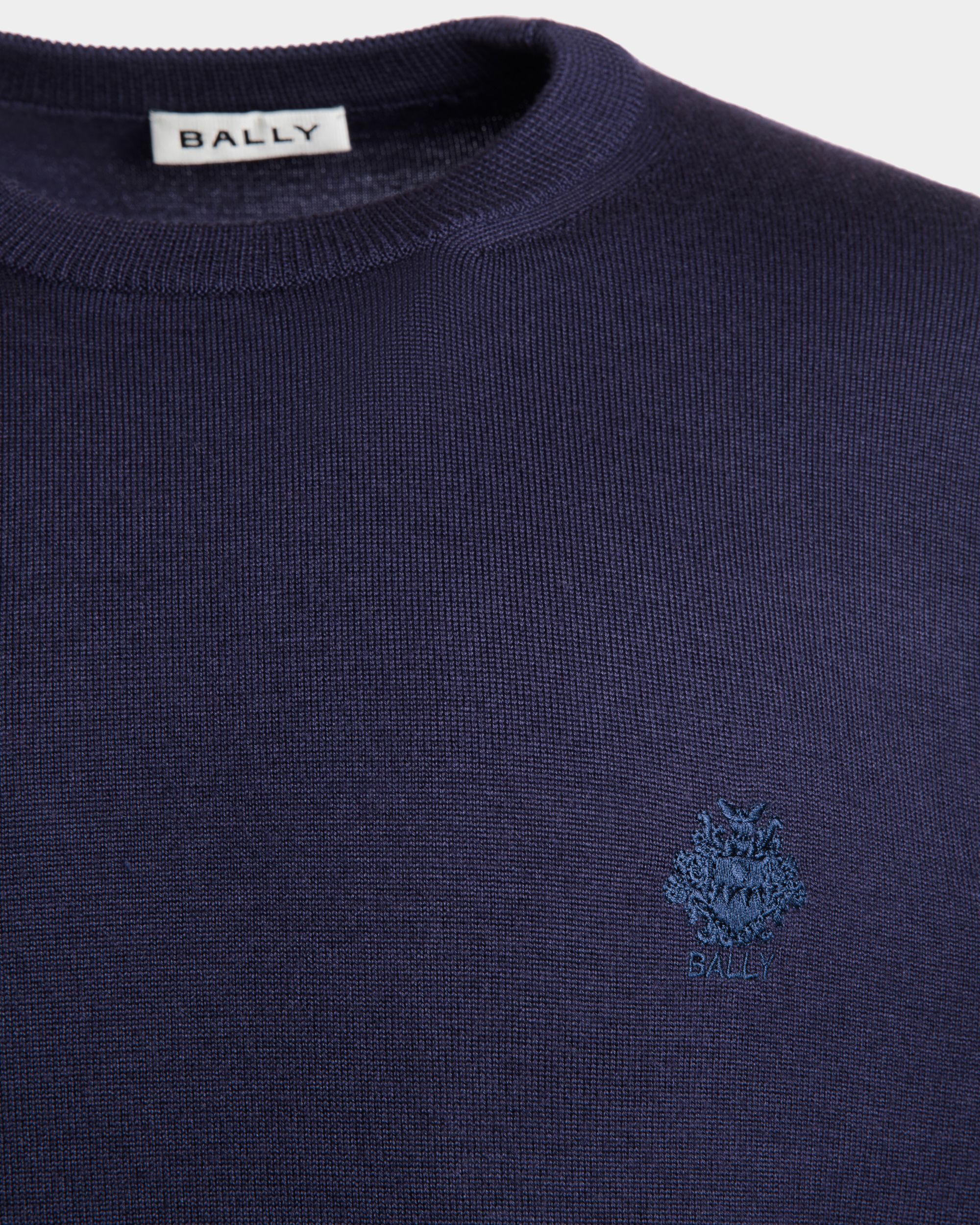 This navy blue sweater blends finest merino wool. cashmere and silk in a 14-gauge stockinette stitch with a soft. smooth feel. A Bally Crest is embroidered on the left chest.